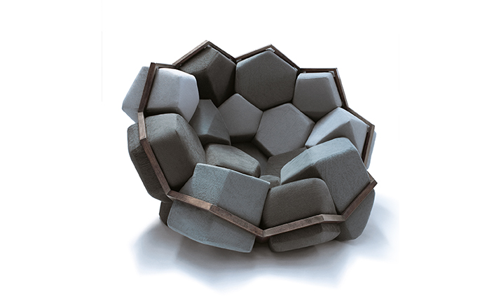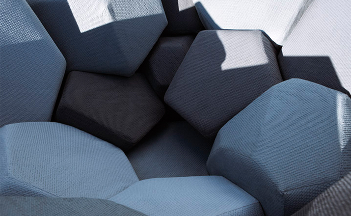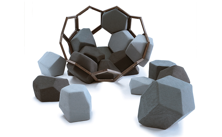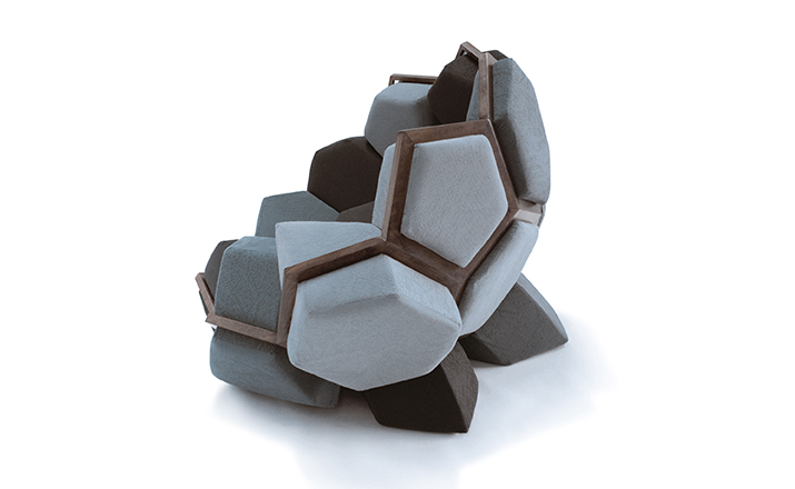 米兰的Ctrlzak设计工作室与Davide Barzaghi联手设计了一款几何风扶手椅Quartz(石英扶手椅)。很多创意的灵感都来自自然与几何结构的排列组合,Quartz就是其中典型的代表。它的整体结构由一个五边形和六边形的二位结构组成,就像钻石的结构那样,很自然的过度到一个三维结构。每一个五边形和六边形的组成部分都套上彩色环保面料做成的大小合宜的套子,所以这个几何风的扶手椅也别有一番野外的自然风情。该椅由十二面体的模块与带有六边形镂空图案的框架组成,而框架的整体结构则与天然结晶的形态相同。Quartz椅的各个软体模块表面由同一色系多种颜色的生态面料包覆,使其最终的外观看上去更像是自然界中的某种小生境,而非一把普通的座椅。比起座椅来,这款有趣的Quartz似乎更像是一件超大型的智力玩具——你必须把各个模块填放到合适的空格中去,在给你带来舒适的同时,也带来无尽趣味。