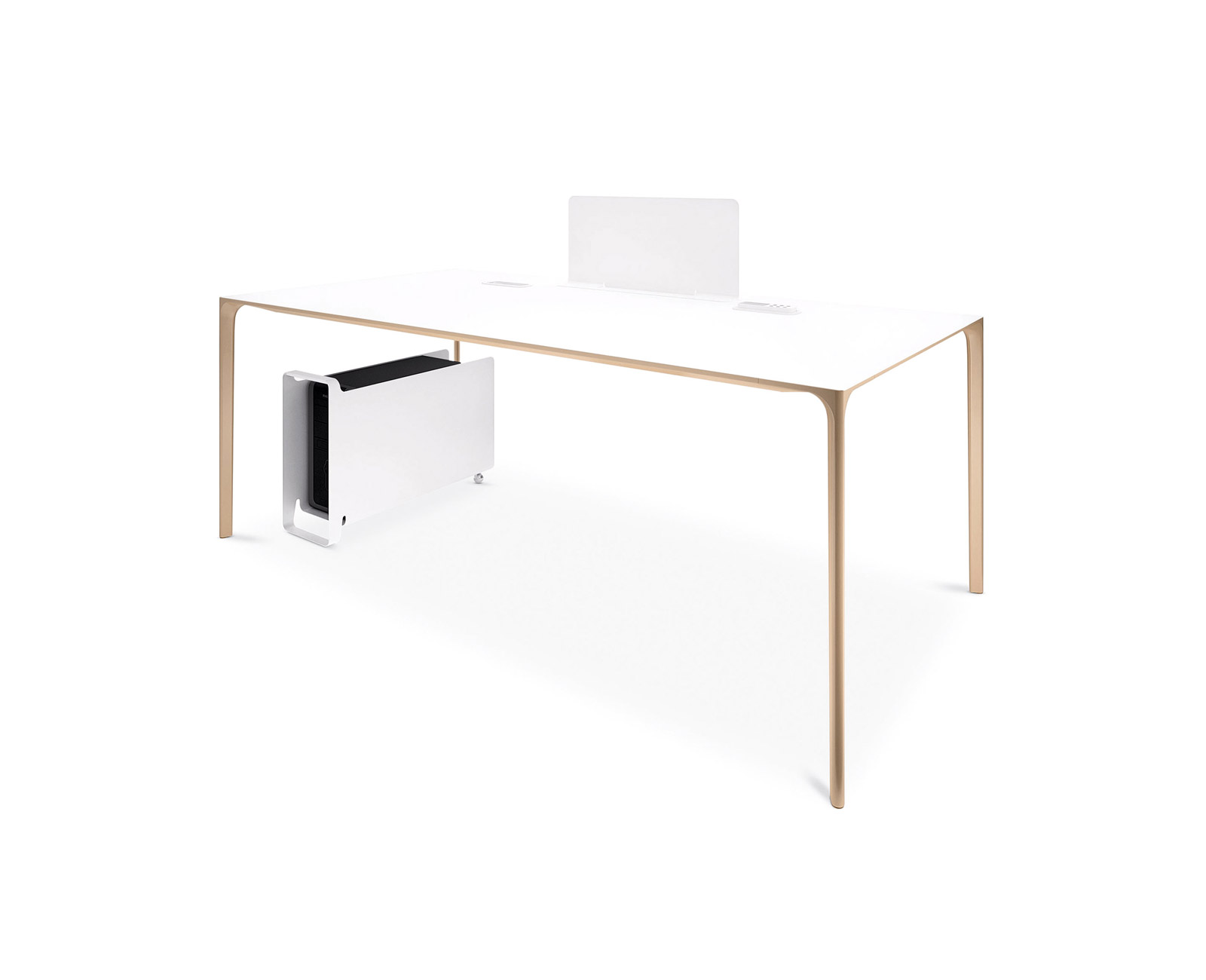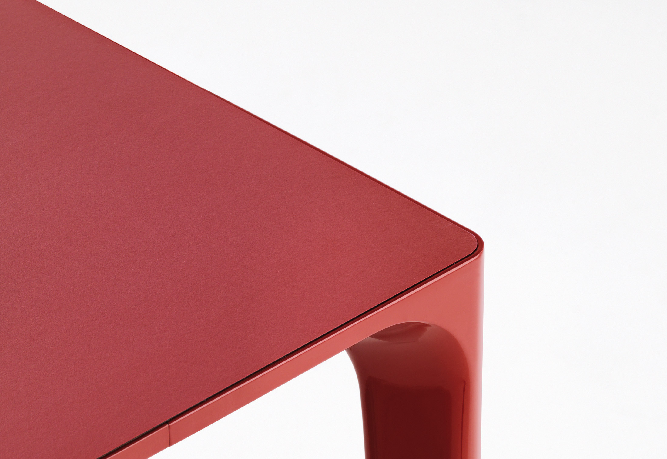 Nuur有方形或矩形两种形式,层压顶部有多种颜色可供选择,也可采用木饰面板制成。 高度可调节的结构采用抛光或涂漆铝制。