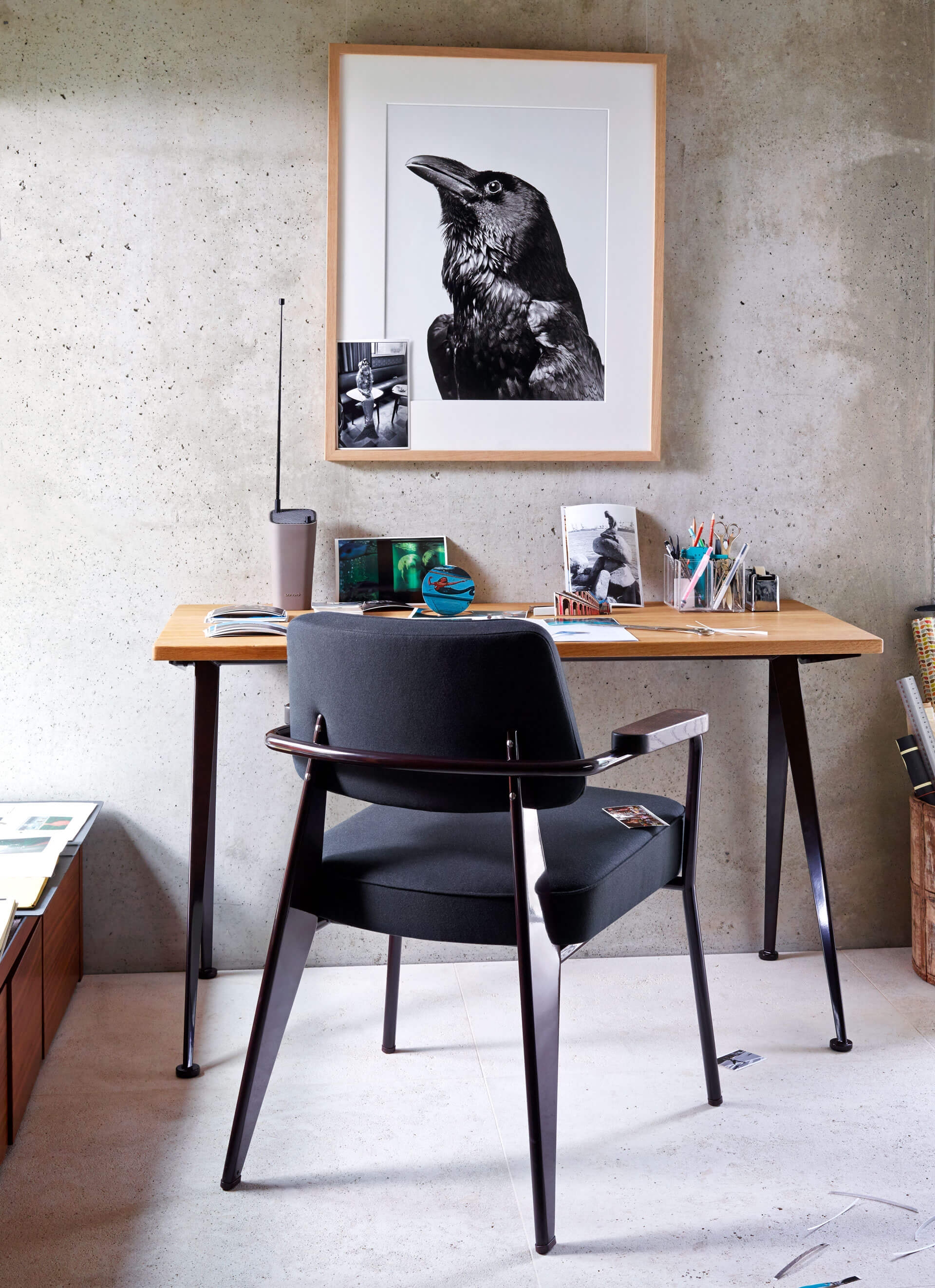 由JeanProuvé设计的Compas Direction办公桌,优雅的金属腿让人想起指南针的铰链臂 - 法语中的“le compas”。 他们的设计基于工程原理,代表了法国设计师和工程师的结构方法。 与涂油的实木桌面搭配,它们在家庭办公室形成了丰富的对比材料组合。