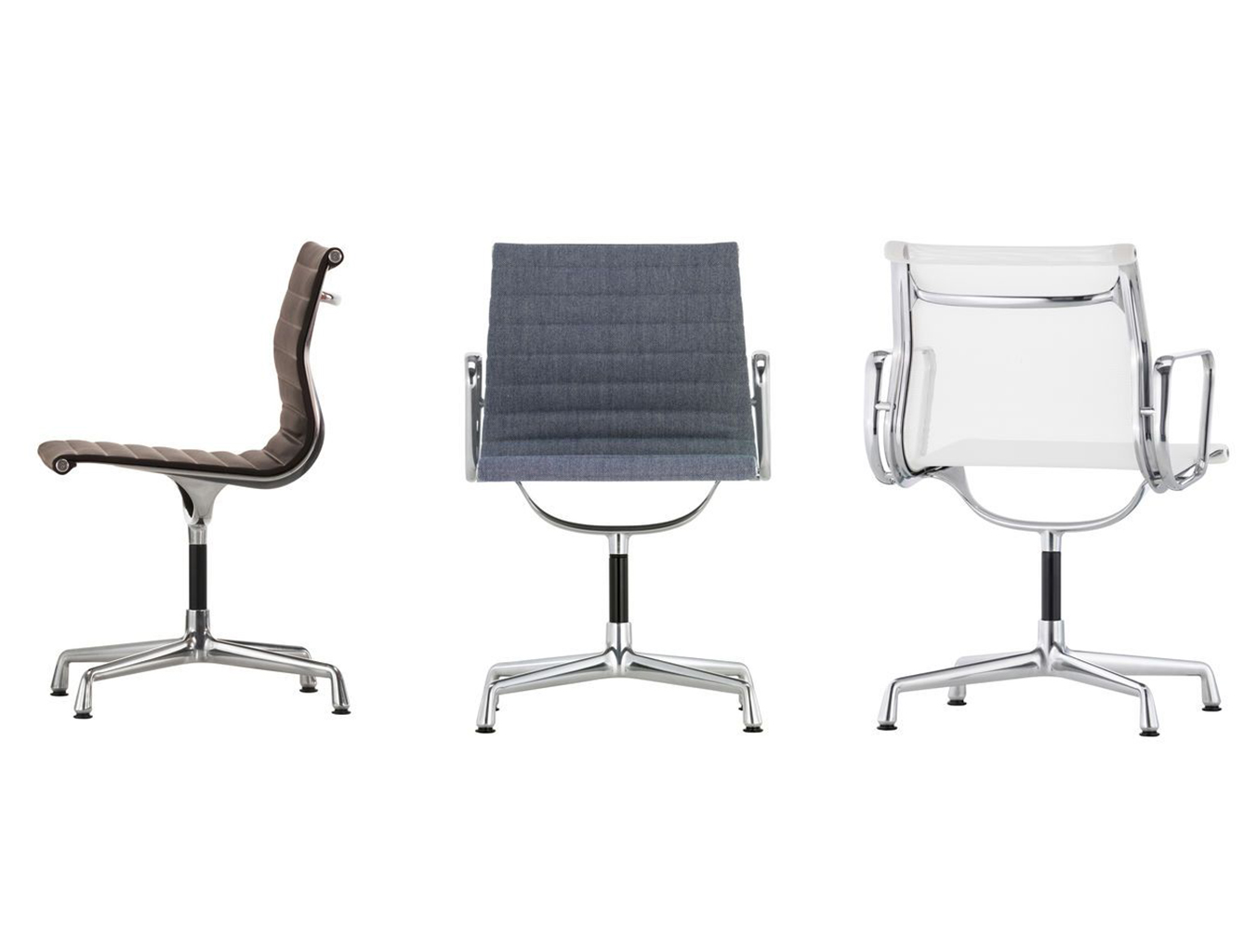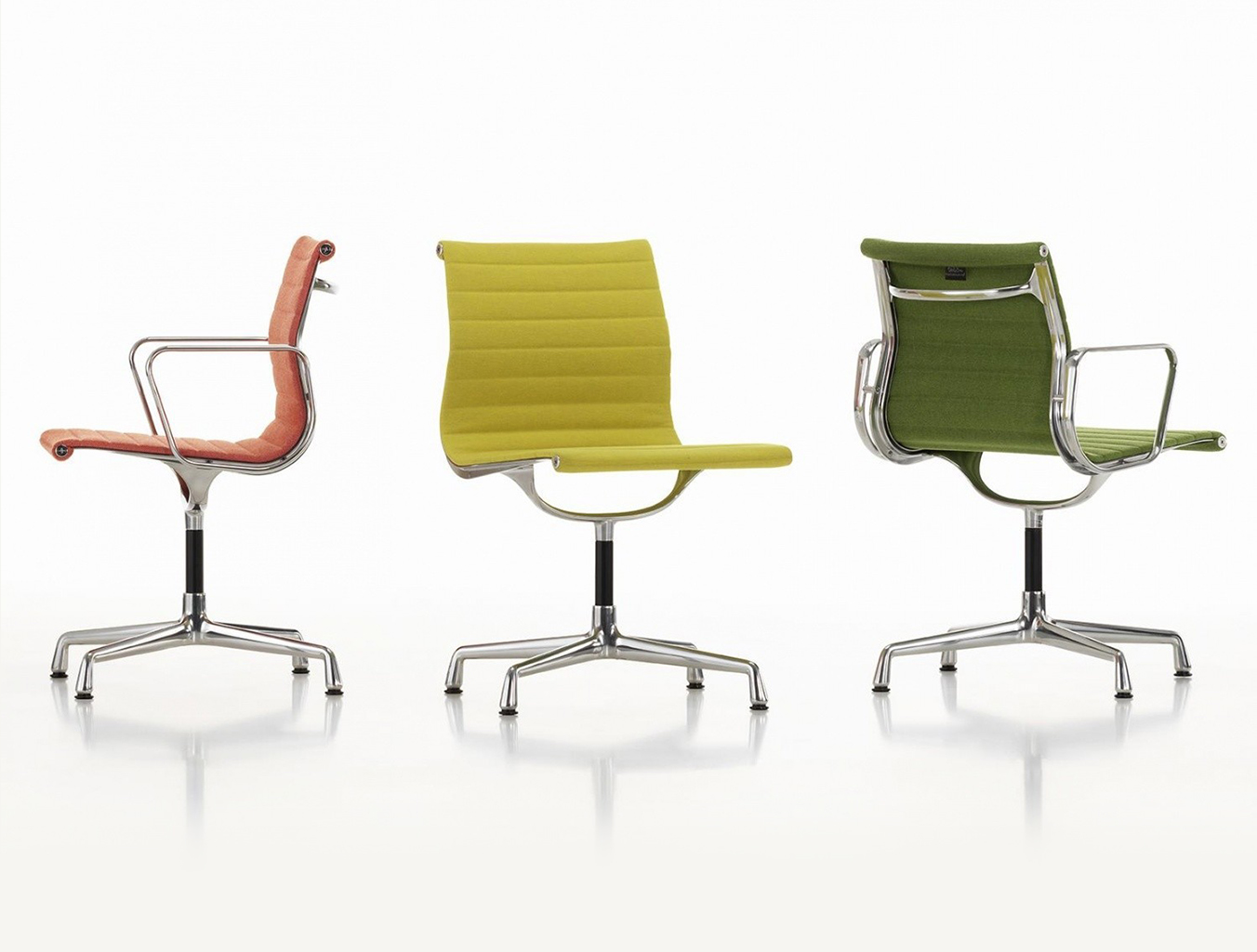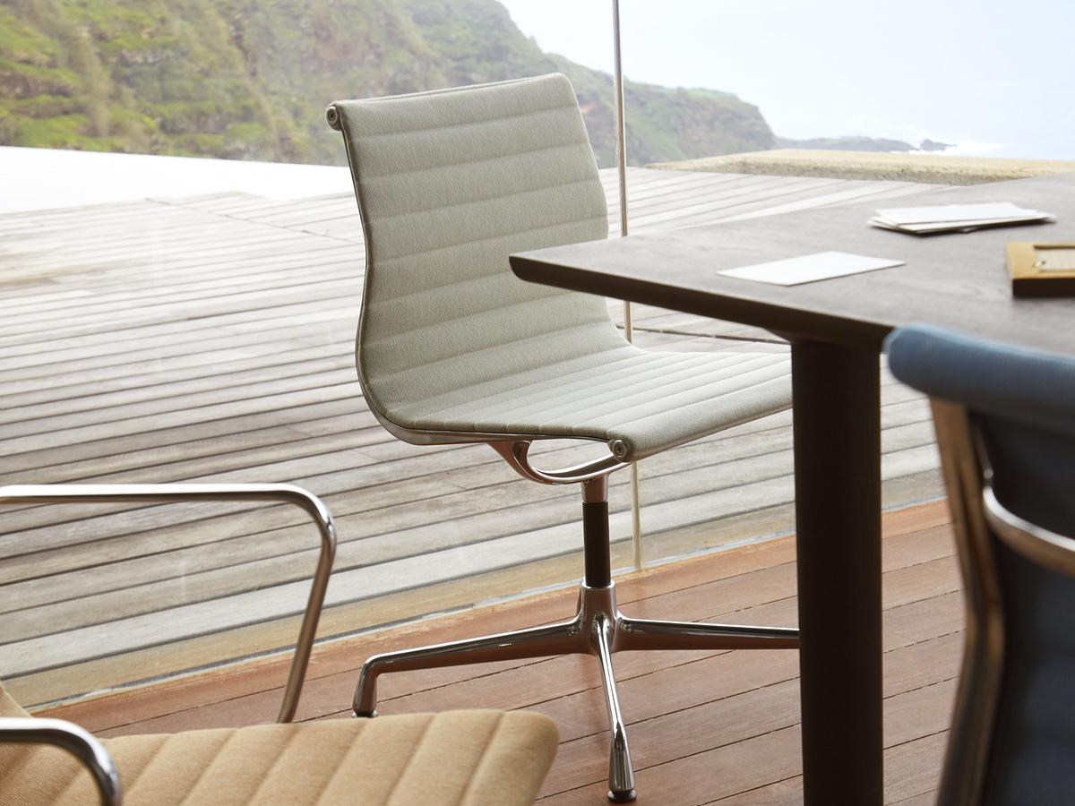 Charles和Ray Eames的铝椅EA 101,EA 103和EA 104非常适合与桌子组合使用:与铝组的其他型号相比,它们更轻,更高,更窄。 由于室内装潢具有多种柔和鲜艳的色彩,因此很容易找到适合任何餐厅的完美椅子。 这三种型号的不同之处在于基座的类型 - 固定或旋转 - 以及是否存在臂。