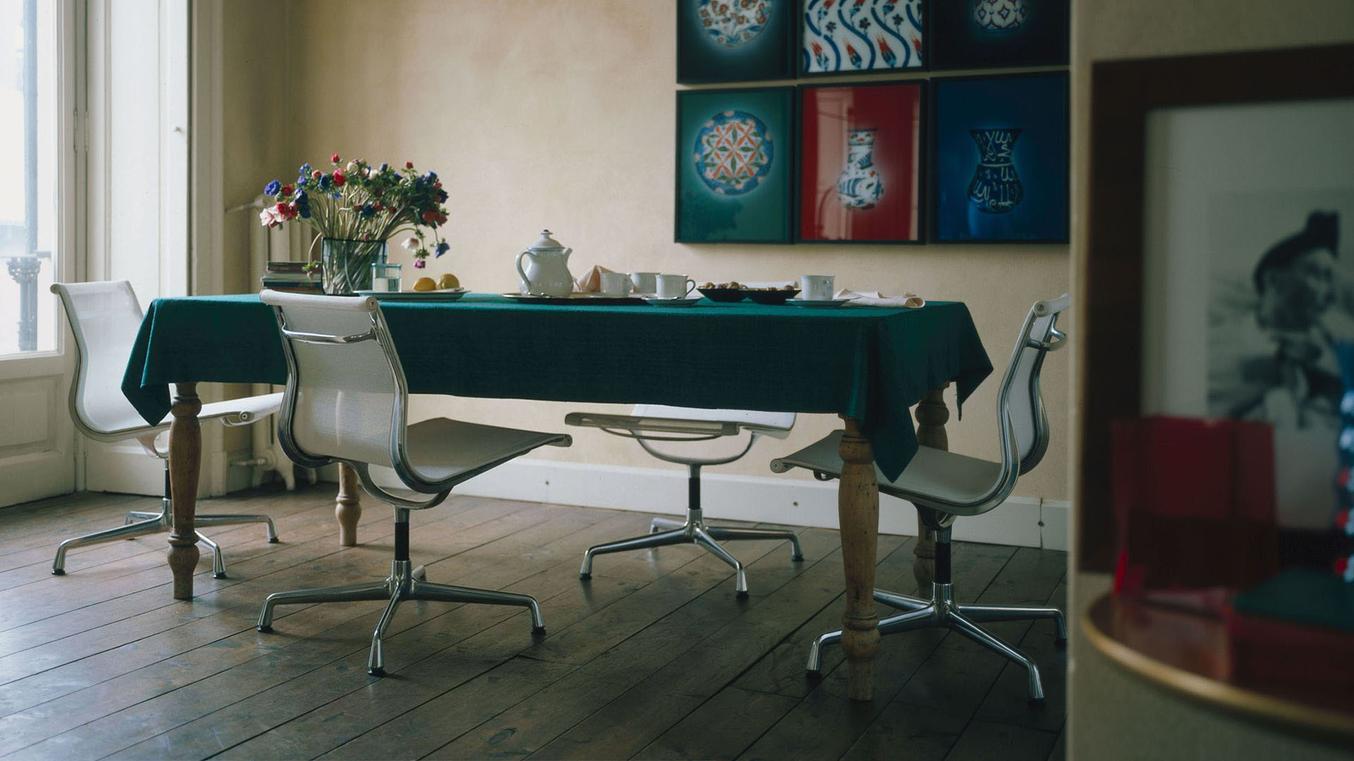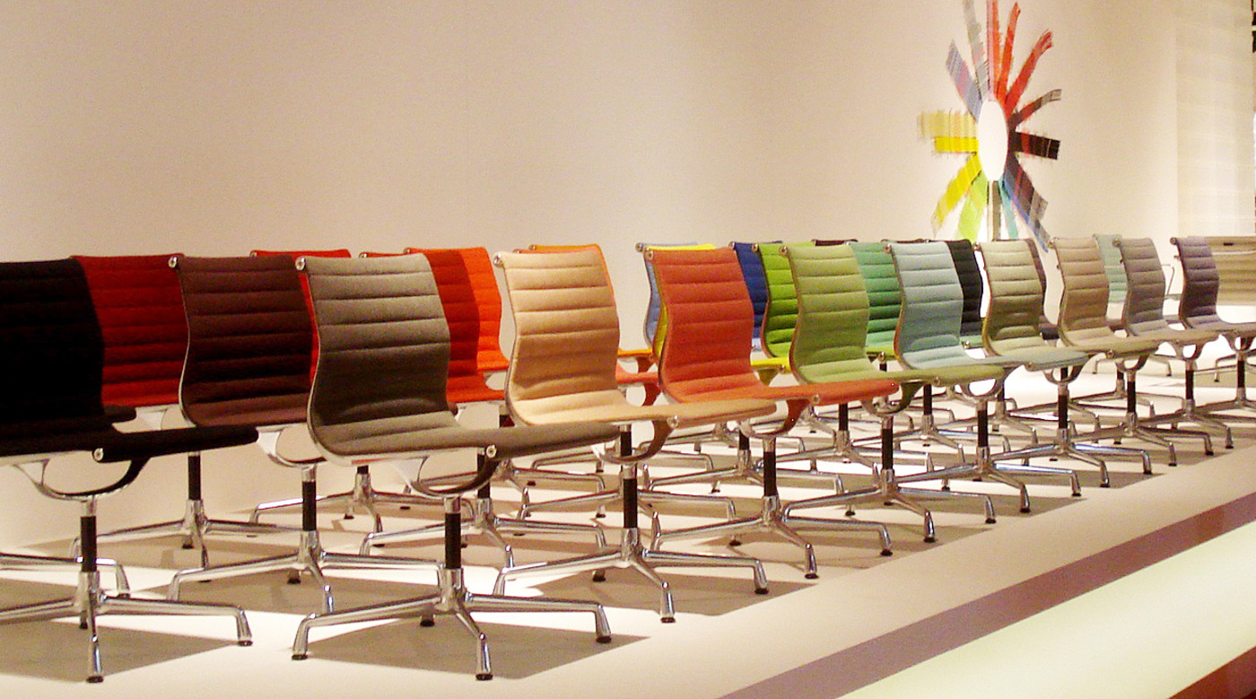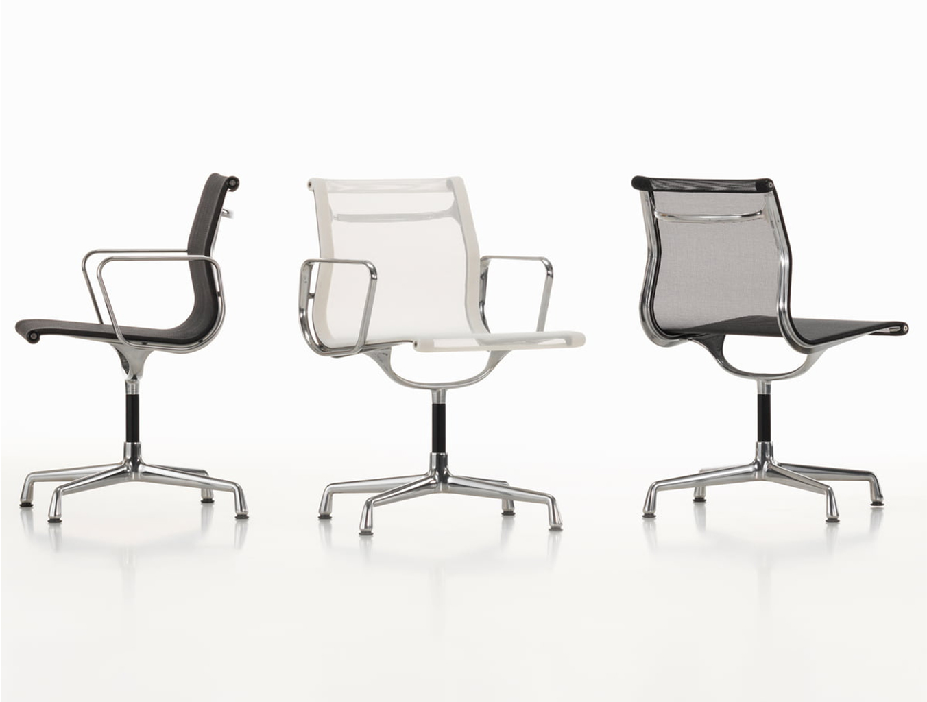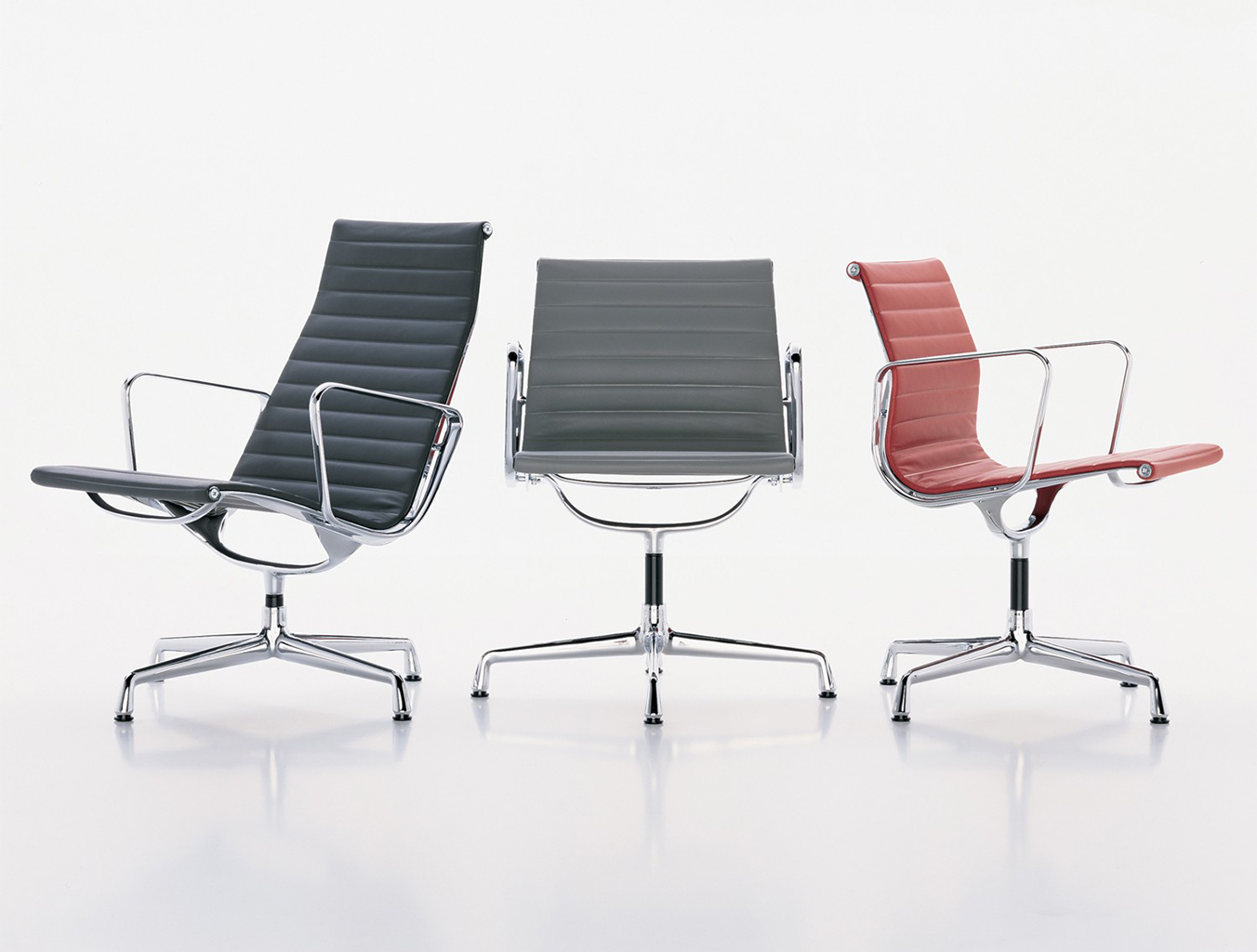 Charles和Ray Eames的铝椅EA 101,EA 103和EA 104非常适合与桌子组合使用:与铝组的其他型号相比,它们更轻,更高,更窄。 由于室内装潢具有多种柔和鲜艳的色彩,因此很容易找到适合任何餐厅的完美椅子。 这三种型号的不同之处在于基座的类型 - 固定或旋转 - 以及是否存在臂。