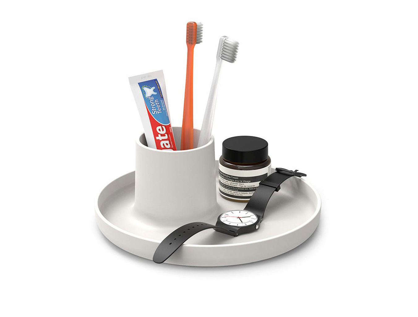 O-Tidy是一种实用的多功能存储容器。 该设计不仅提供托盘和杯子功能,而且还将其简单的形状组合成一个新的,完美比例的物体。