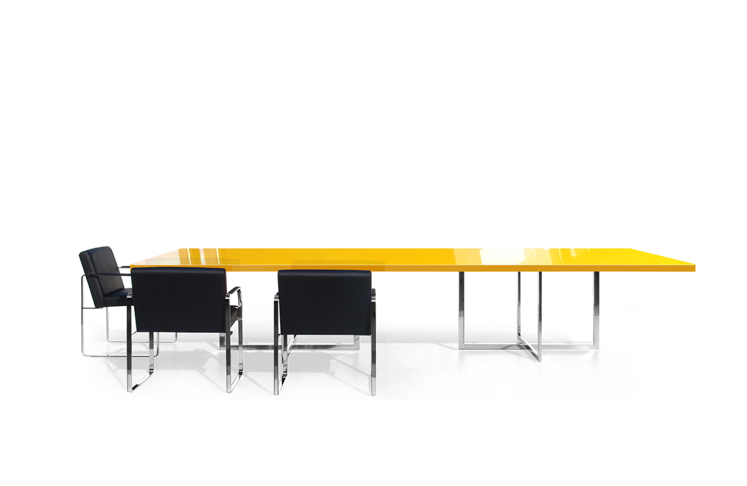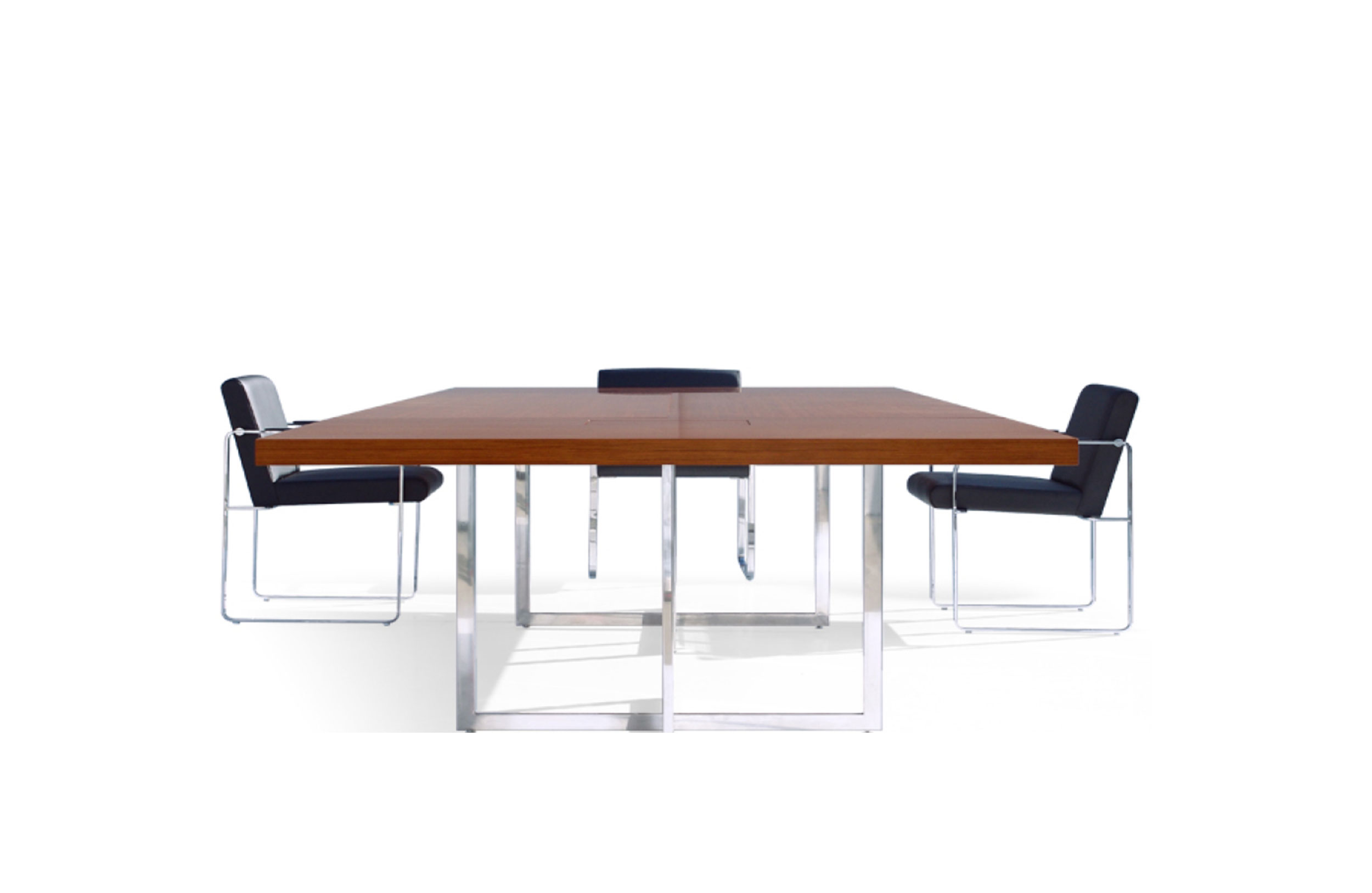 会议桌。50mm厚的一体式矩形顶部。抛光不锈钢结构底座。表面处理:木质饰面或微纹理漆面。金属底座采用抛光不锈钢制成。