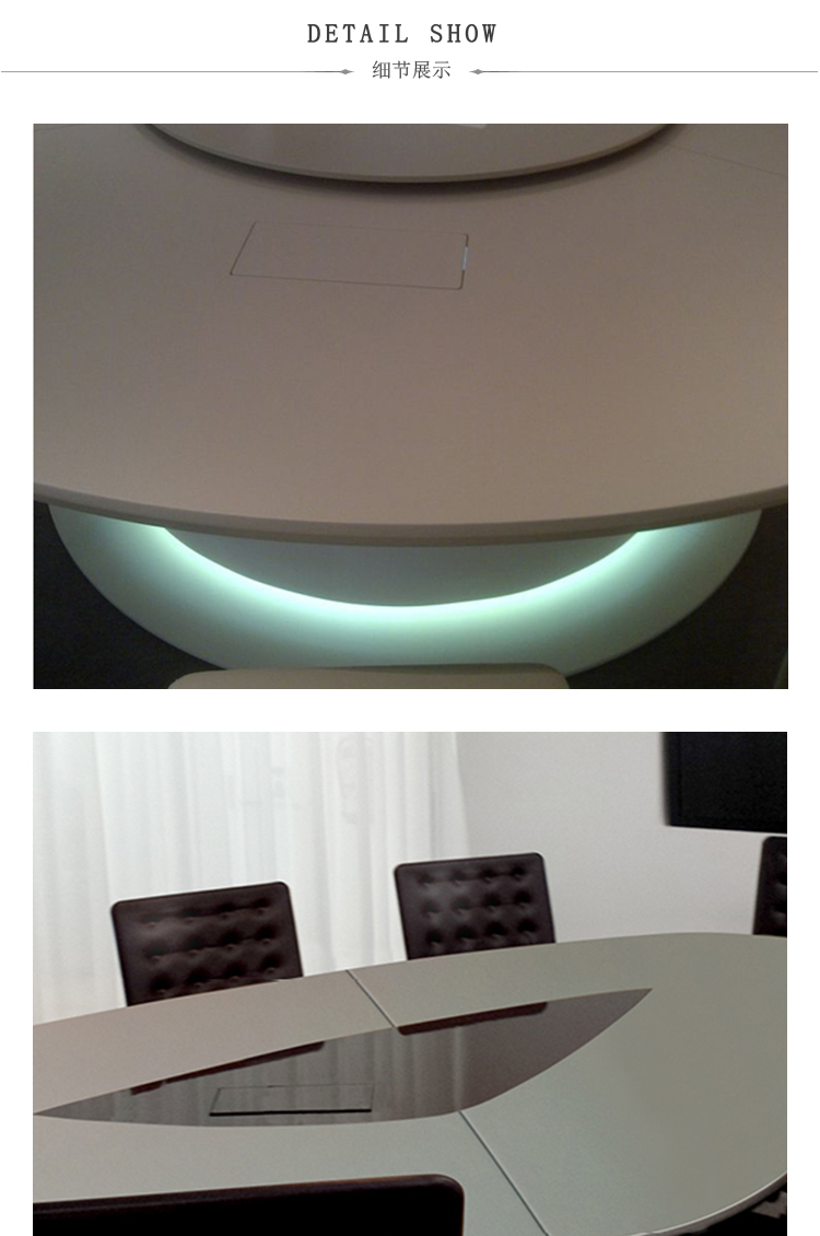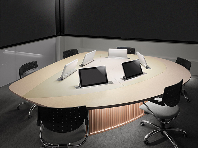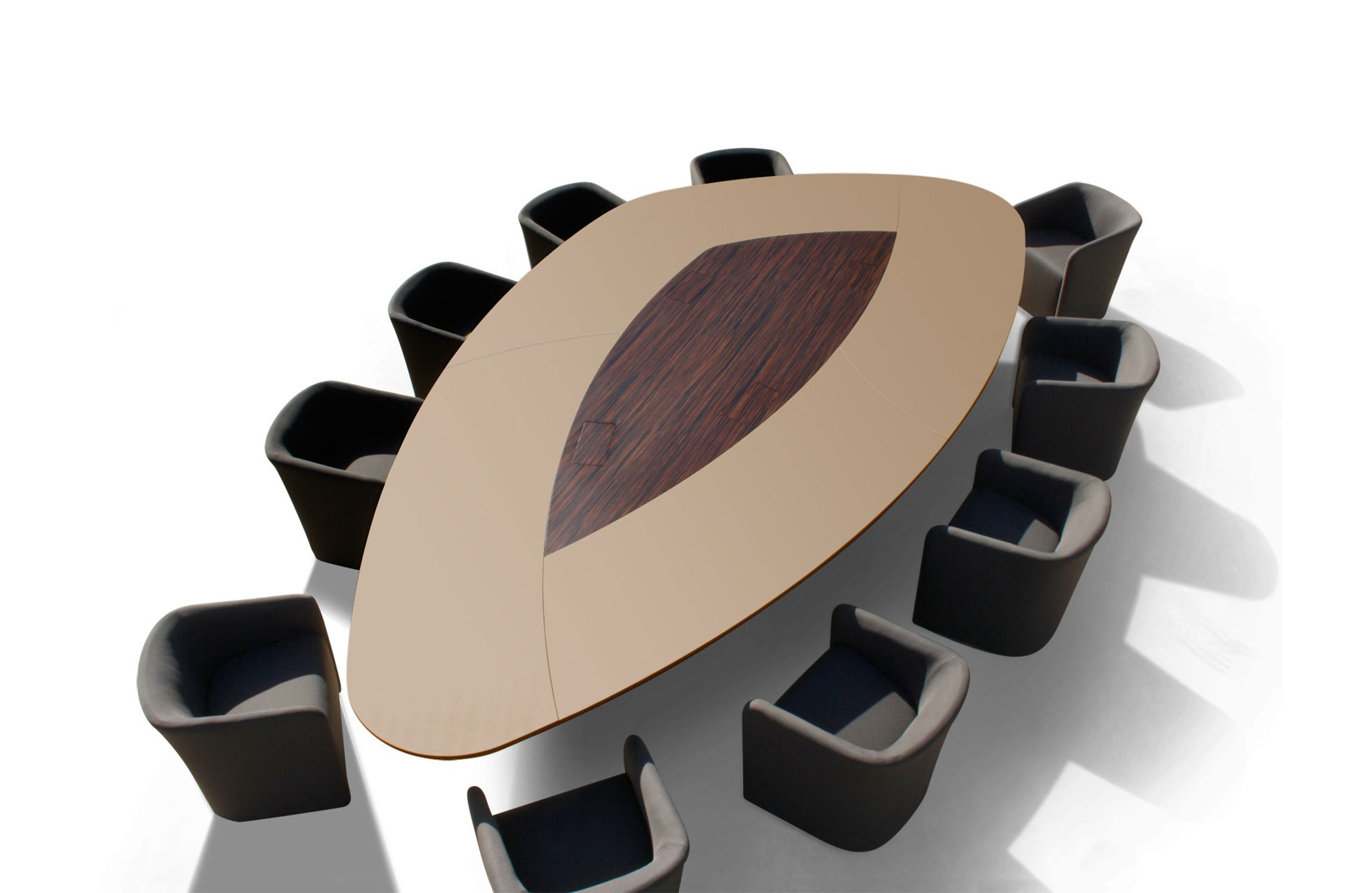 会议桌。有机杏仁形顶部。顶部分为两个区域:中心和周边,允许不同材料和饰面的组合。50mm厚的顶部由两部分组成:盖子和45o斜面底盖。办公桌专门设计用于集成可伸缩电脑显示器,电缆管理和电子系统的其他部分。底座由隐藏的金属结构组成,封闭有可拆卸的面板,可以方便地进入桌子内部,以便进行电缆管理和维护。表面处理:混合成品顶部采用木材,微纹理漆或Techno Leather软垫。以漆面为基础。