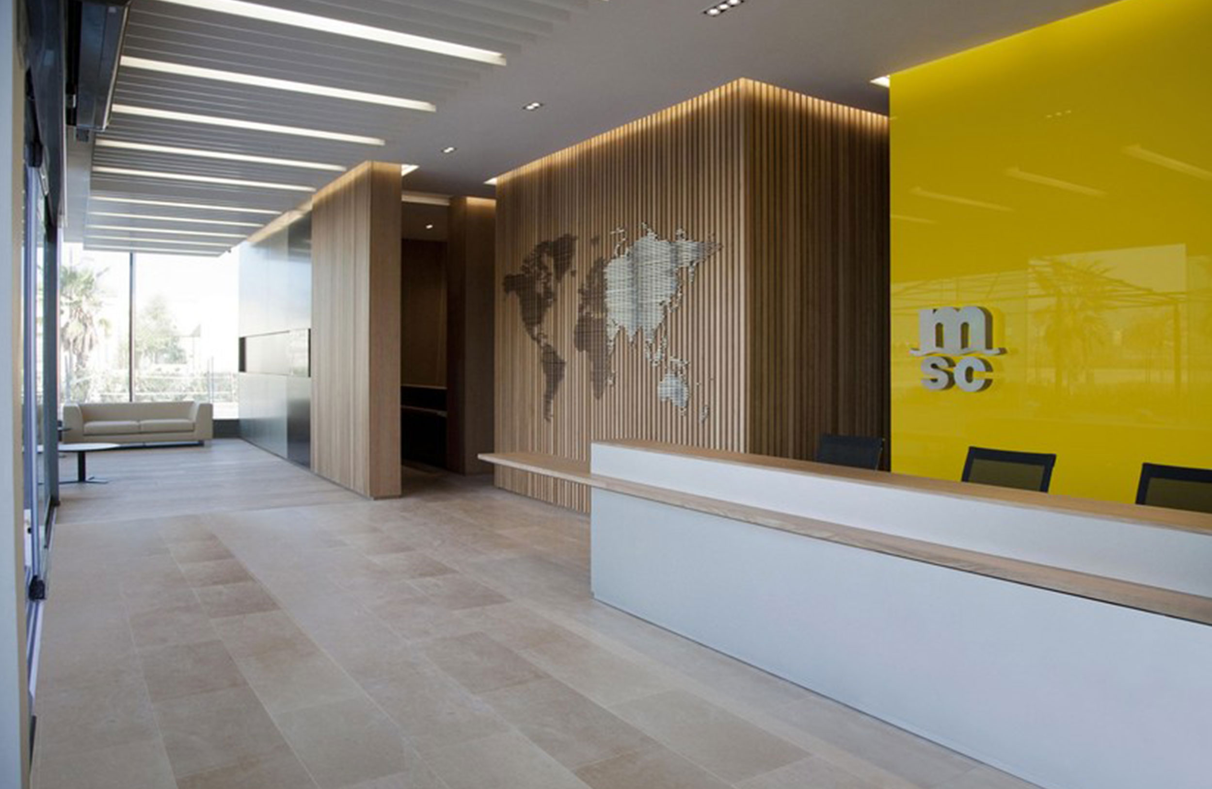 前台。上部区域作为一个利基关闭,创造了私人工作空间。外侧搁板,一侧有突出的悬垂。完成:前板,ALUCOBOND。桌面和架子,天然木材饰面。咨询其他尺寸或形状。