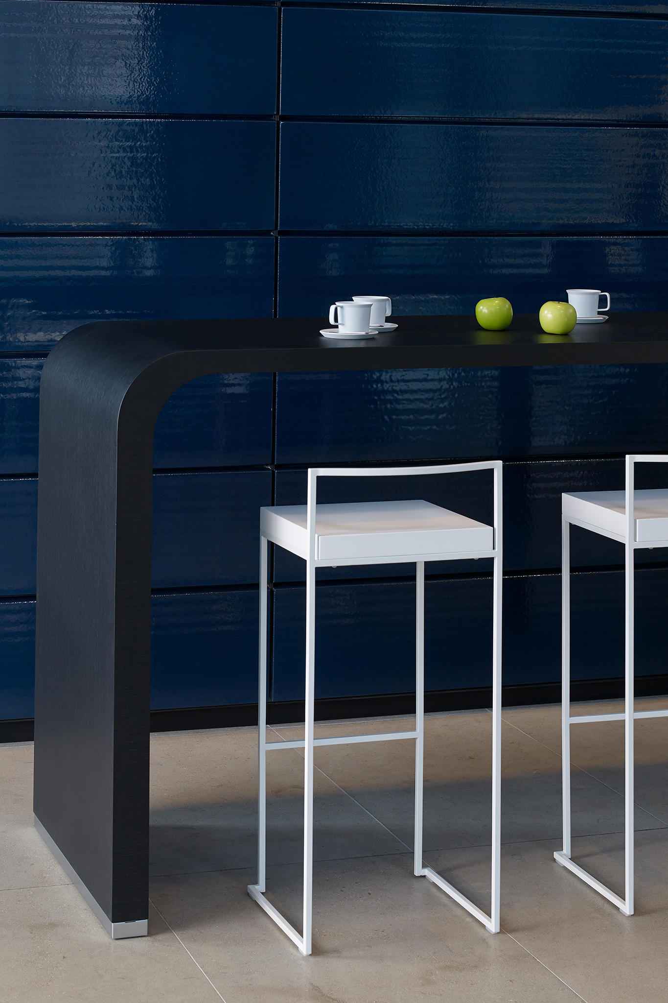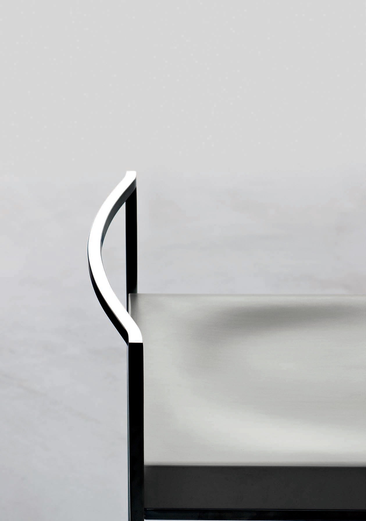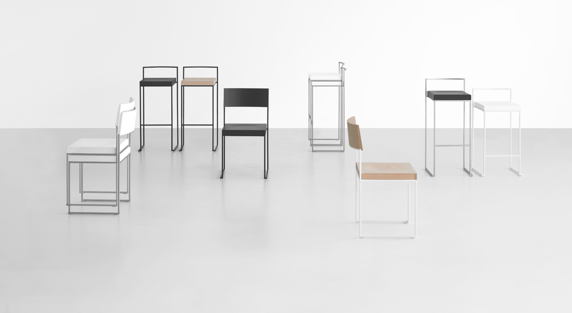 一条狭小的线条和一个正方形的结合,导致了一套极具吸引力的椅子和凳子系统,非常简约,这要归功于座椅的形状和靠背弯曲的曲线。