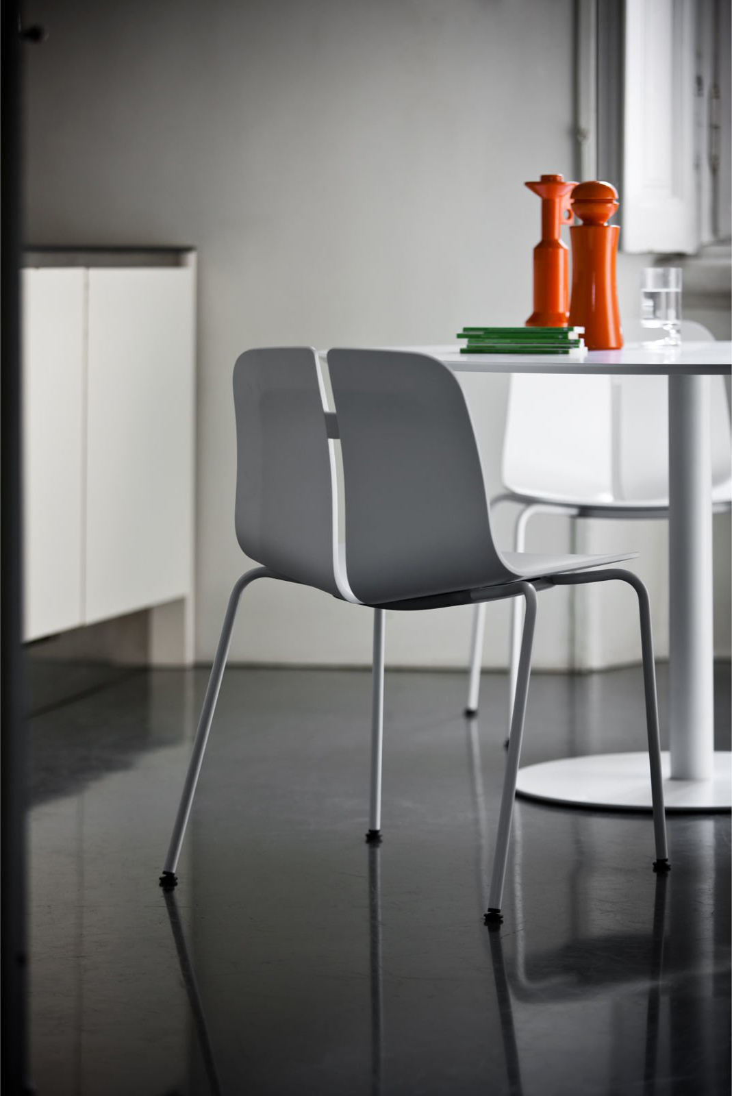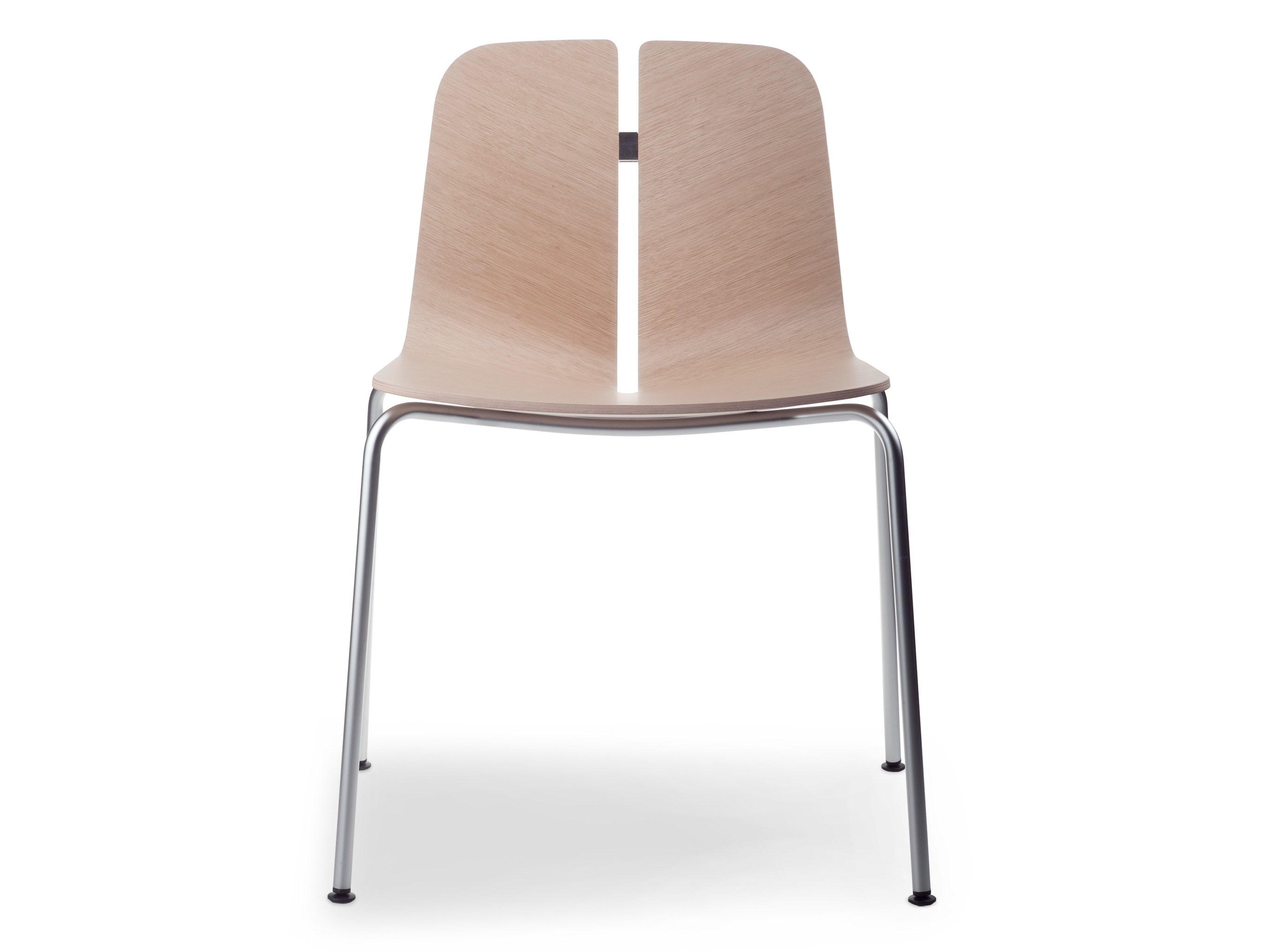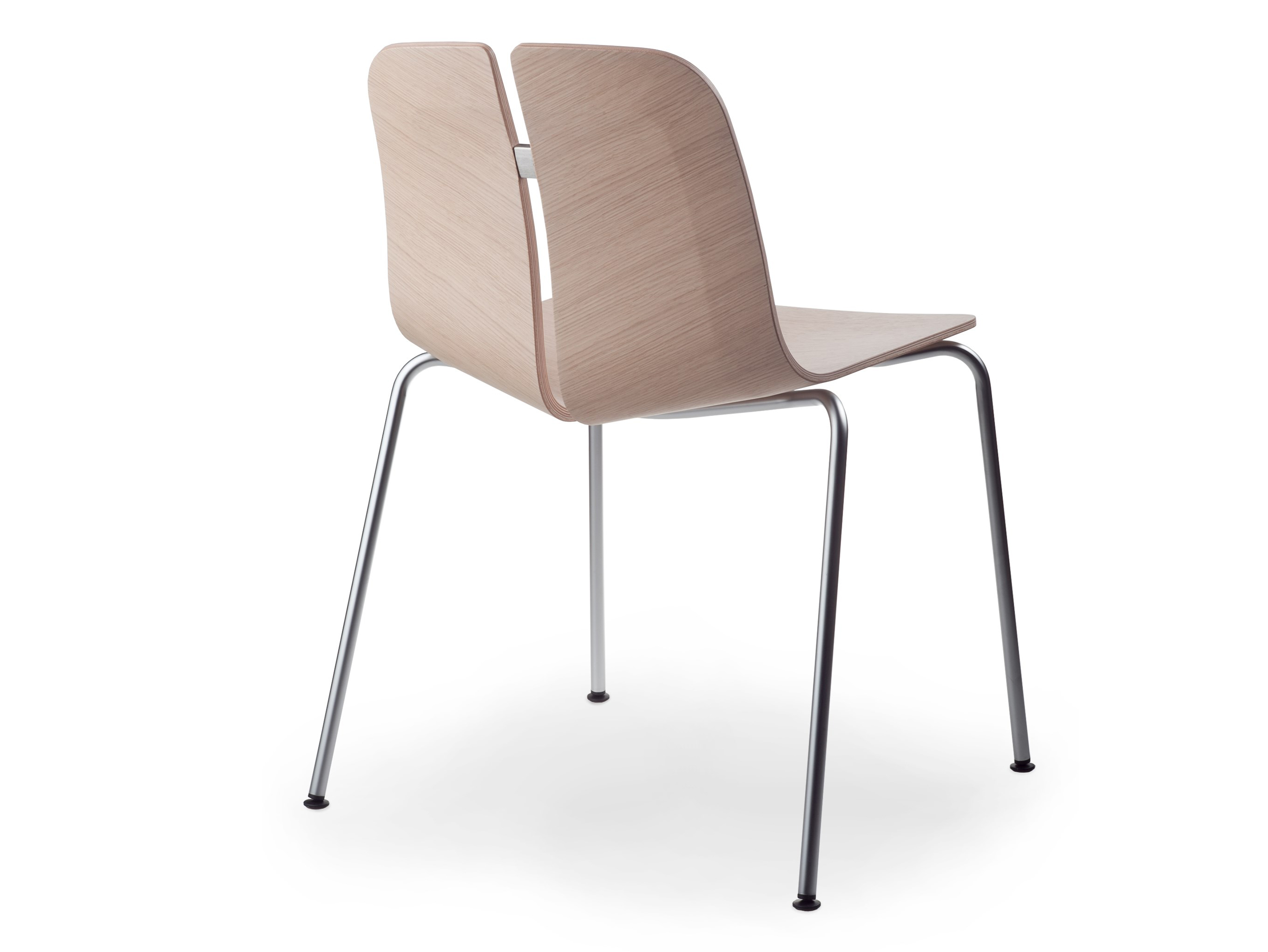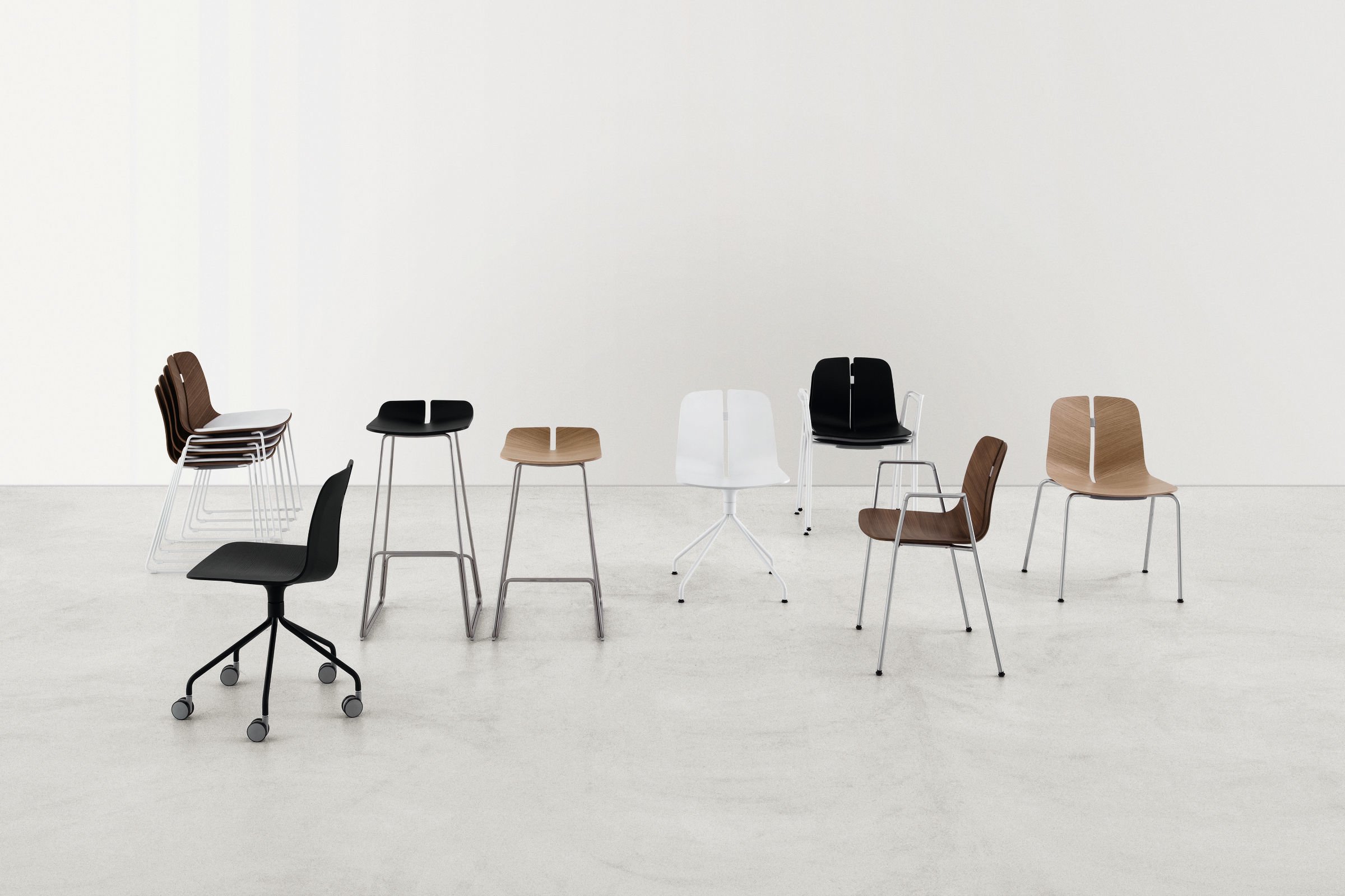一个很小的间隙,一条线的中断,和连接的凳子形状。它是轻的,就像它狭窄的金属底座和木质座椅所暗示的那样,轻轻弯曲形成靠背。在自然的木材版本,纹理加强了柔软的轮廓和拥抱像一个非常新鲜的叶子,突出其结构的轻盈性。