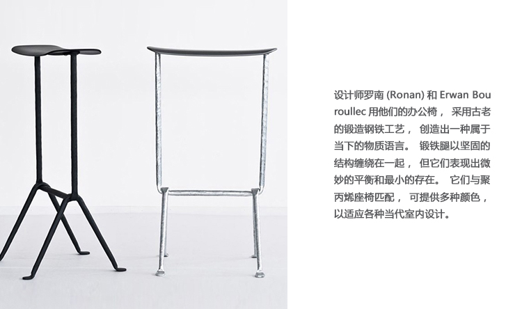 设计师罗南(Ronan)和Erwan Bouroullec用他们的办公凳,采用了古代的滴锻铁工艺,创造了属于当下的物质语言。锻铁腿以坚固的结构缠绕在一起,但它们表现出微妙的平衡和最小的存在。它们与聚丙烯座椅匹配,可提供多种颜色,以适应各种当代室内设计
