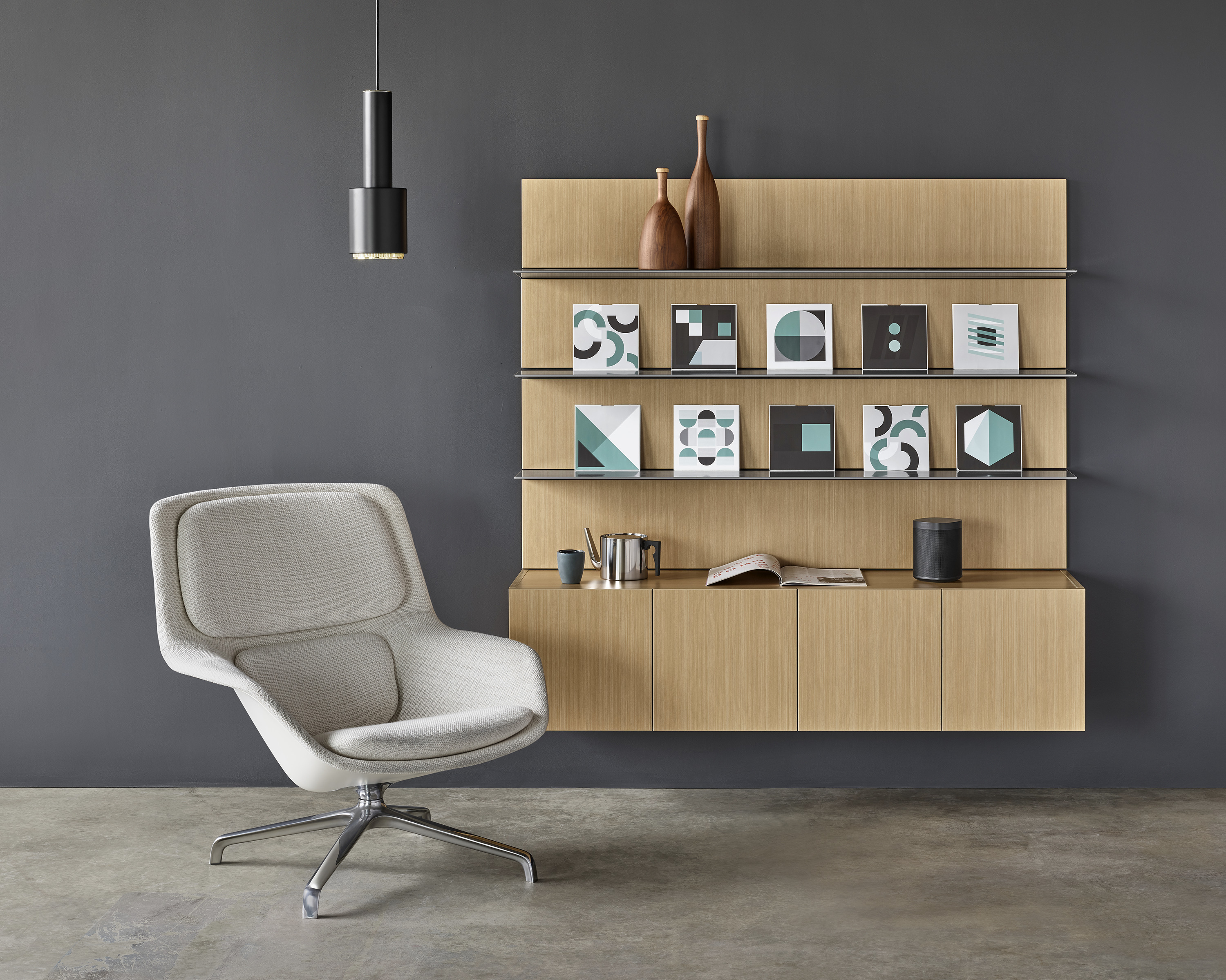 Striad能提供低、中、高三种靠背的款式,其中每款都可以选择四星自动返回底座或者固定的四腿钢丝底座,同时还能提供诸多饰面和软垫选项,适合与多种风格的空间搭配使用。