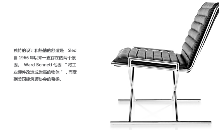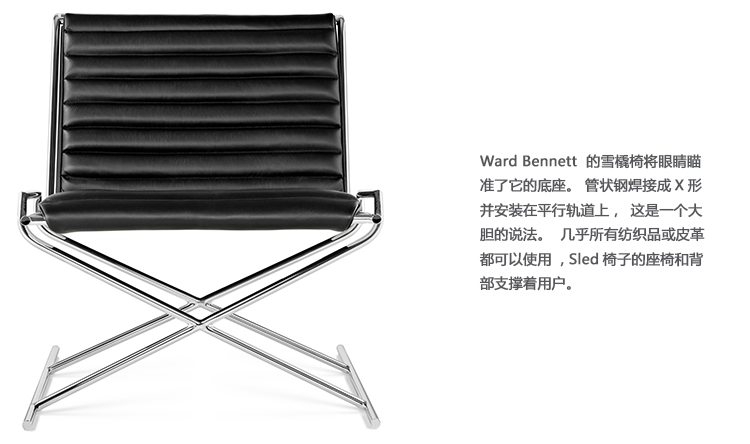 Ward Bennett Sled座椅的底座设计十分引人注意。用钢管焊接成一个X形,安装在平行的双轨之上,设计十分大胆。可选装饰有各种织物或皮革,Sled座椅座位和靠背就像一个摇篮,将就坐者环绕起来。独特的设计和惬意的舒适度是让Sled座椅从1966年流行至今的两大原因。