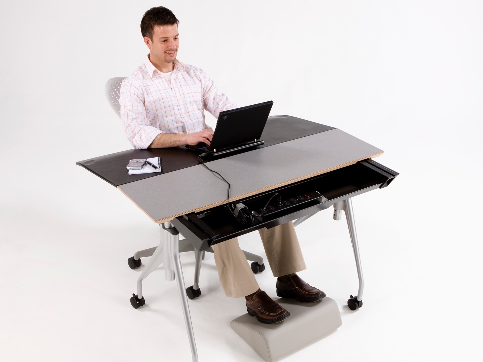 人会动,座椅也会动,为什么桌子就不能动呢?Envelop有着灵活的工作台面,在工作时可以滑动将您包围,是首款帮助您、座椅、工作台面和您的技术协调工作的办公桌。可使用标准销轴高度调节或坐姿-站姿高度可调桌腿,Envelop可以全面支持健康的坐姿与站姿。