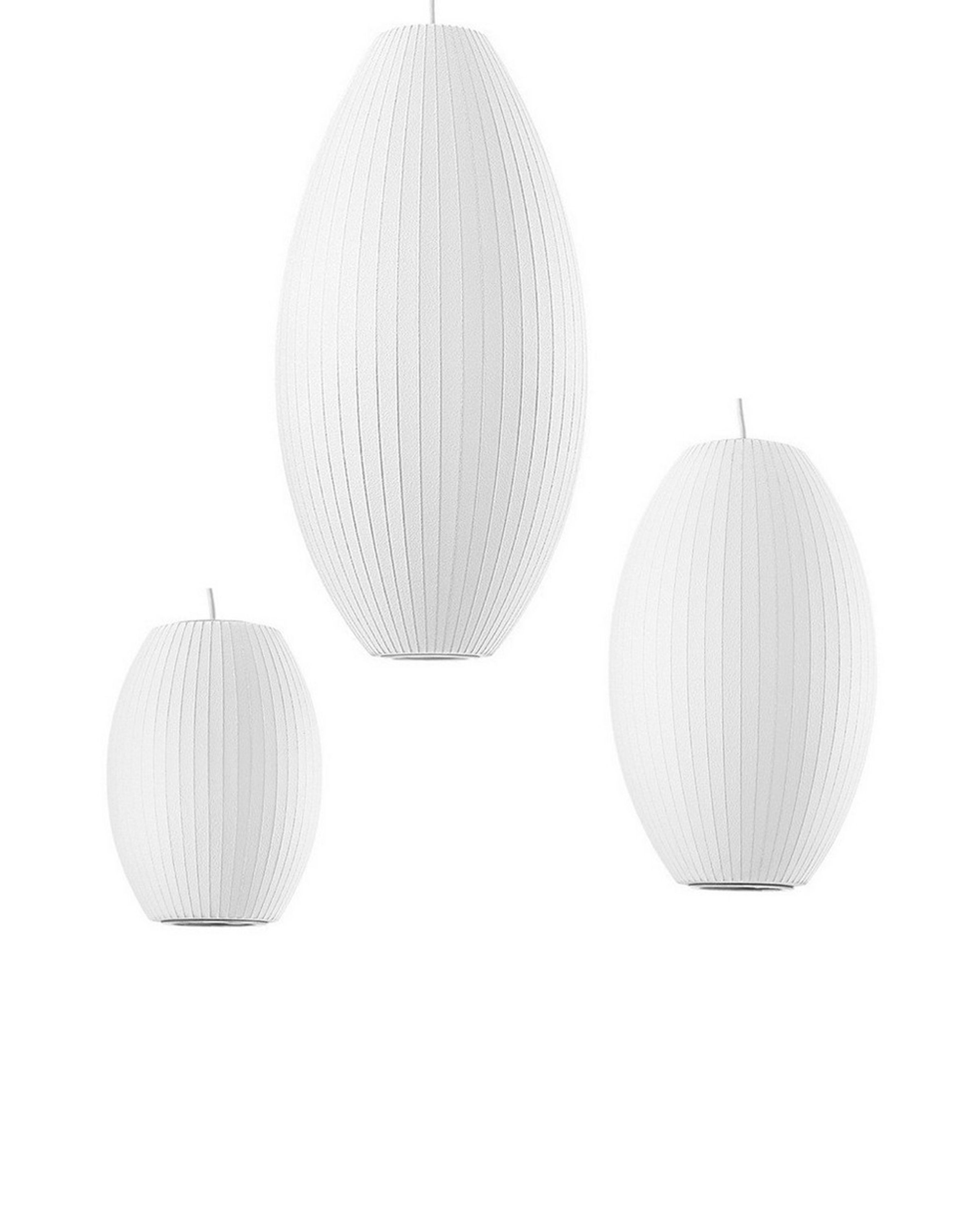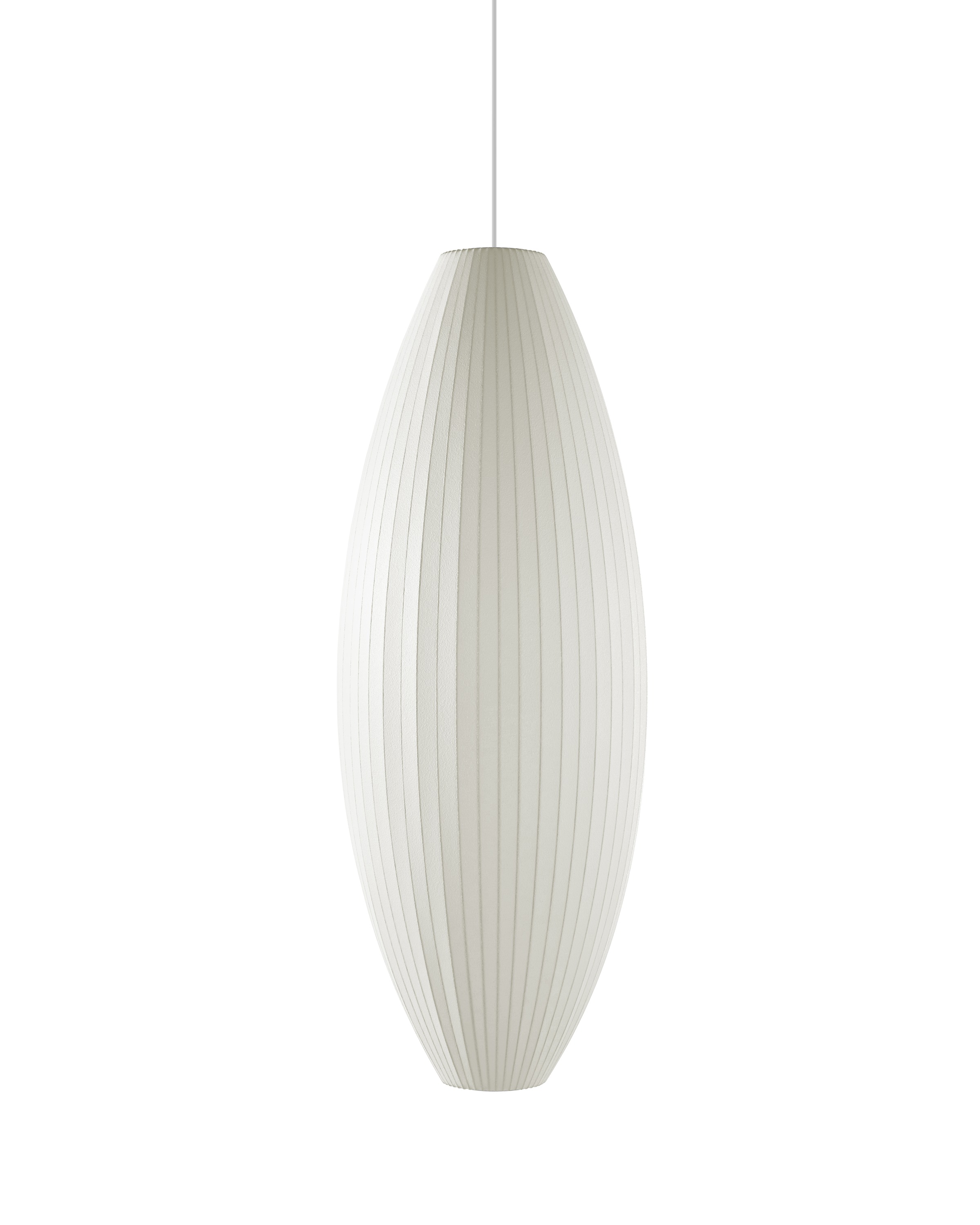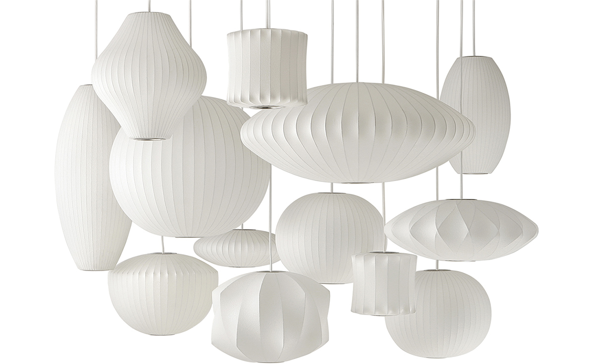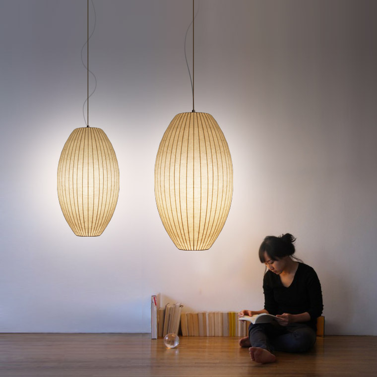 Nelson Cigar Bubble Pendant雪茄形气泡吊灯可以通过吊线板和6英寸长的吊绳悬挂在天花板上,散发出柔和均匀的光线。有小号、中号、大号和加大号几种不同规格。这些灯具最初生产于1952年,当时Nelson看到一组配有精心制作的丝质灯罩的瑞典吊灯,由此触发灵感。然而,吊灯的价格实在让人望而却步。Nelson决定设计制作自己的灯组,并且想出了用透明塑材代替真丝的创新工艺,使其能拥有更实惠的价格。