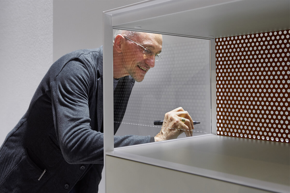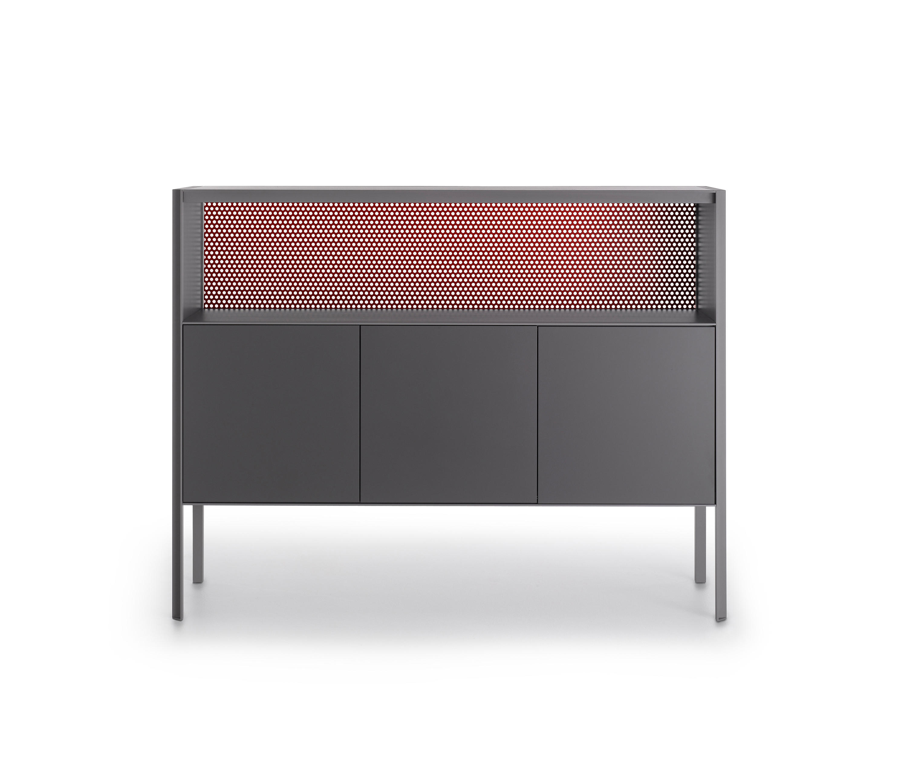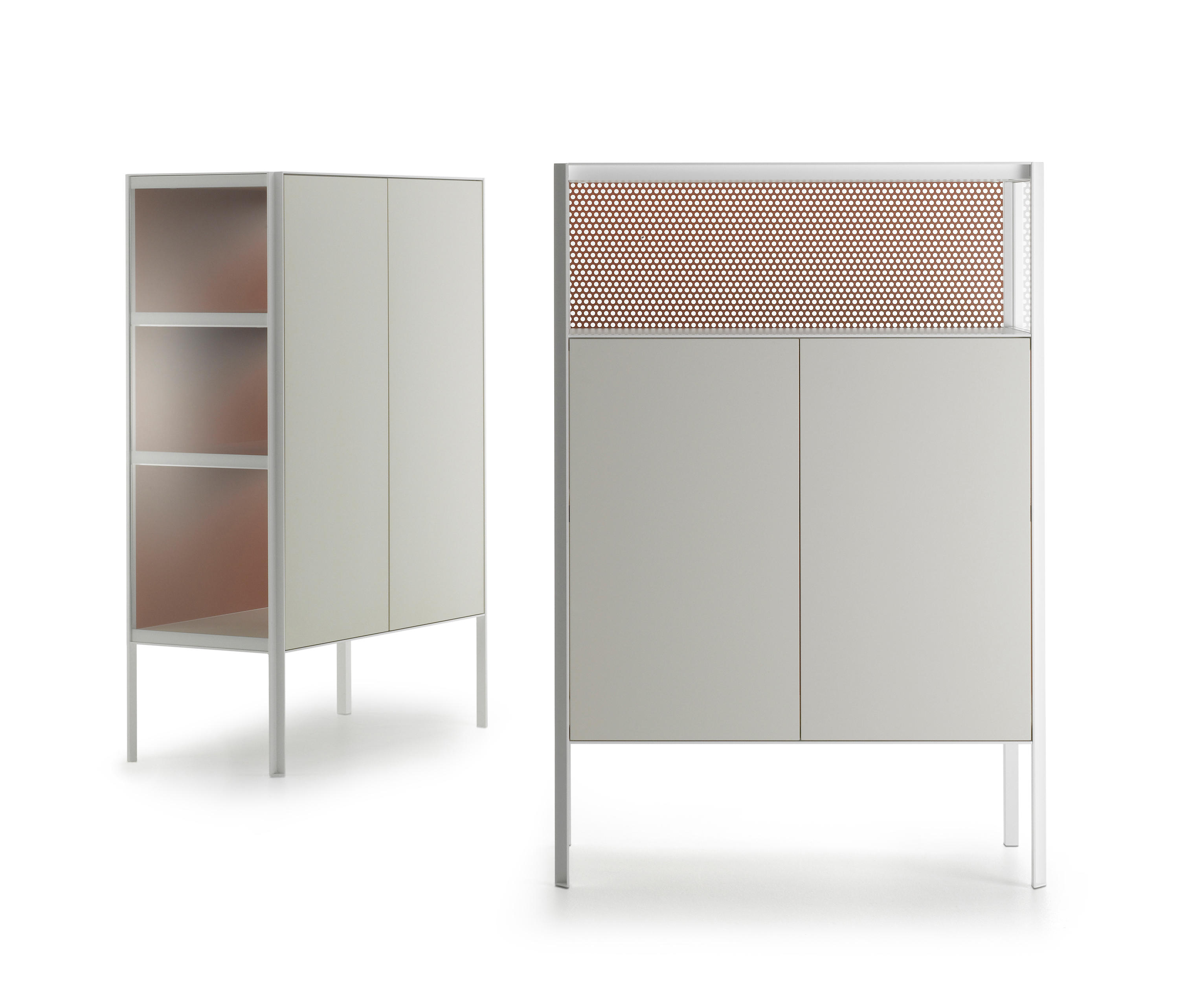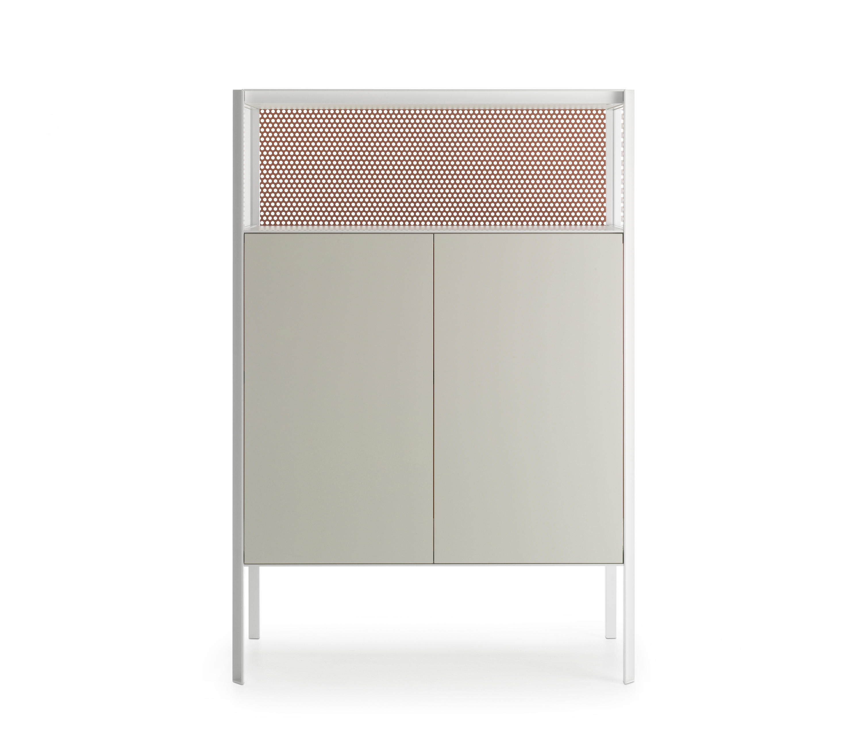 带有门,抽屉和开放式隔间的储物单元系统,适用于不同的家庭,办公室和公共环境。根据尺寸组合和正面设备,由不同储物单元组成的集合: -低L200 D50 H80厘米。可提供4门或2门,一个抽屉和一个开放式隔间,或两个门和一个双抽屉; -中号L151 D50 H116厘米。提供3门或3门和一个开放式隔层。 -高L103 D50 H152厘米。提供2门或2门和一个开放式隔层。 开放式隔间始终配备有带孔的靠背。 每个存储单元均可通过在两个侧面板的选项之间进行选择来定制: -透明的超透明玻璃,厚度为5mm -封闭,面板与结构的漆面相同。