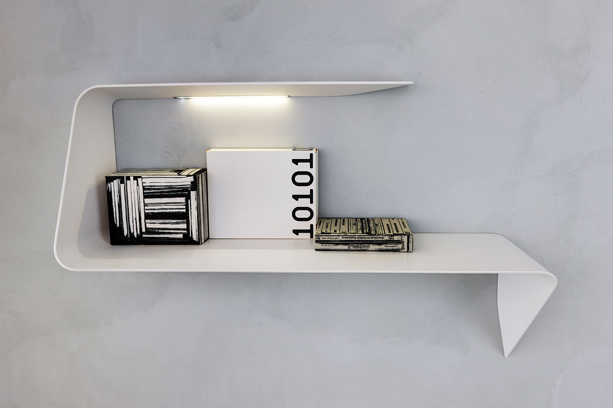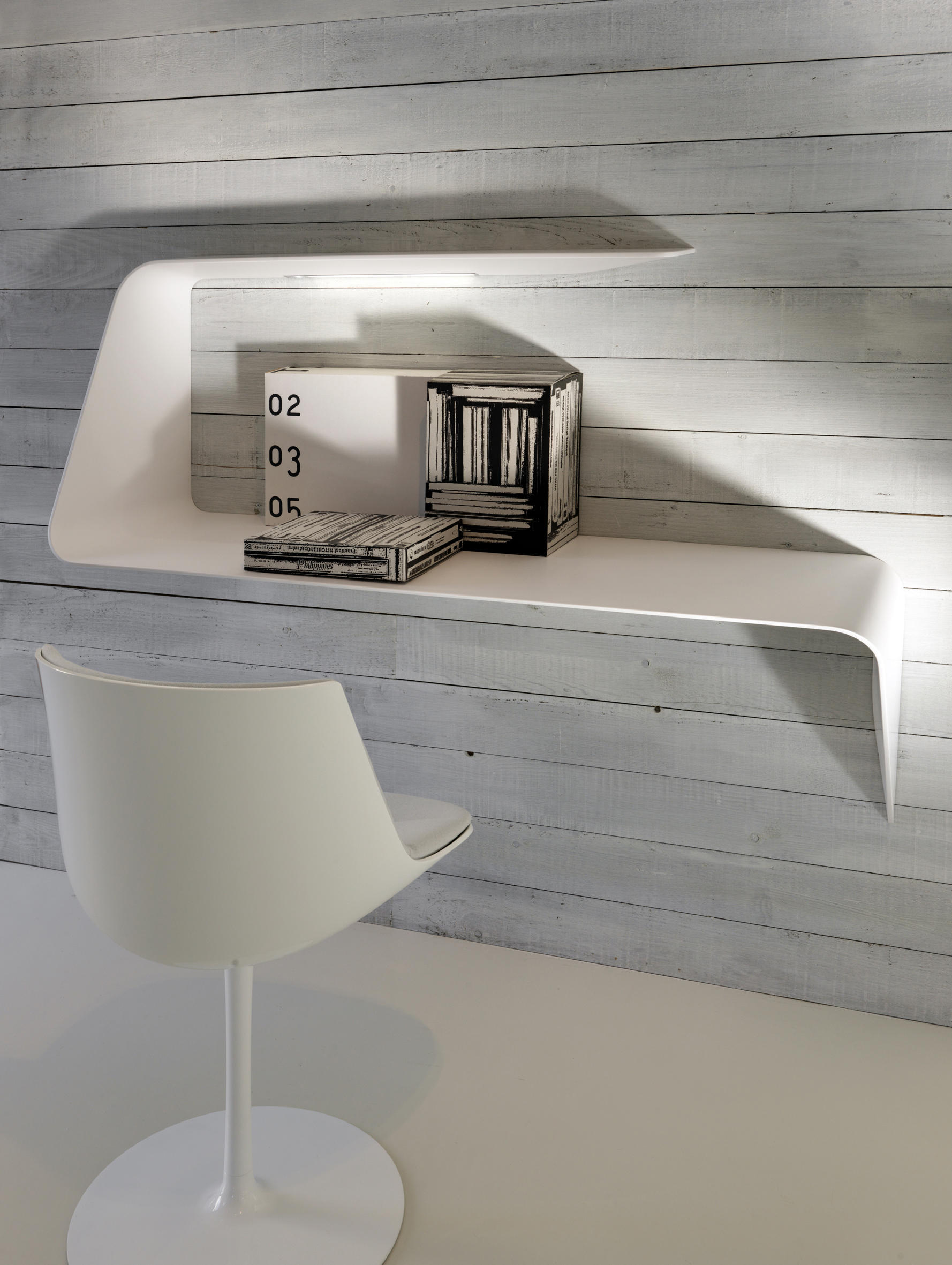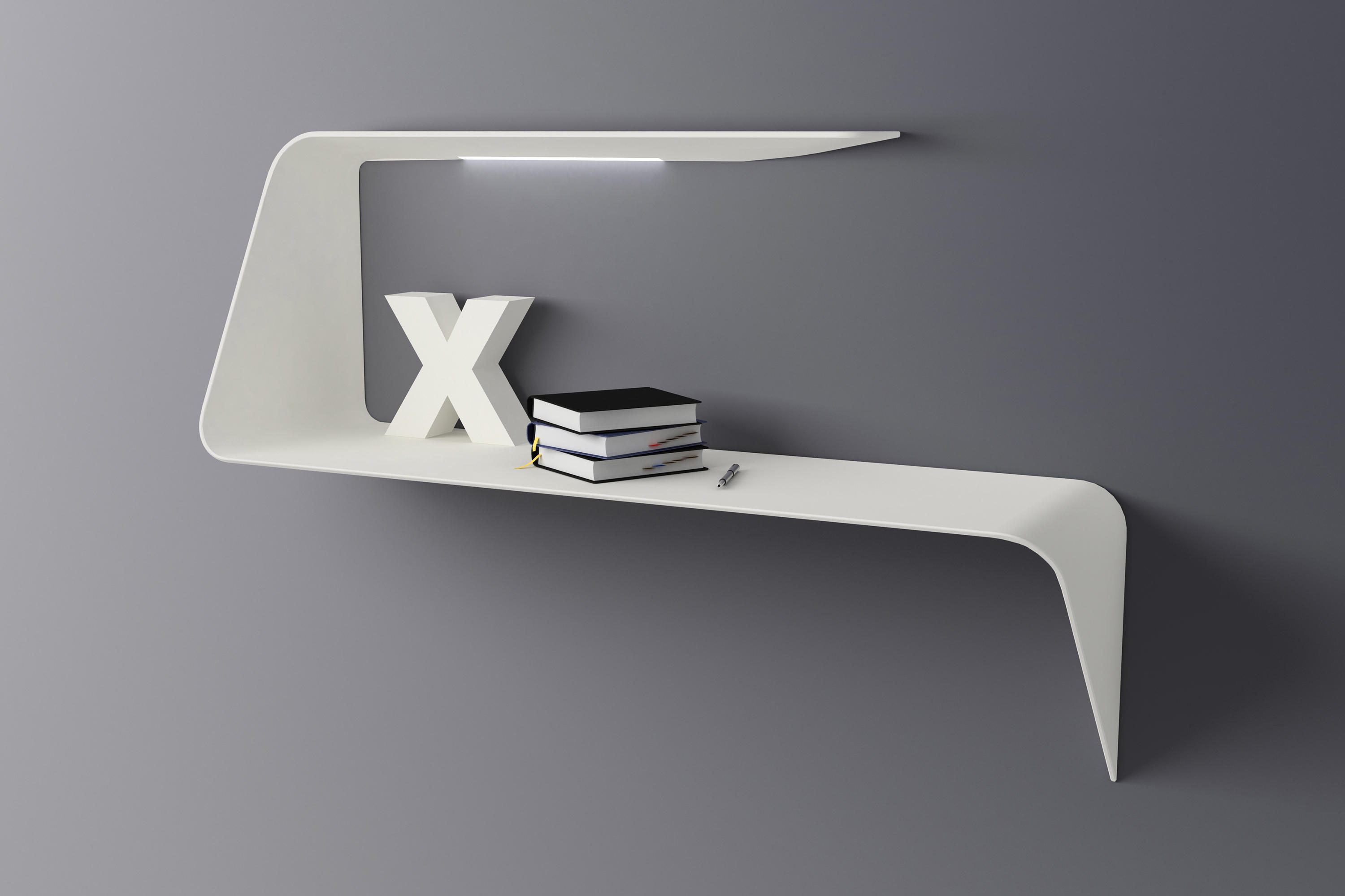 架子和/或壁挂式书桌。波浪形和渐缩的厚度为产品的设计和图像增添了强烈的视觉冲击。Mamba还配备了白色的HD LED。