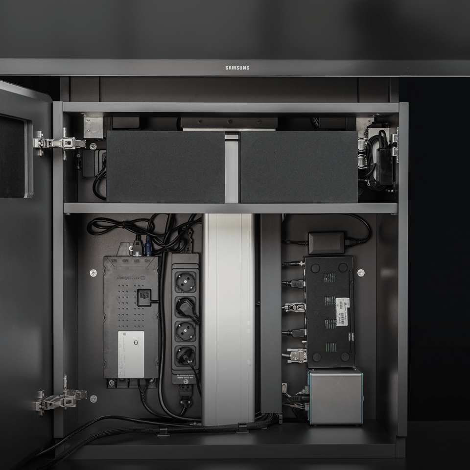 纤细的移动多媒体墙W8凭借着高功能性和灵活性的设计令人喜爱。集成的插头和播放控制系统提供了一个自由的多媒体方案,改变了用户的会议自由性。多种屏幕尺寸可供选择,适合于各种大小不同的会议室要求。