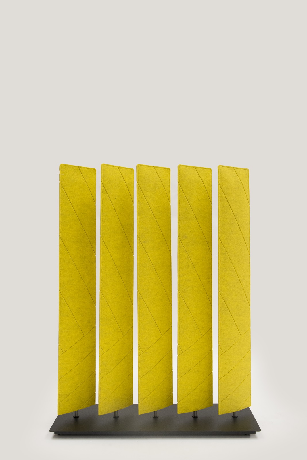 BuzziBlinds Classic于2011年推出,立即成为开放空间分隔面板的成功之选。五年后,是时候为该系列添加一些香料了。BuzziBlinds的灵感来自现代主义建筑。BuzziBlind的V形切口的定向所产生的节奏和音调为所有空间带来了动感和深度。 这个自支撑的分隔面板由一系列五个旋转的百叶窗组成。简单的旋转即可让您不同程度地打开或关闭百叶窗,以创建私人空间或开放空间。用户可以随时确定他们想要或需要专注于特定任务的隐私级别。 借助这些新的BuzziBlinds,我们希望提供创建更多个性化空间的可能性。 困难在于盲人逻辑特有的重复管理。我们的创作在视觉上不应太沉重。这就是为什么除了扩大它们之外,我们还对构成BuzziBlind的每个刀片顶部的形状进行了研究;我们还使用了Buzzispace开发的非常创新的V形切割技术,在百叶窗的外部材料上创建了图案。这些图案实际上仅通过光对隔音毡中“ V”形切口的影响以及它们的阴影才能显示出来。新的BuzziBlinds有4种不同的形状,可以直接在BuzziFelt中雕刻不同的V形图案。百叶窗可以具有不同的彩色表面,以便在百叶窗部分打开时产生有趣的视觉效果。在某些BuzziBlind上,还可以通过旋转两个刀片来创建不同的形状和新的图案。但是每个百叶窗也可以具有不同的颜色。它们也可以是直的或弯曲的... 所有这些为建筑师和最终用户提供了几乎无限的可能性,使新的BuzziBlinds成为表达自己的创造力的真正工具。