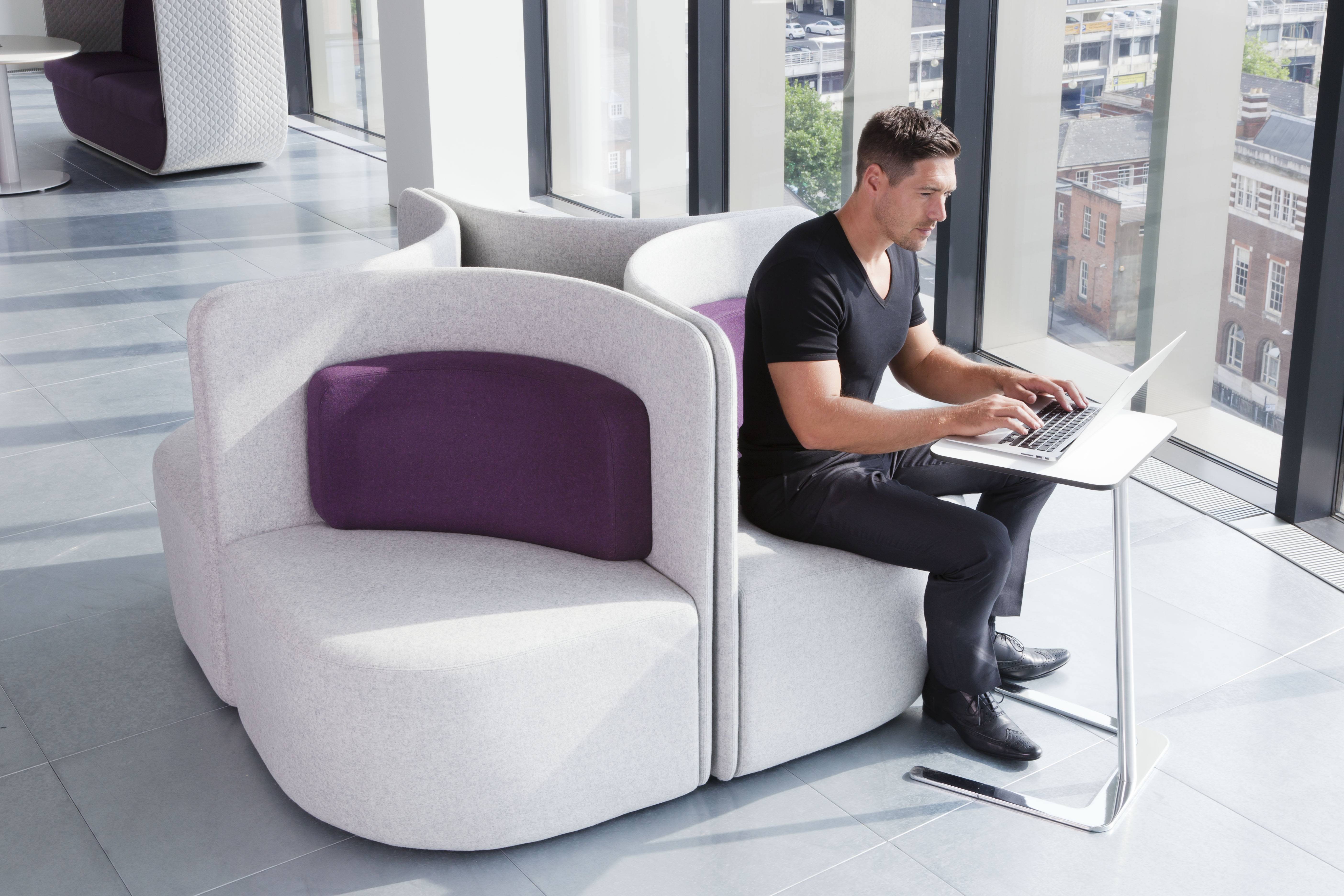 作为一种有高、低背两种款式可供选择的椅子,这种设计可以提高声学特性,并吸收周围背景噪音。