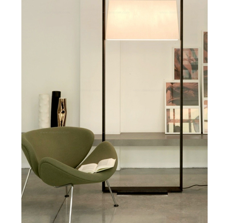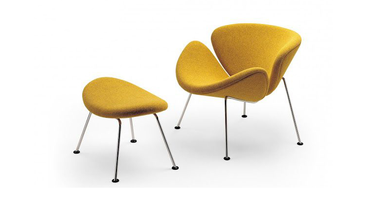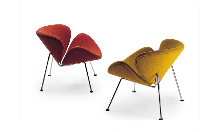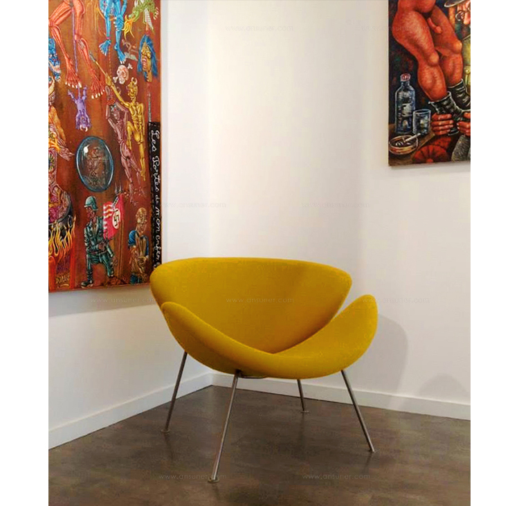 Paulin Slice Chair (橙片椅)也可以称为橘瓣椅,是由著名设计师Pierre Paulin设计的,从桔瓣椅的设计就能看出Pierre Paulin是具有国际性视野和前瞻性的前卫设计师,桔瓣椅全手工制作,针线走得直、流畅、缝线美观、均匀且自然,线条优美。这个经典的设计经历过时间的洗涤看上去仍然象刚设计出来一样。有谁看见由2片简单的橙瓣组成的颜色鲜艳椅子而不心动呢?从不同的角度,橙色片展示了几个阶段的“卷起来”。事实上,椅子几乎从每个角度看都呈现出不一样的优雅。橙片椅布料可为PU,真皮,植绒,羊绒布等多种面料,脚架为电镀铁架,颜色可多选。可用于餐厅,咖啡厅,接待厅,电影院等候室,VIP休闲室等多种商业场所。