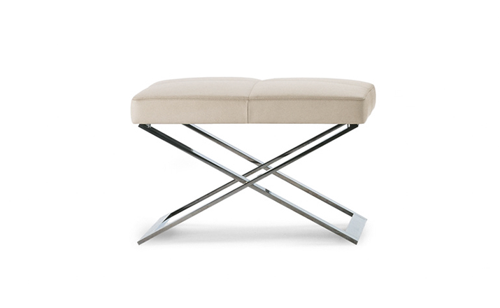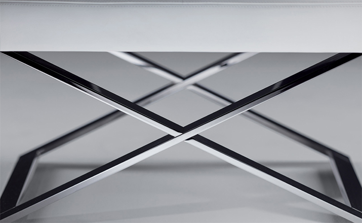 "Leather皮革椅系列家具线条干净简明,“X”交叉造型或者“H”造型脚架支撑着坐垫,新颖独特,由Jean-Marie Massaud设计。它采用外露的金属架,有三种不同的做工,座椅为聚氨酯泡沫材料,靠背较低,坐垫宽敞。有两种面料可供选择:天然皮革和纺织面料。两种款式都有皮革和染色纺织面料的扶手和同款的靠枕。沙发椅的造型形式严谨,它的特点和个性特征与Poltrona Frau现代室内家居的设计非常统一协调。