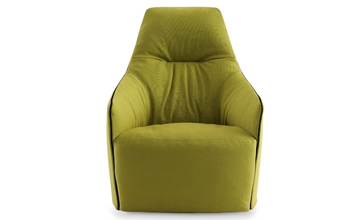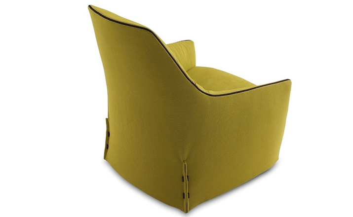 "The Santa Monica Lounge armchair,characterized by a unique design,is a project conceived by the French designer Jean-Marie Massaud,and it is produced by Poliform,a leading company in the made in Italy furniture manufacture.The Santa Monica Lounge armchair on sale in our showroom is matched with the Santa Monica ottoman.Both the items are covered in fabric,yellow colour,with iron coloured stitches."