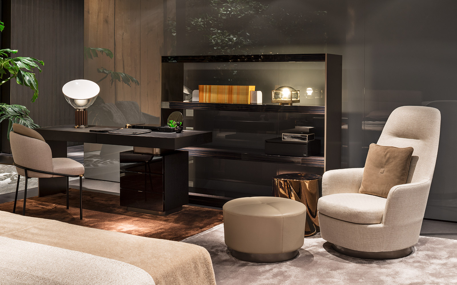 软垫座椅搭配优雅修长的椅腿,其材质为亚光黑色的金属管,亮光金色、黑镍金属色或浅铜色的细节使其倍显精致。