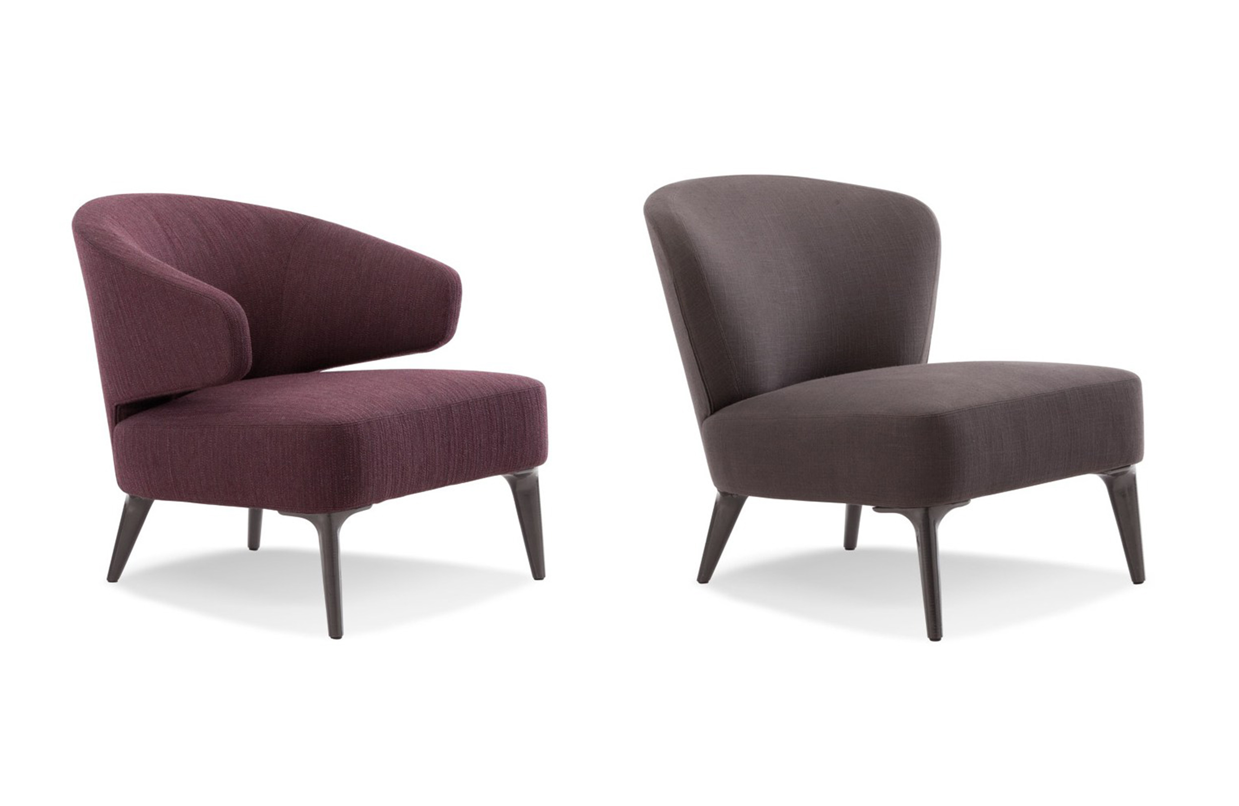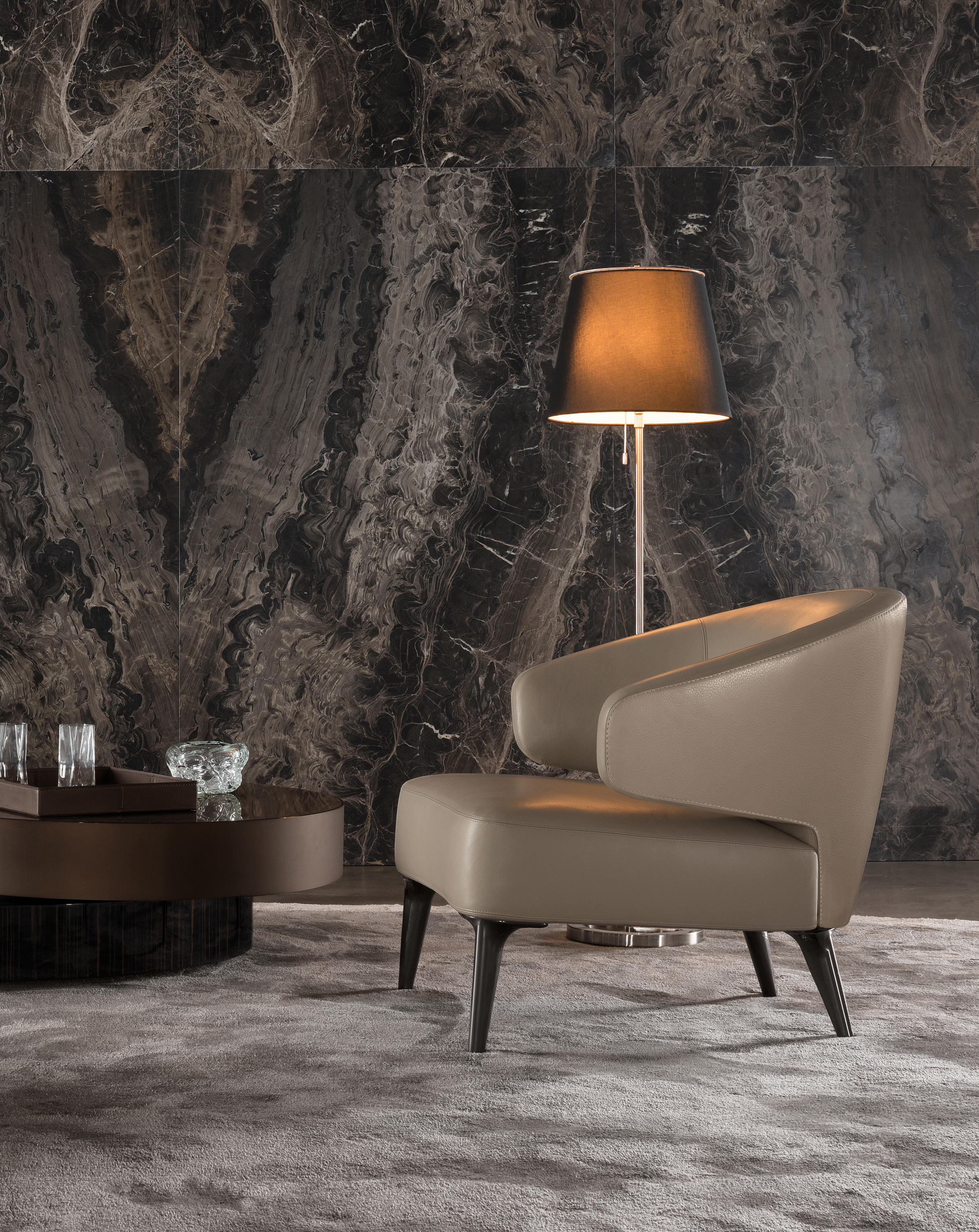 沙发的围裹式靠背特色十足,扶手线条与之完美呼应,以蓝灰色调呈现的压铸铝合金支脚尽展精致设计之美。
