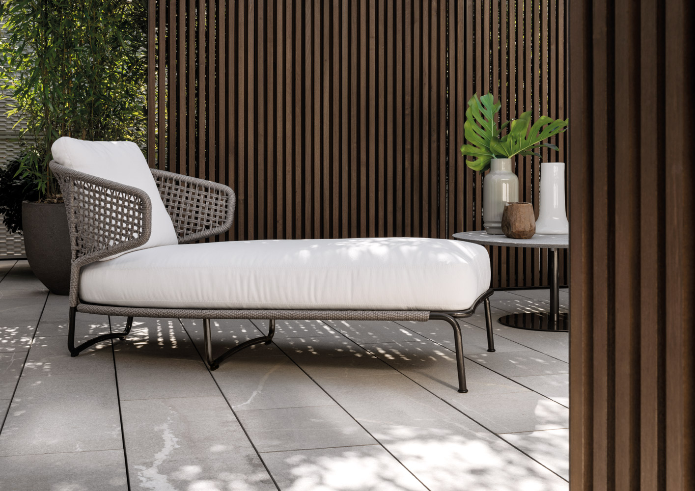 Aston是一个单品家族系列,其中包括沙发、沙发床、扶手椅、脚凳、座椅,为家居环境和“共享空间”提供优雅而时尚的装饰,在室内和室外皆可应对自如。阿斯顿“绳”户外系列采用金属材质的构架,搭配Pewter色聚酯漆面,部件都针对户外环境而经过特别处理,覆面采用疏水性纤维面料。靠背采用直径为7毫米的特殊聚丙烯纱线编织而成,两种颜色可供选择:浅灰色和深棕色,与全新Art Lifescape 02系列的面料和Alison “Dark Brown”户外系列的色调相得益彰。针对户外环境的特点,金属构架经过特别处理,搭配Pewter色聚酯漆面,覆面采用特殊聚丙烯纱线编织而成,有两种颜色可供选择:浅灰色和深棕色。坐垫采用Minotti Studio独家设计并通过激光加工而成的几何装饰。靠垫的内部填充物是高弹性聚氨酯泡沫,覆面采用疏水性纤维面料。