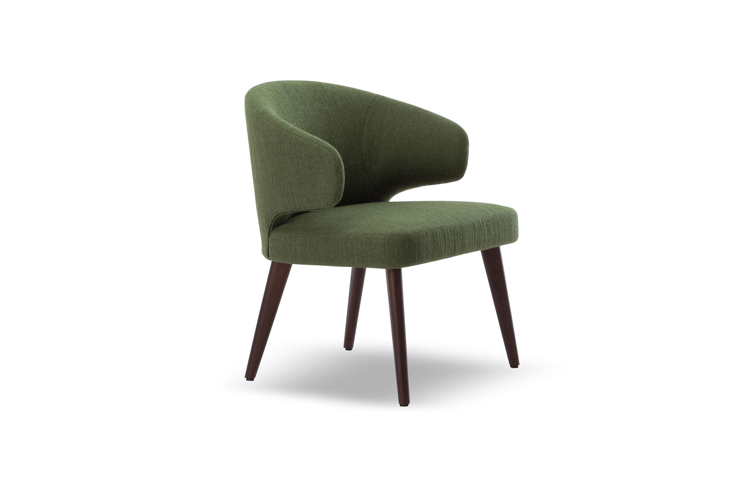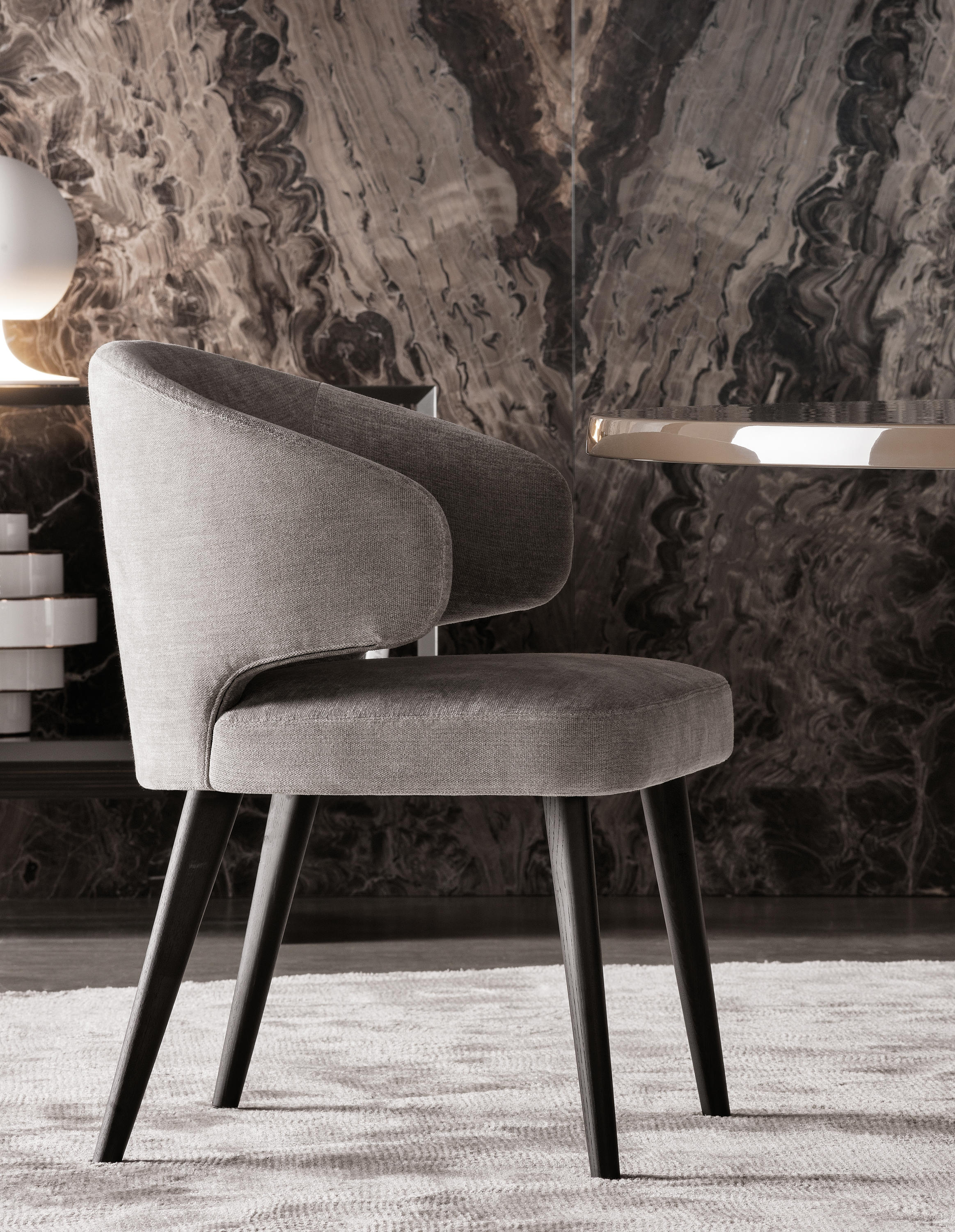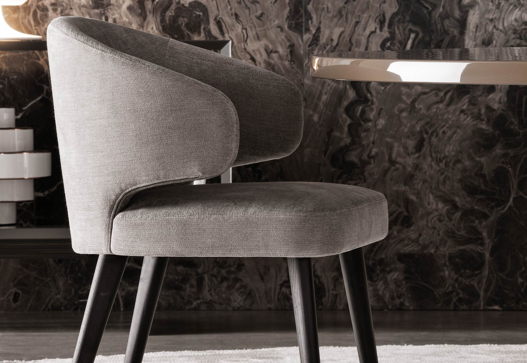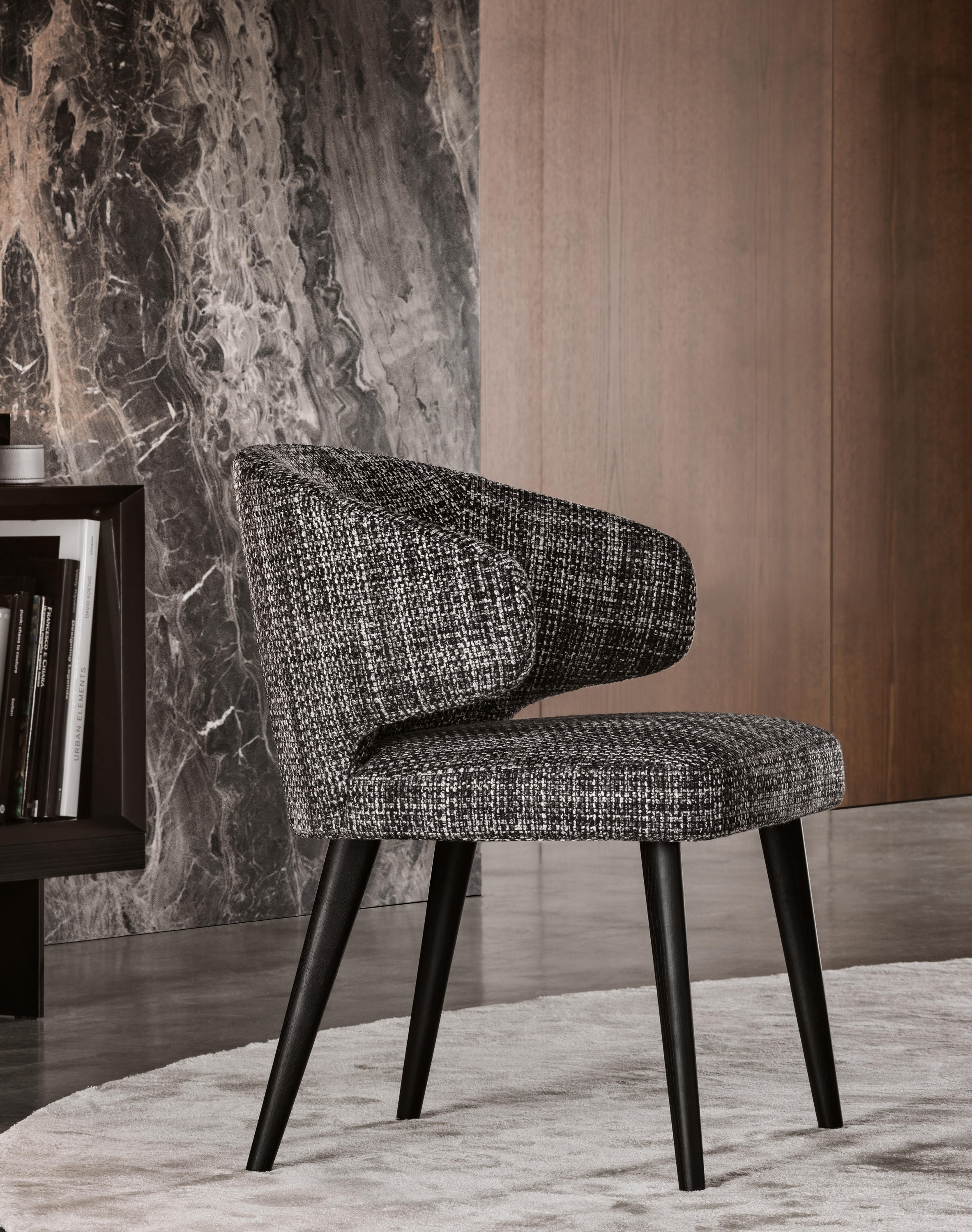 沙发的围裹式靠背特色十足,扶手线条与之完美呼应,以蓝灰色调呈现的压铸铝合金支脚尽展精致设计之美。