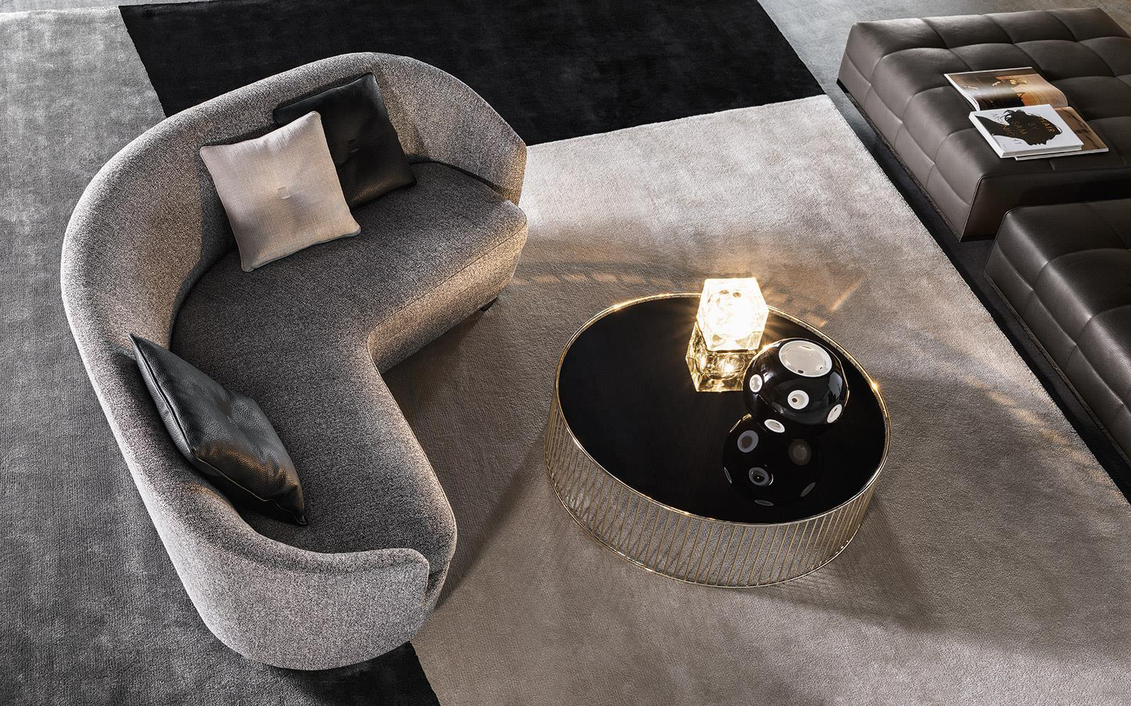 柔和的造型、紧凑的比例和具有视觉冲击力的细节呈现出精致的美学语言,金属基座采用淡铜色的表面设计。