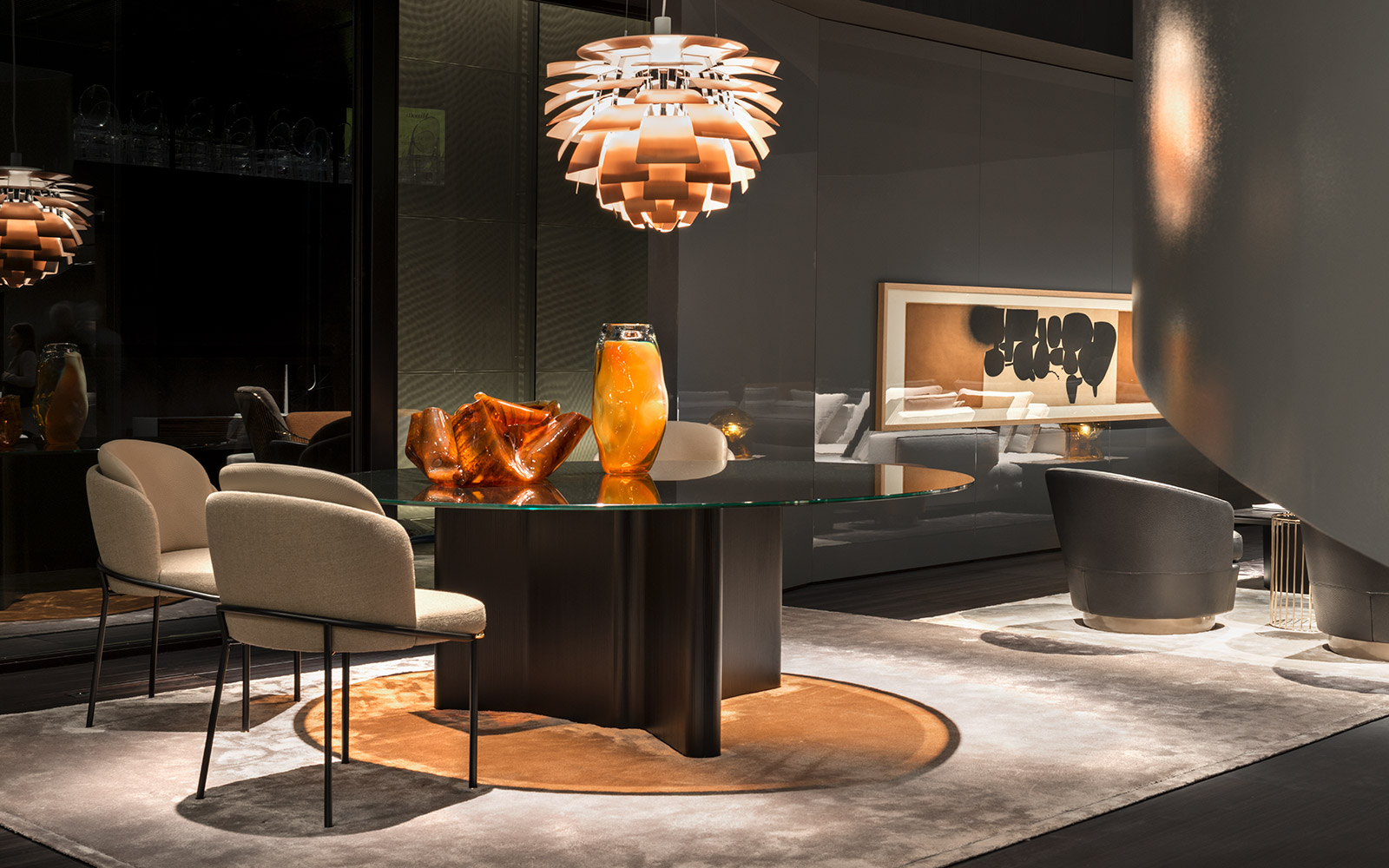 柔和的造型、紧凑的比例和具有视觉冲击力的细节呈现出精致的美学语言,金属基座采用淡铜色的表面设计。