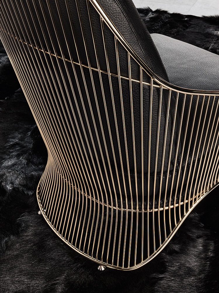 Colette扶手椅的制造过程相当复杂。外部的金属构架经过压延和装配,焊接点超过三百个。特殊的金属表面源于在淡金色的液池中进行电镀的工序以及透明的保护涂层,在此基础上拥有刚度和深度。座椅结构前方搭配地面支撑件,采用聚氨酯泡沫制成,内部插入金属件,绑带的设计使其具有一定的弹性,从而保证绝佳的舒适度。 坐垫和靠背完美搭配构架的设计。