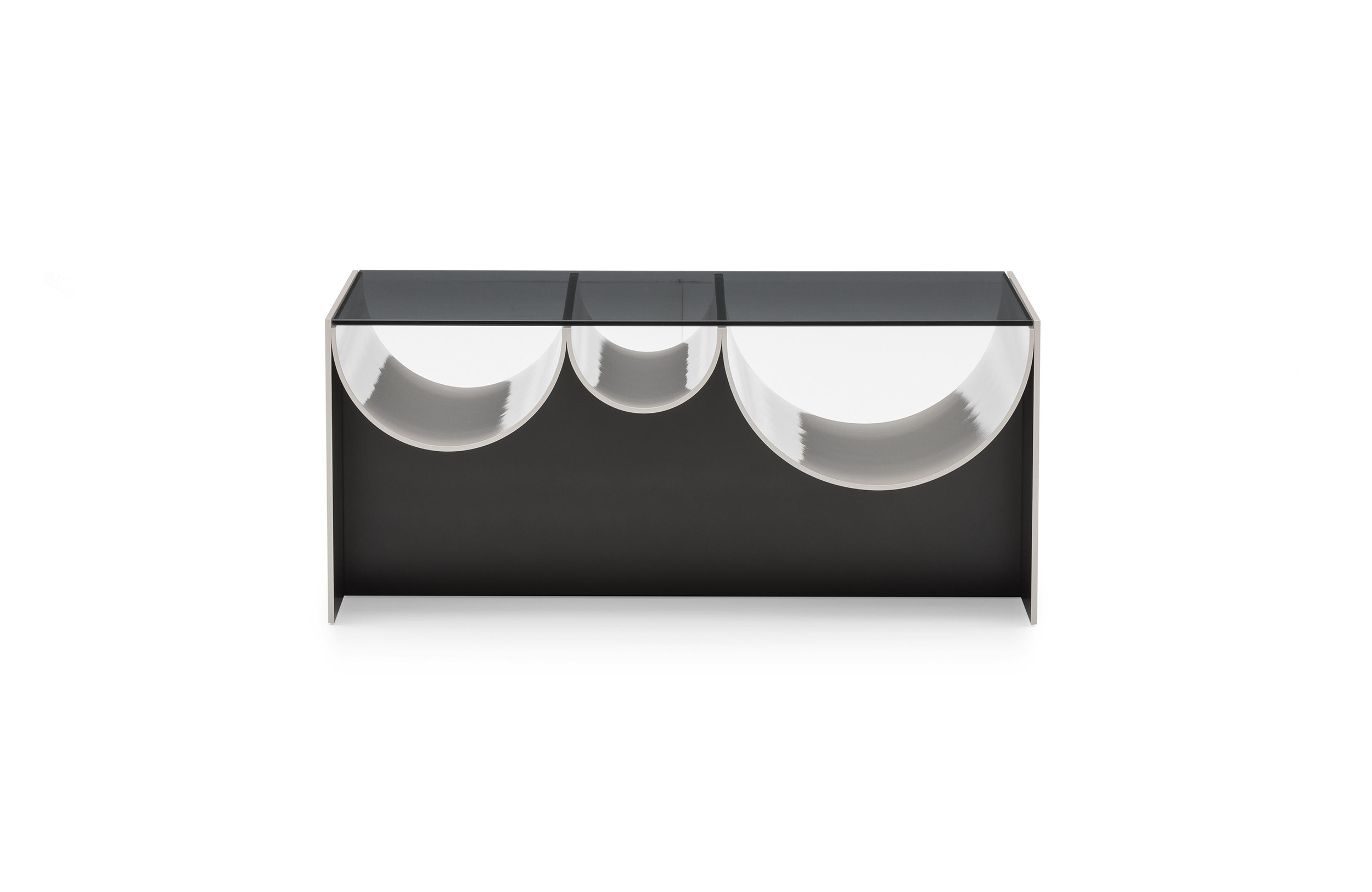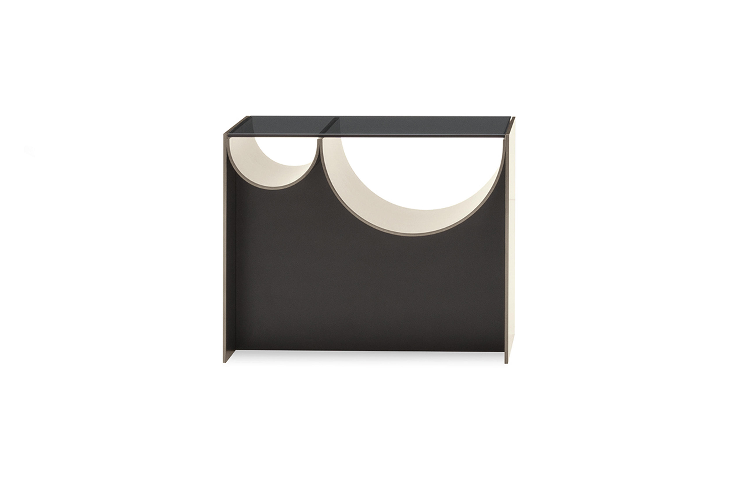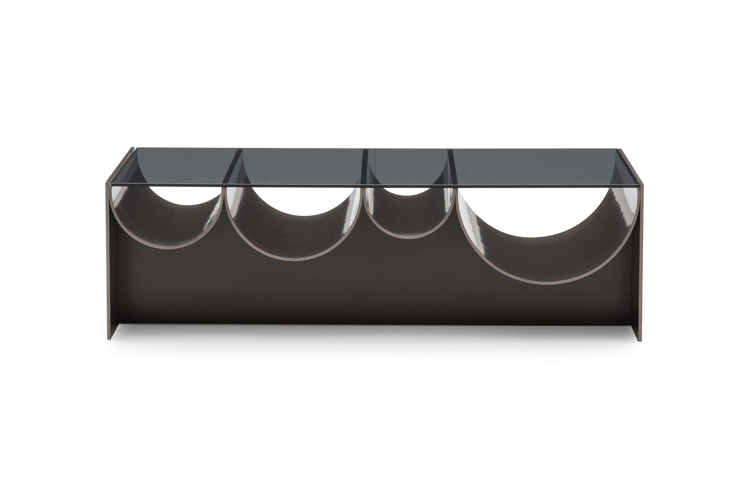 波浪咖啡桌是由一种烟熏的灰色玻璃制成的,它由一种漆成的铝结构支撑着,外面是一种沙子或浅青铜色的色调,里面有一种淡黄色的色调。