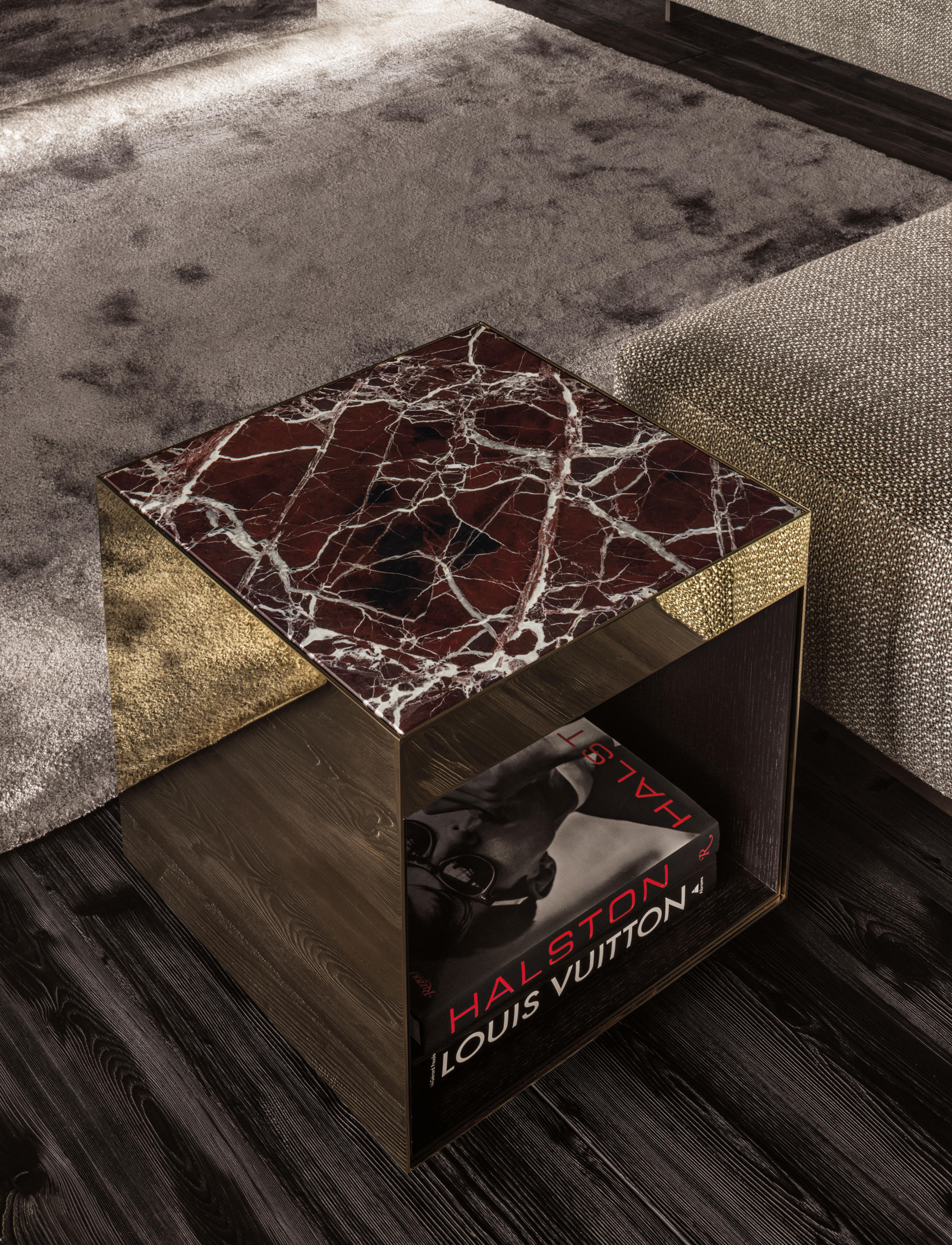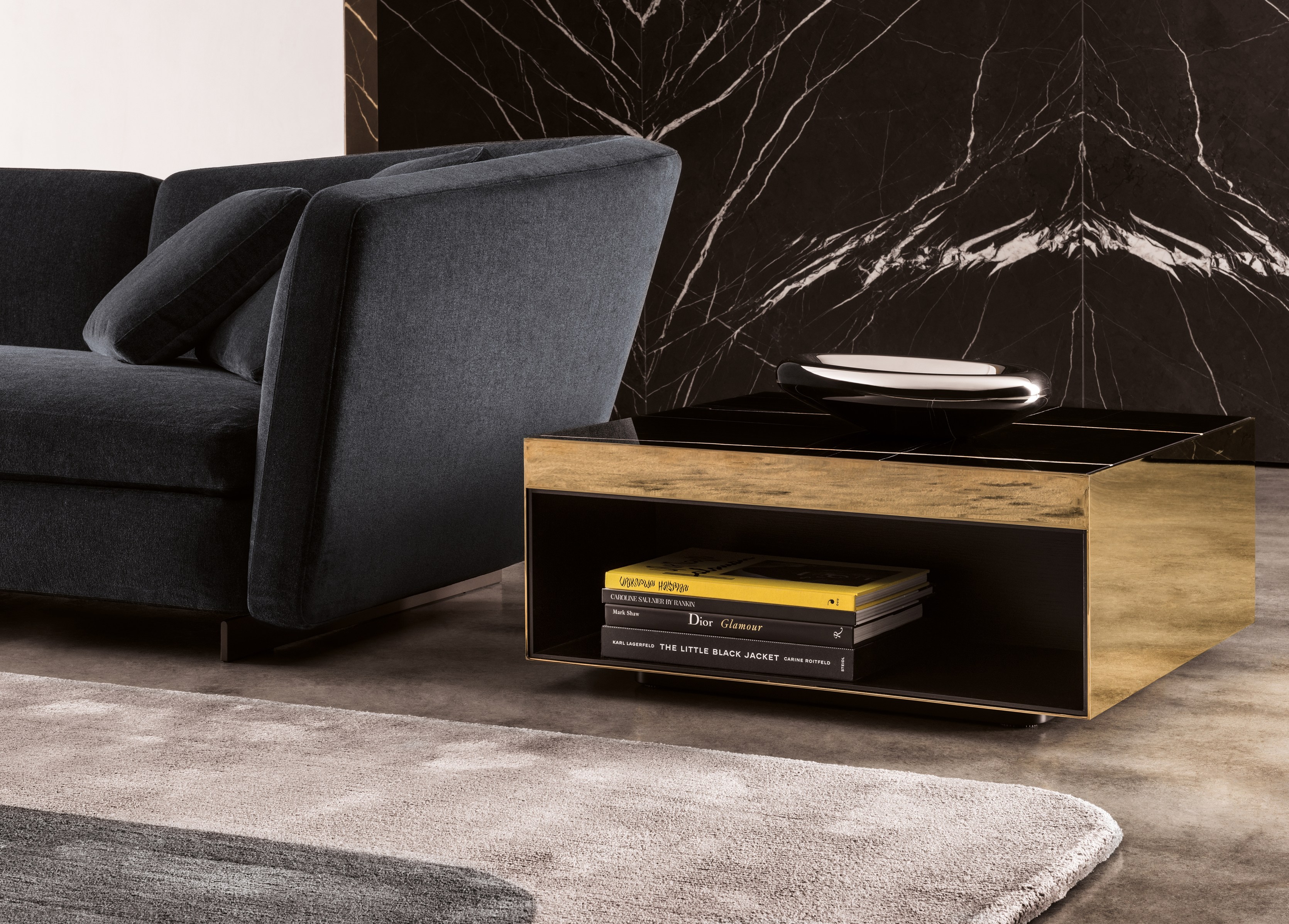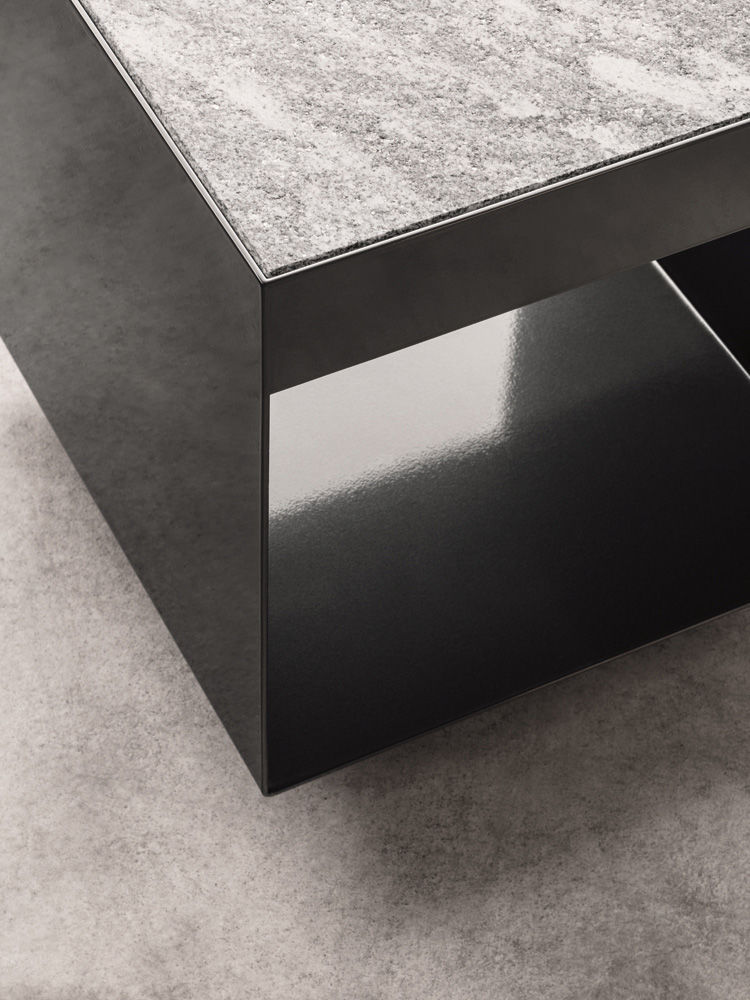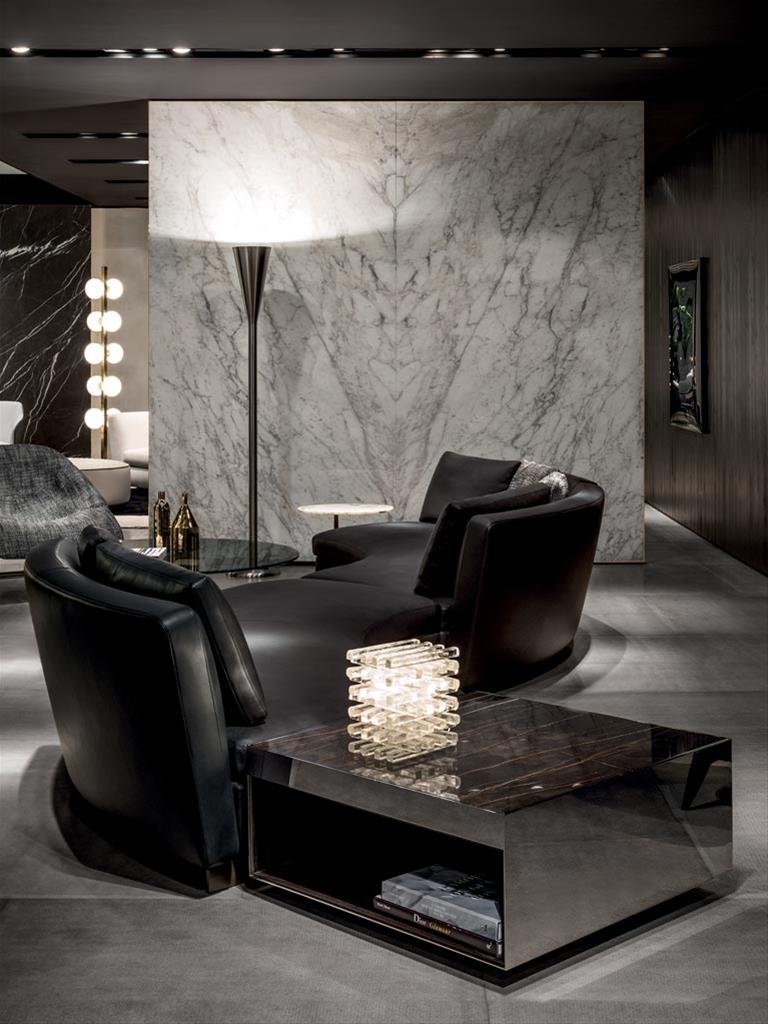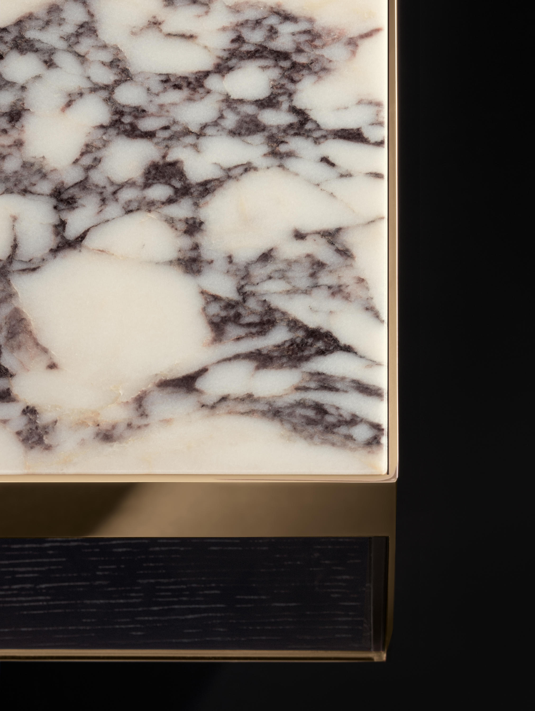 这是用于收纳贵重物品的边几系列,拥有纯粹而简洁的美学设计,有着精美绝伦的多种材质组合。这一边几家族拥有华贵的美学特质,因而也有着非同一般的功能,在提供实用置物表面的同时,呈现精美的装饰效果,具有50年代和60年代的米兰设计风格。金属构架的表面有亮铬色、亮金色和亚光铜色,嵌入构架的台面可谓画龙点睛,选用多种珍稀的大理石材质,其中包括Arabescato Purple、Sahara Noir和Rosso Levanto,或是Moka色的白蜡木、Moka色橡木。从建设性的角度来看,Elliott边几的内部储物空间可以用于摆放杂志或其他物件,有花岗石色的亮面漆或Moka色开孔橡木可供选择。金属材质的外部框架搭配包覆木质的内部框架,以此可以看出工艺的复杂性,同时平添一份温暖的质感,展现Elliott边几的名贵特质。