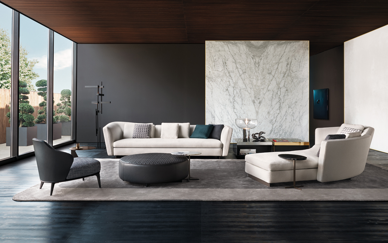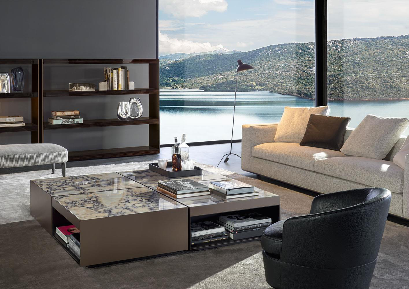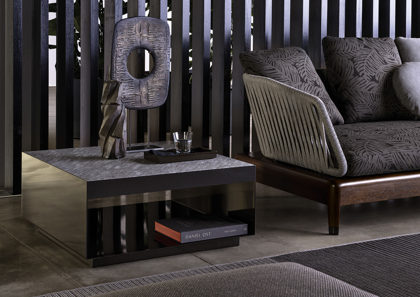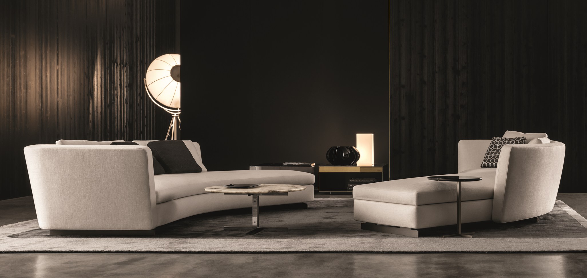 这是用于收纳贵重物品的边几系列,拥有纯粹而简洁的美学设计,有着精美绝伦的多种材质组合。这一边几家族拥有华贵的美学特质,因而也有着非同一般的功能,在提供实用置物表面的同时,呈现精美的装饰效果,具有50年代和60年代的米兰设计风格。金属构架的表面有亮铬色、亮金色和亚光铜色,嵌入构架的台面可谓画龙点睛,选用多种珍稀的大理石材质,其中包括Arabescato Purple、Sahara Noir和Rosso Levanto,或是Moka色的白蜡木、Moka色橡木。从建设性的角度来看,Elliott边几的内部储物空间可以用于摆放杂志或其他物件,有花岗石色的亮面漆或Moka色开孔橡木可供选择。金属材质的外部框架搭配包覆木质的内部框架,以此可以看出工艺的复杂性,同时平添一份温暖的质感,展现Elliott边几的名贵特质。
