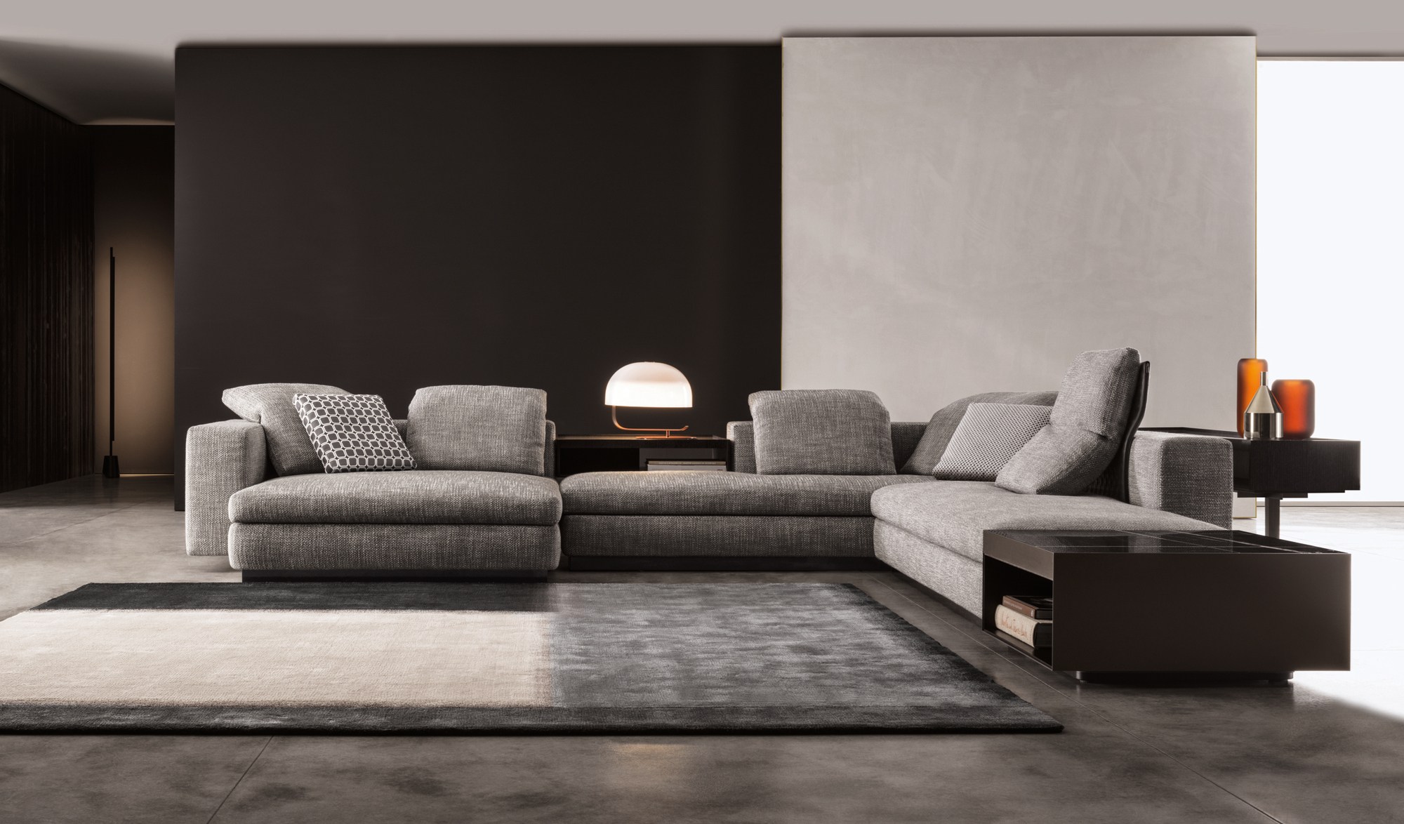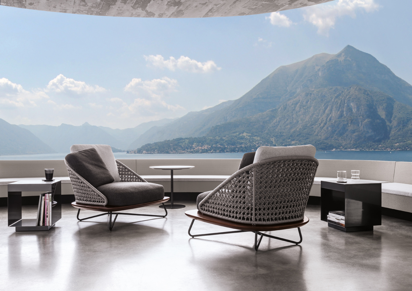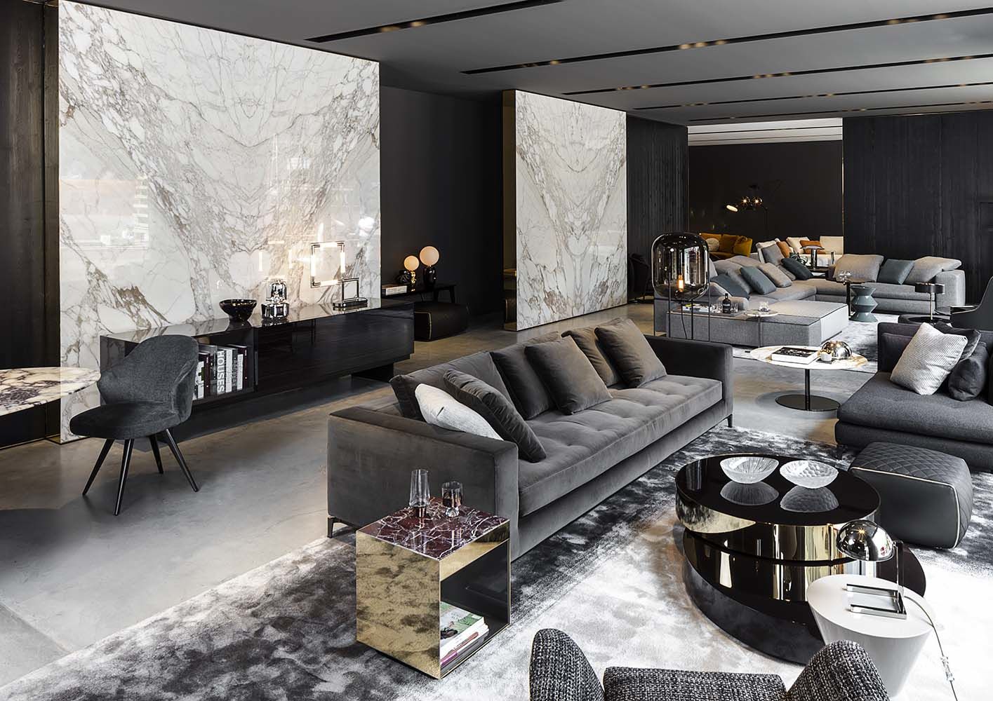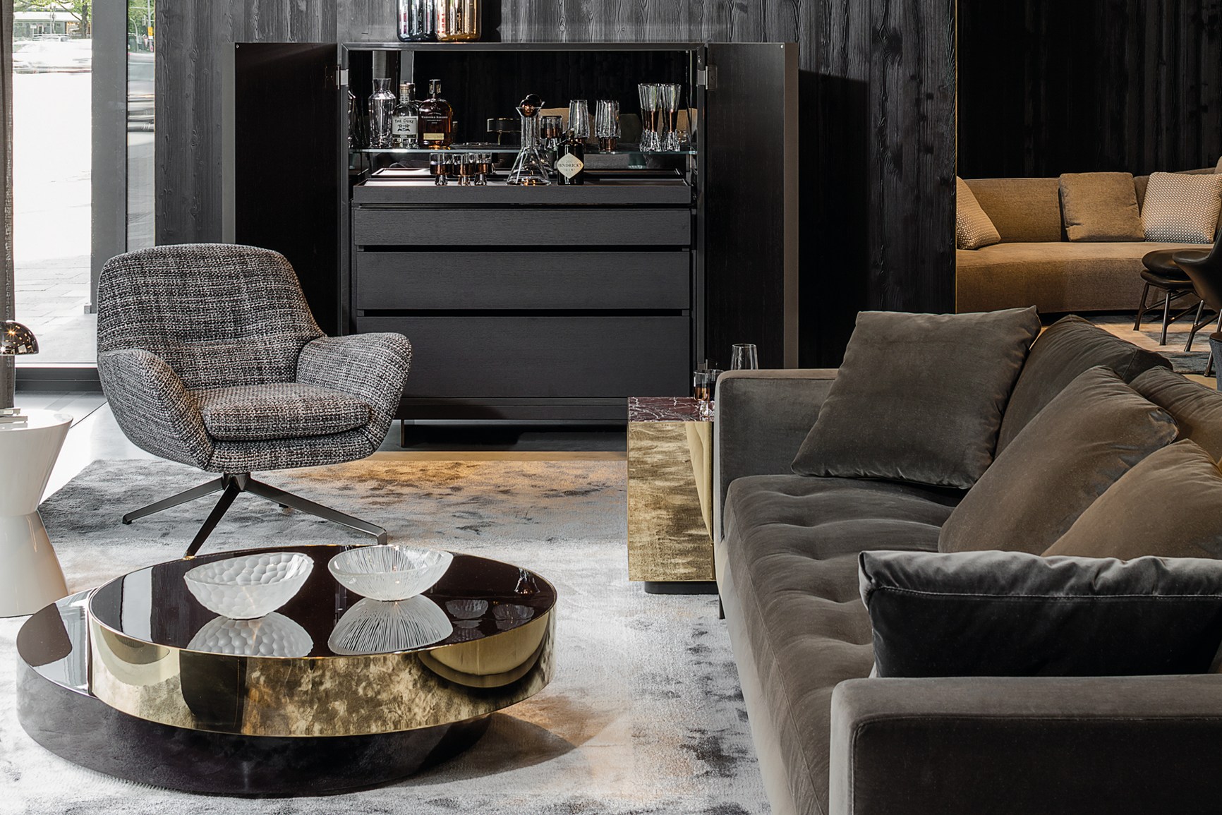 这是用于收纳贵重物品的边几系列,拥有纯粹而简洁的美学设计,有着精美绝伦的多种材质组合。这一边几家族拥有华贵的美学特质,因而也有着非同一般的功能,在提供实用置物表面的同时,呈现精美的装饰效果,具有50年代和60年代的米兰设计风格。金属构架的表面有亮铬色、亮金色和亚光铜色,嵌入构架的台面可谓画龙点睛,选用多种珍稀的大理石材质,其中包括Arabescato Purple、Sahara Noir和Rosso Levanto,或是Moka色的白蜡木、Moka色橡木。从建设性的角度来看,Elliott边几的内部储物空间可以用于摆放杂志或其他物件,有花岗石色的亮面漆或Moka色开孔橡木可供选择。金属材质的外部框架搭配包覆木质的内部框架,以此可以看出工艺的复杂性,同时平添一份温暖的质感,展现Elliott边几的名贵特质。