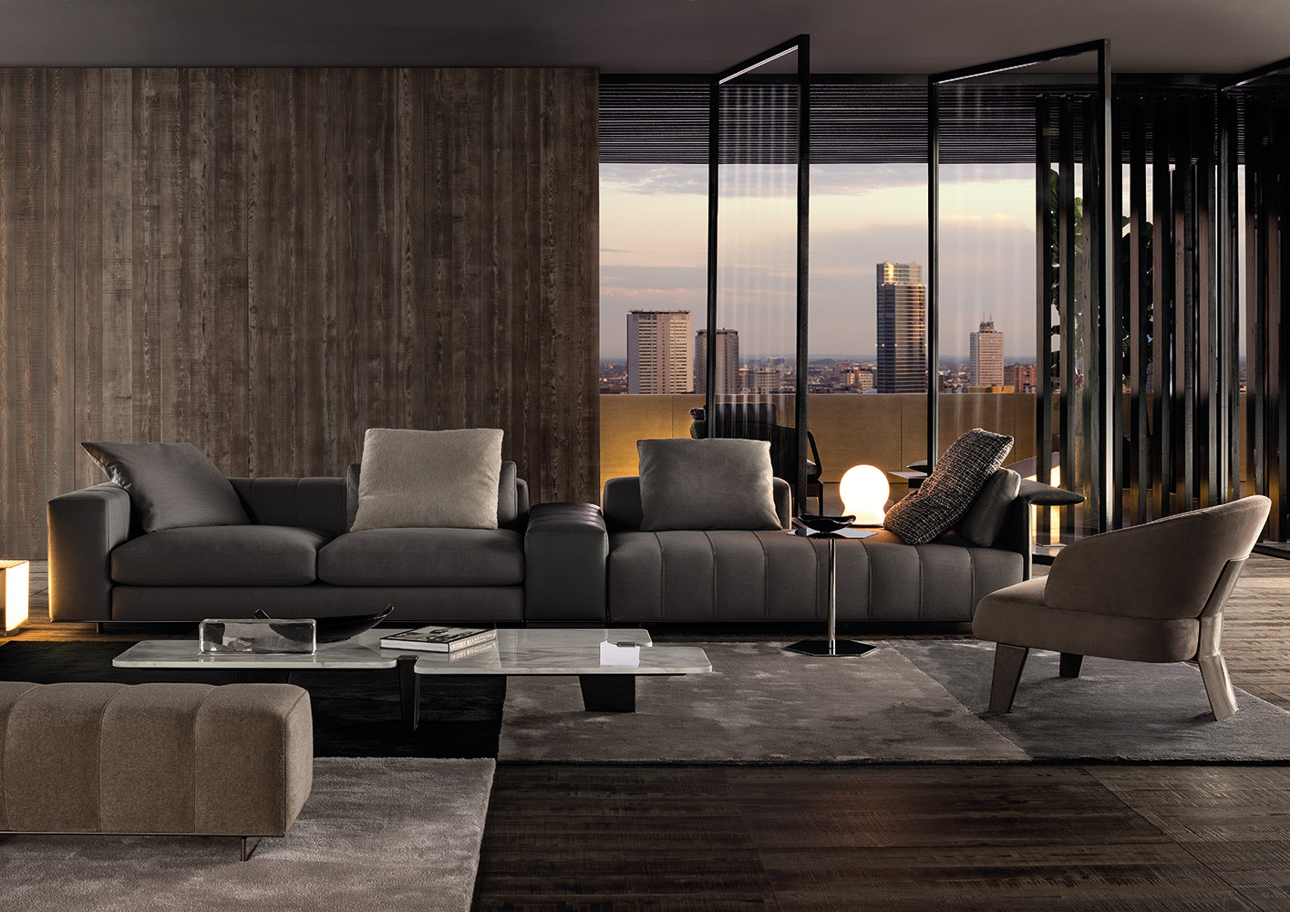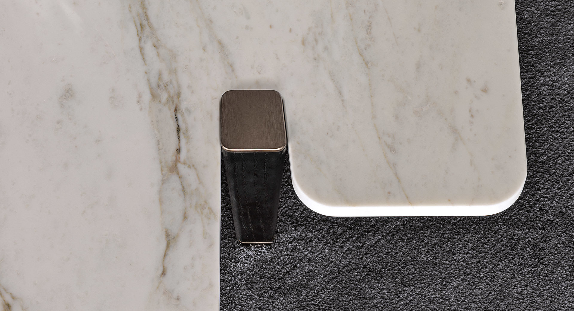 大理石是具有永恒魅力的材质,也为这组边几系列带来了优雅独特的灵感,产品摆放位置灵活多样,饰面种类繁多,此外还有多种造型和尺寸可供选择。桌面造型别具一格,支撑腿为黑色漆面的实心拉丝橡木。地面支撑的末端以及支撑腿顶端的部件采用铜色金属材质,这一细节设计为这款个性十足的产品平添一份精致的优雅感。饰面有不同材质可供选择:从米灰色的鲍迪豆木饰贴面,到精致考究的Calacatta或Bardiglio Nuvolato大理石台面,还有极具现代感的Sand色和灰褐色的亮光漆面。圆形桌面的边几样式不仅有米灰色的鲍迪豆木饰贴面,还有蓝绿色、花岗石色和Sand色的彩绘玻璃饰面。除了边几以外,Jacob家族的成员还包括一款写字台,其桌面样式有Sand色和灰褐色的亮漆饰面,还有米灰色的鲍迪豆木饰贴面。写字台还配有哑光黑漆的木制抽屉。