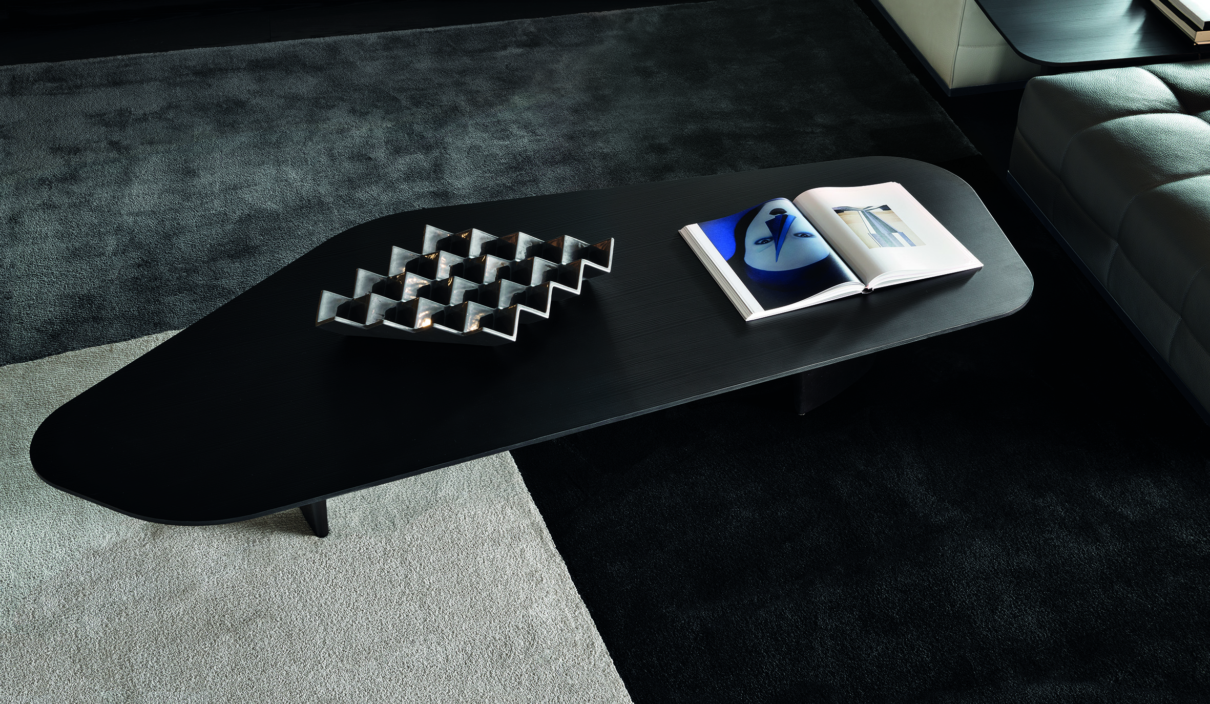 Song边几的基座完全采用黑色漆面的实心拉丝白蜡木制成,体现出非凡的家具制作传统。台面的细加工则体现出不同寻常的材料之选和精致的色彩方案,每一种饰面都对台面风格做出不同的诠释。