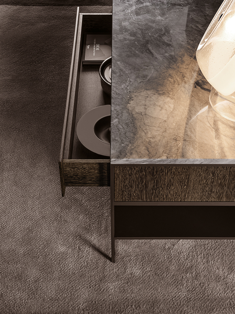 Calder家族有各种尺寸的边几和边桌,这一组全新的设计方案为其带来更为清新时尚的造型。铁架结构如今采用亚光浅铜色的表面。桌面也推出新版本:Sand色亮漆,米灰色的鲍迪豆木饰贴面,Bardiglio Nuvolato和Calacatta的大理石。中间层的桌面也为亚光浅铜漆面的金属。