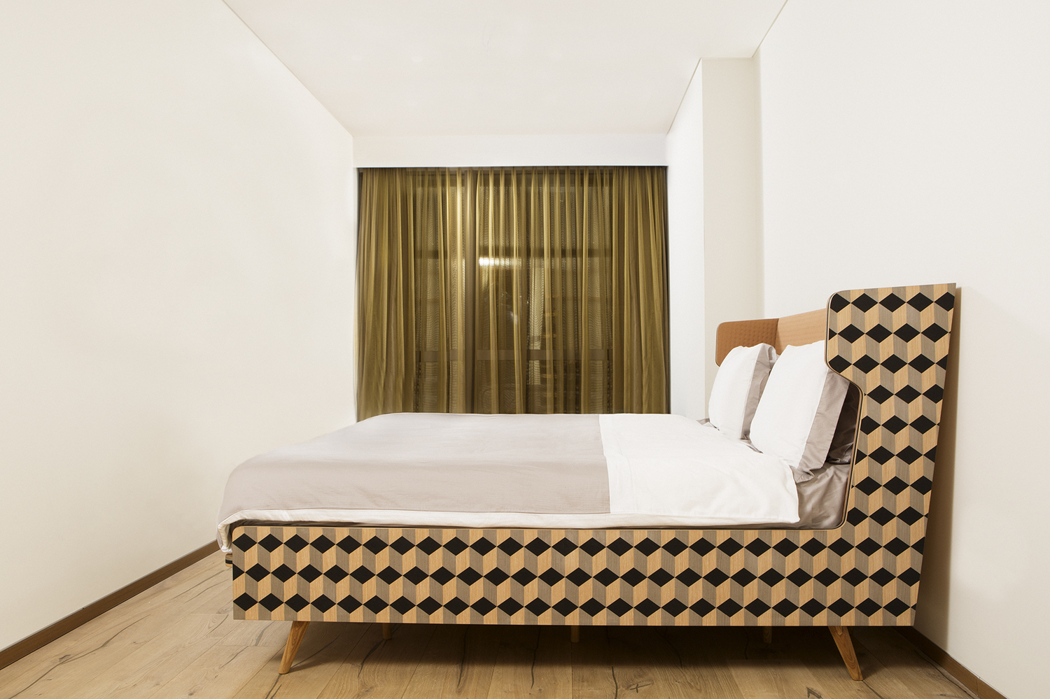 Dip Bed是Dip Collection的新添加产品。使用与凳子相同的材料制作的;美国白橡木和三种不同颜色的木材单板和深橙色的Kvadrat室内装潢组合在床头板上使用。床的边缘上的3个彩色的线性细节被设计来完成侧面的图案。这件作品是由伊斯坦布尔有才华的工匠手工制作的,它的独特的美学外观让人感觉舒适。