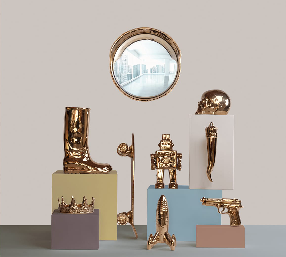 与Memorabilia系列一样,Memorabilia Gold是一系列独立装饰品,让人想起文化或历史事件,这也增加了兴趣点。 “我的滑板”实际上被设计用作食品拼盘,用于寿司或冷肉等食品,体现了Seletti对功能性艺术的热爱!