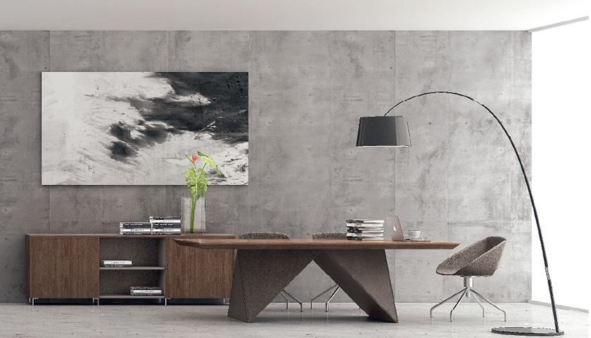 威睿系列,最大的亮点是独特的切割面。打破整体划一的家具造型模式,采用几何体构造设计手法,大尺度楔形宽体切面造型,如钻石的刻面与腰面错落有致,造出流畅的线条感。将现代建筑设计元素融入现代办公空间,结合整体布局配套延展,打造办公家具时尚前沿。主桌采用皮木覆膜工艺,机车缝合明线效果处理,浅胡桃皮木与皮椅搭配,整个空间充斥着个性化对比,金属材质简洁明快,流露出一种低调的奢华与睿智,配合银灰色的空间墙面,使得办公家具与整体的风格一脉相承。"