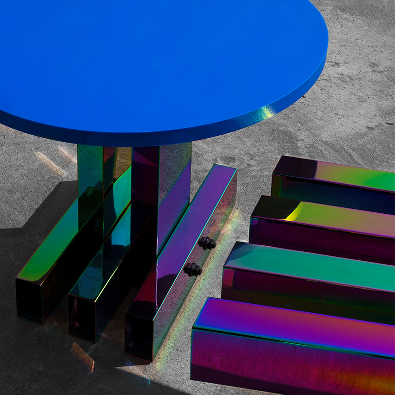 横竖横竖重复的组合方式,是来自草根的语言。常见工地搭台、围板,木方条拼组的,只需一次性的耐用而形成粗暴又稳固的结构方式。 极其炫丽浮夸的幻彩与粗鲁蛮横的草根形式形成反差,产生迷幻、跳脱、超现实的戏剧感受,似乎欲望的幻相,真实得不切实际。