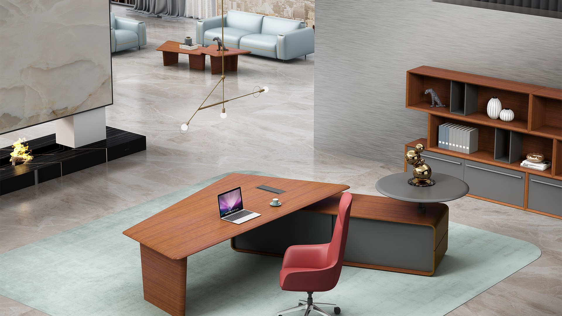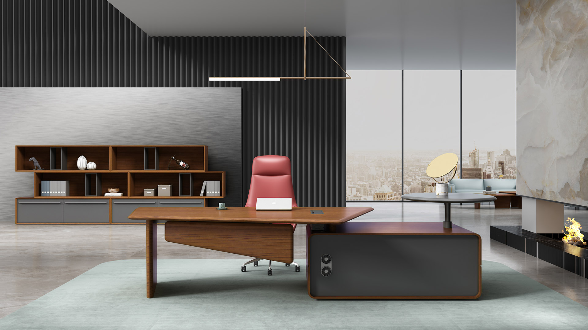 独特的台面造型,更好的兼顾了接洽的功能,是台面的功能 进一步延伸,给来访者提供更多的位置与空间。倾斜的侧柜 也让使用者有更大的活动空间,带来更广阔的视野。