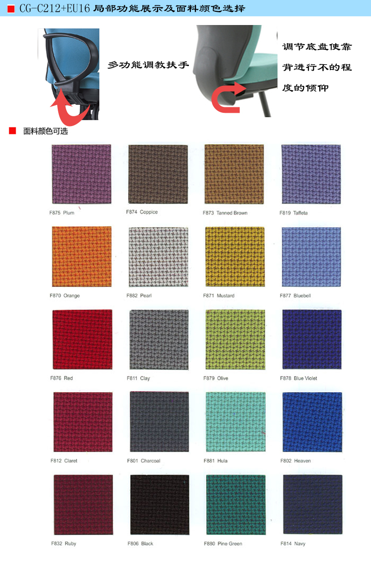 1、椅背:采用高密度高弹力海绵,精织透气布,长久耐用。靠背可倾仰。2、扶手:优质PP扶手架,牢固耐用,手感舒适。