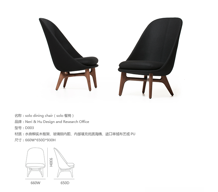 Solo Dining Chair(Solo餐椅)是Neri & Hu工作室设计的作品,设计灵感来着伊姆斯夫妇设计的贝壳椅,Solo椅将伊姆斯夫妇标志性的贝壳椅重新设计的更加精致、舒适,适用在家具和商业。Solo椅有柔软的外壳,舒适的人体工学,更注重私人空间,看起来更加独立于周围环境,使人有种神秘感。