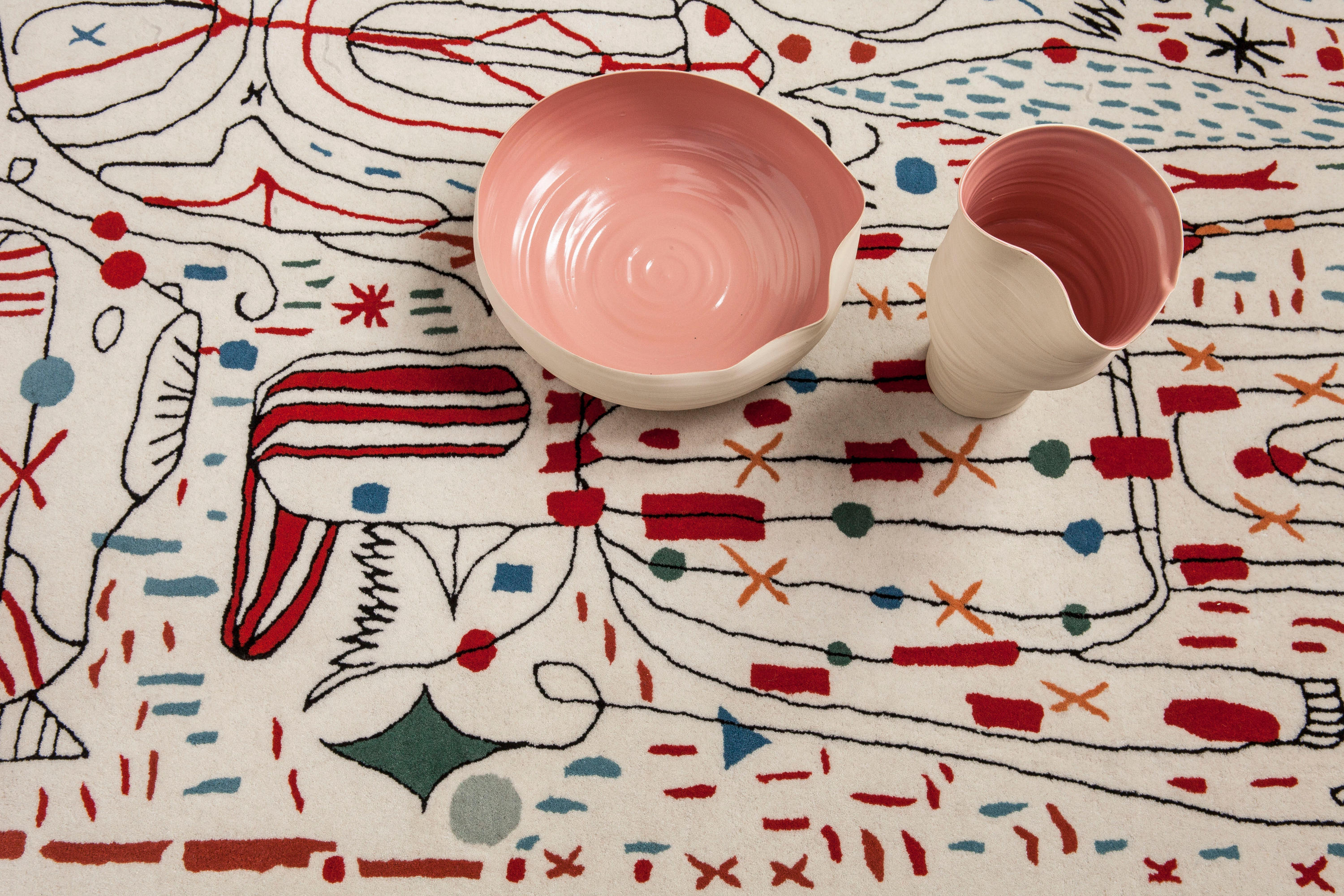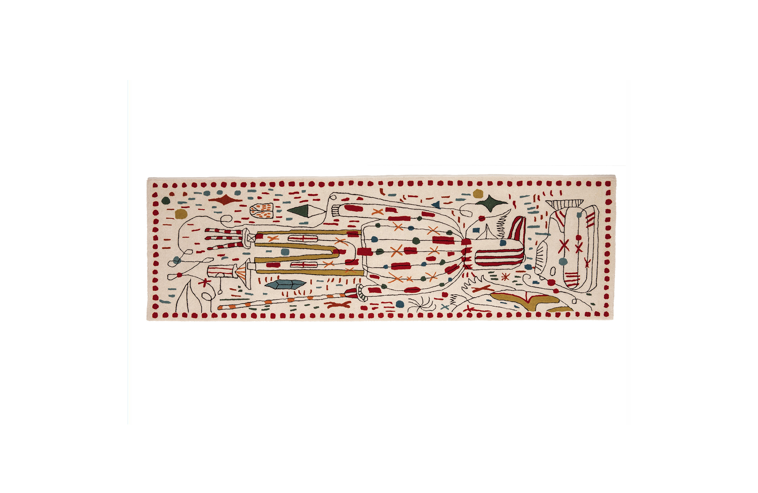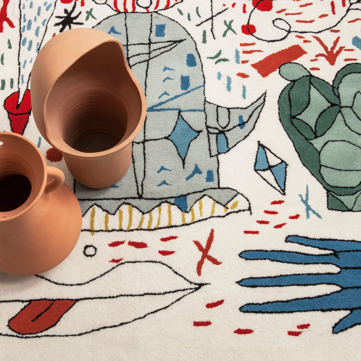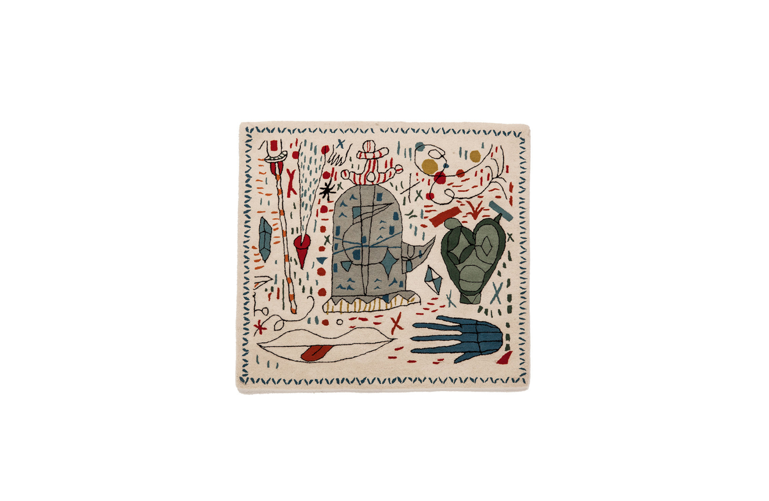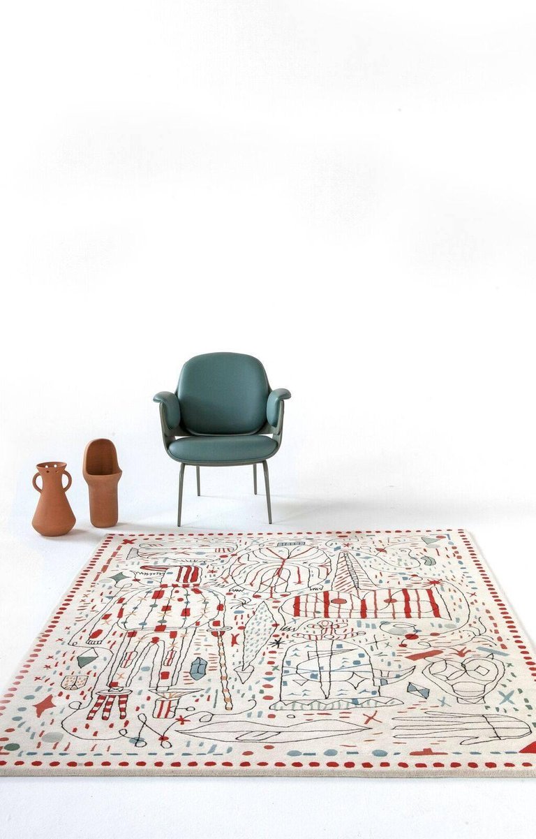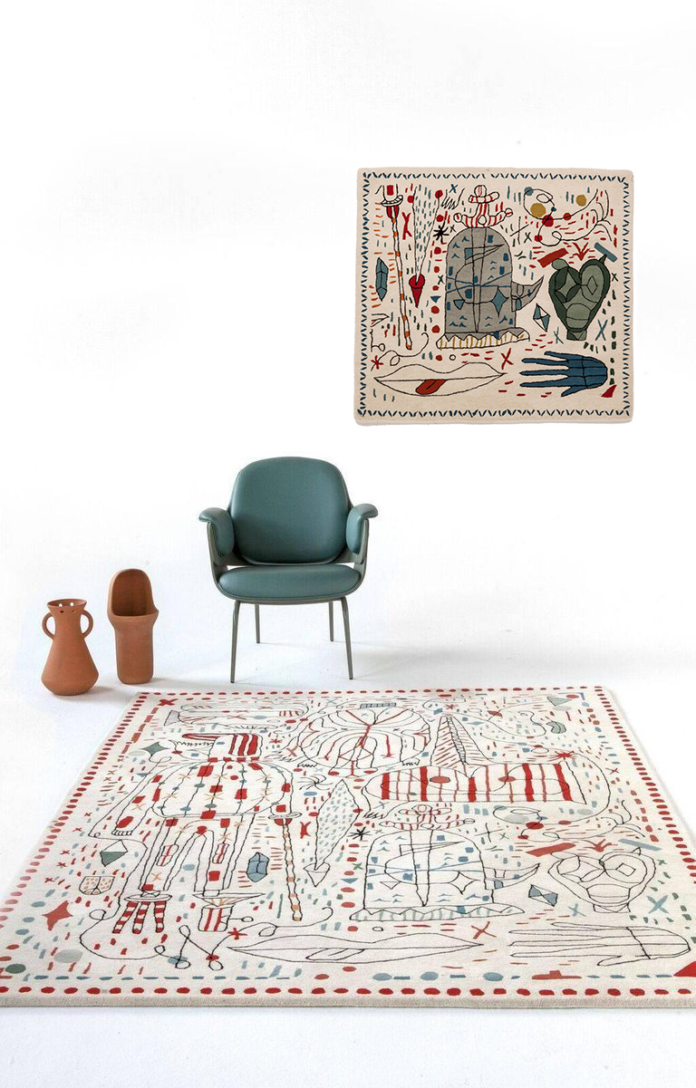 第一眼看到的是一片混乱的颜色和形状,它们侵入了地毯。然而,在仔细看,Jaime海因弹簧的想象力生活:海龟、嘴唇,手,凳子,鱼,男人等等...