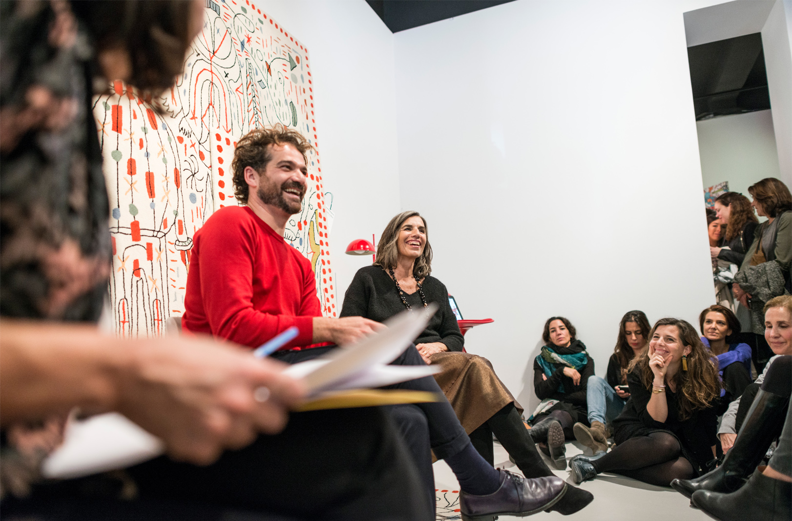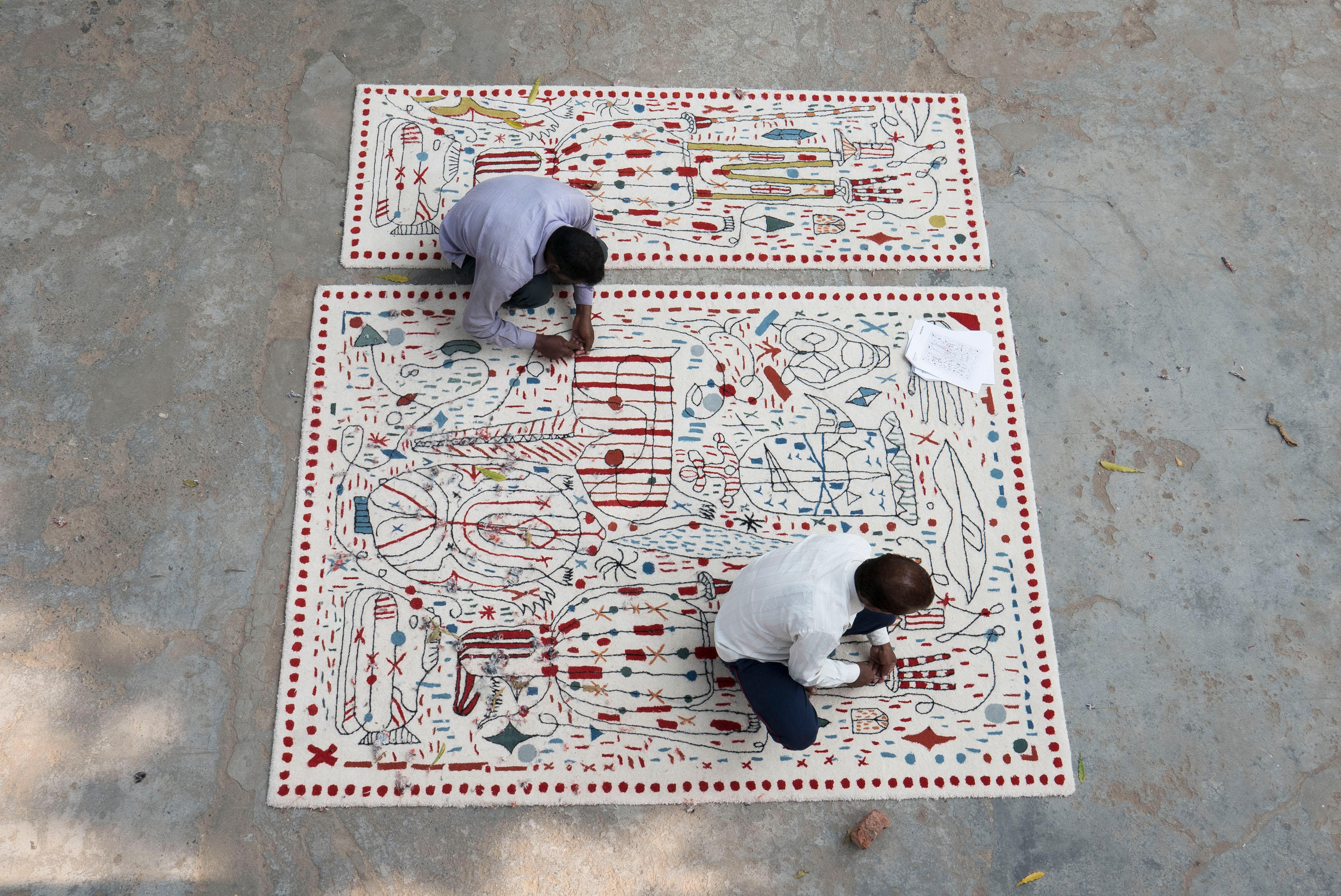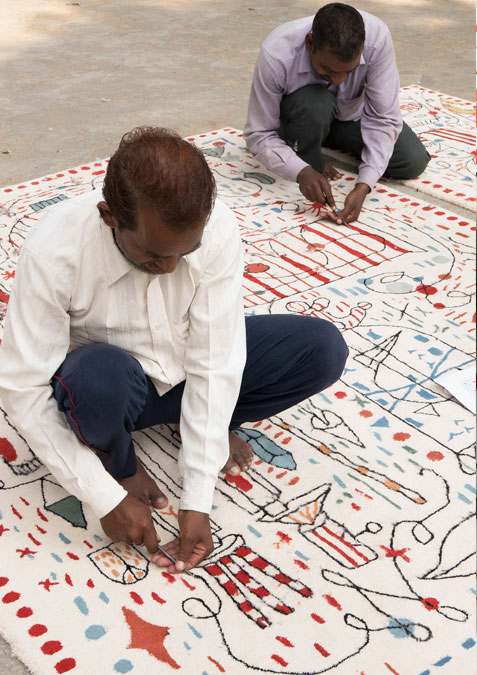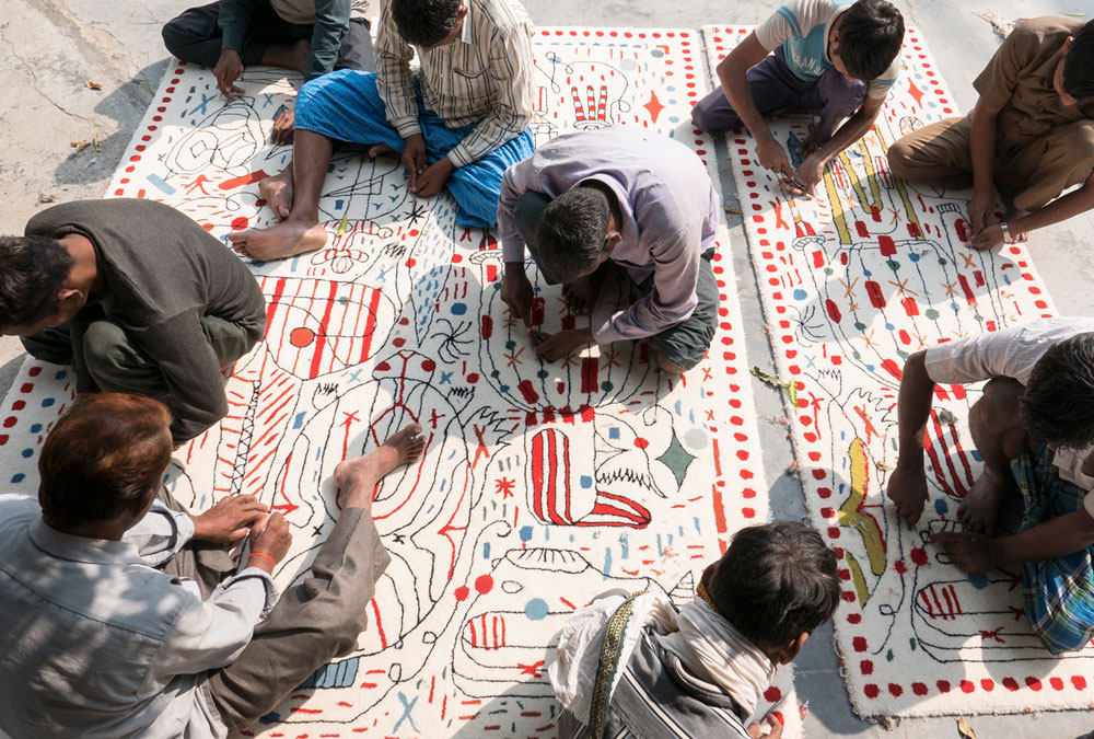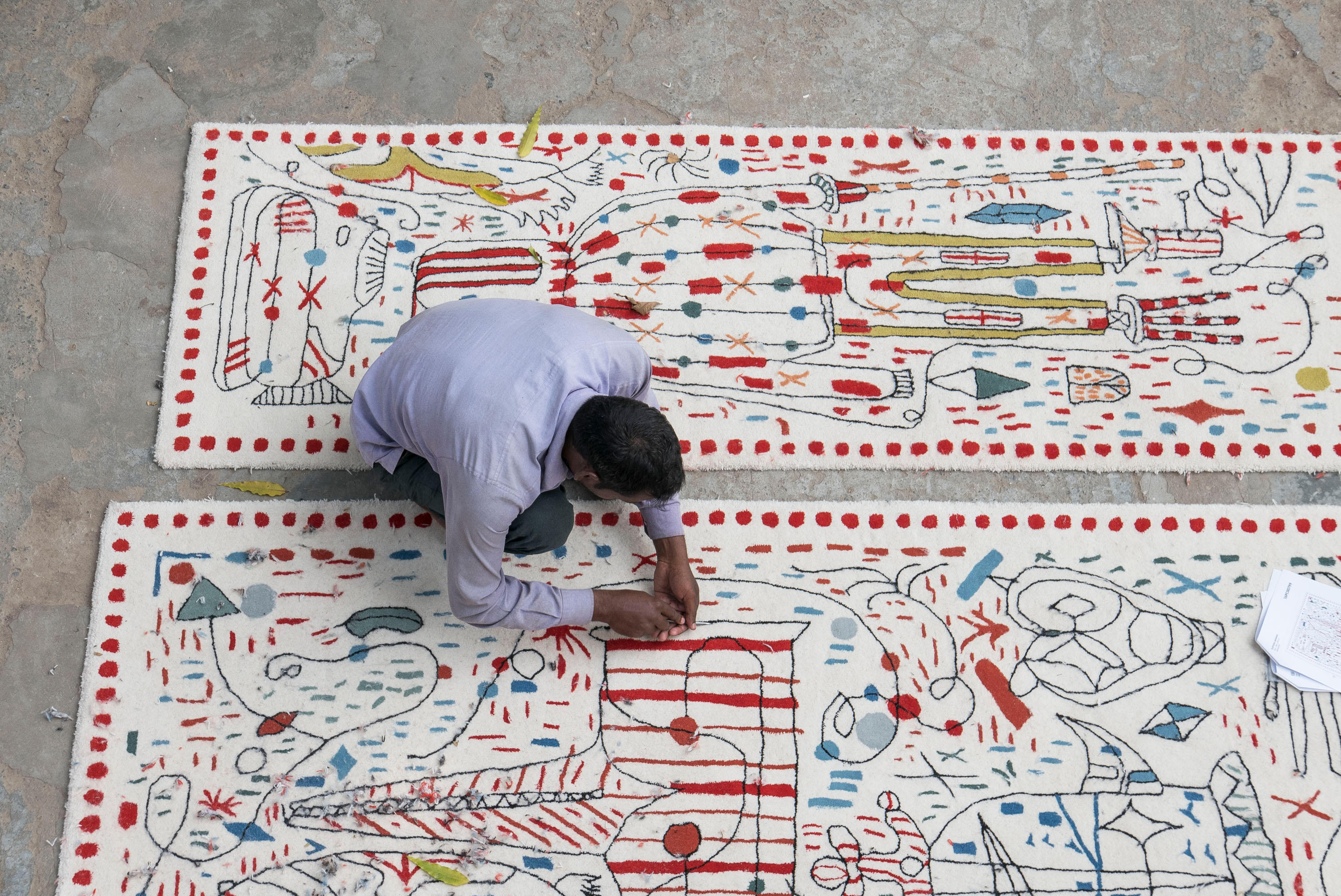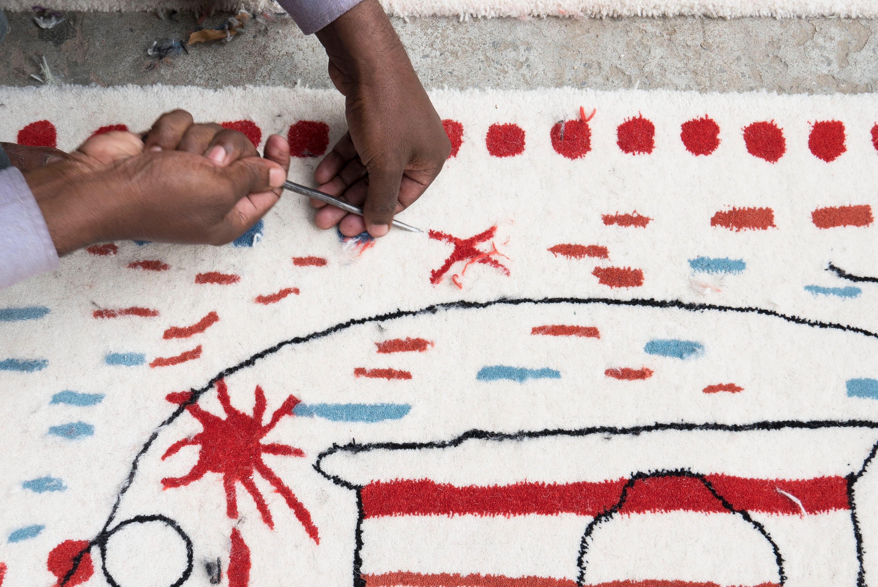 第一眼看到的是一片混乱的颜色和形状,它们侵入了地毯。然而,在仔细看,Jaime海因弹簧的想象力生活:海龟、嘴唇,手,凳子,鱼,男人等等...