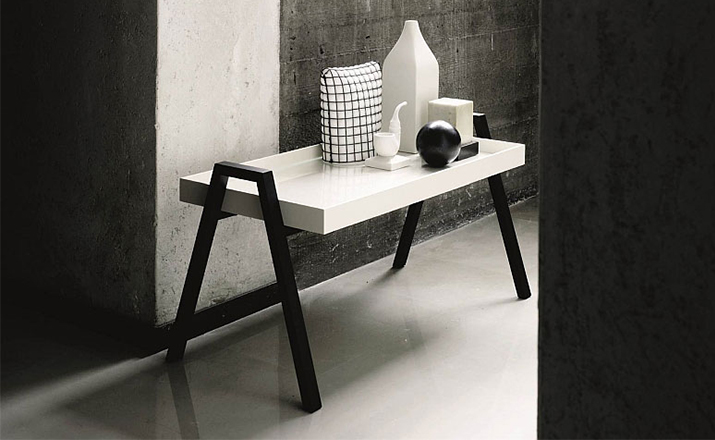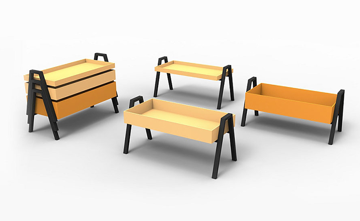 table composed of three containers of different heights in a barrel between them.legs in massello beech lacquered.plans in multilayer containers birch enamelled,set at each base.available in three variants of three colors each.