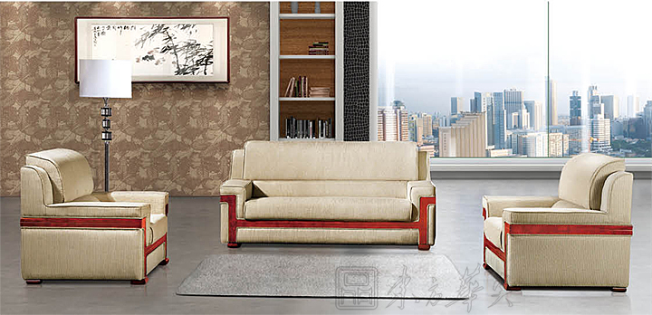 ※ 上图为接待沙发的使用场景展示图,布面扶手,实木骨骼架,S型弹簧与超力橡筋交叉连接永久固定在木架上,不易变型。
