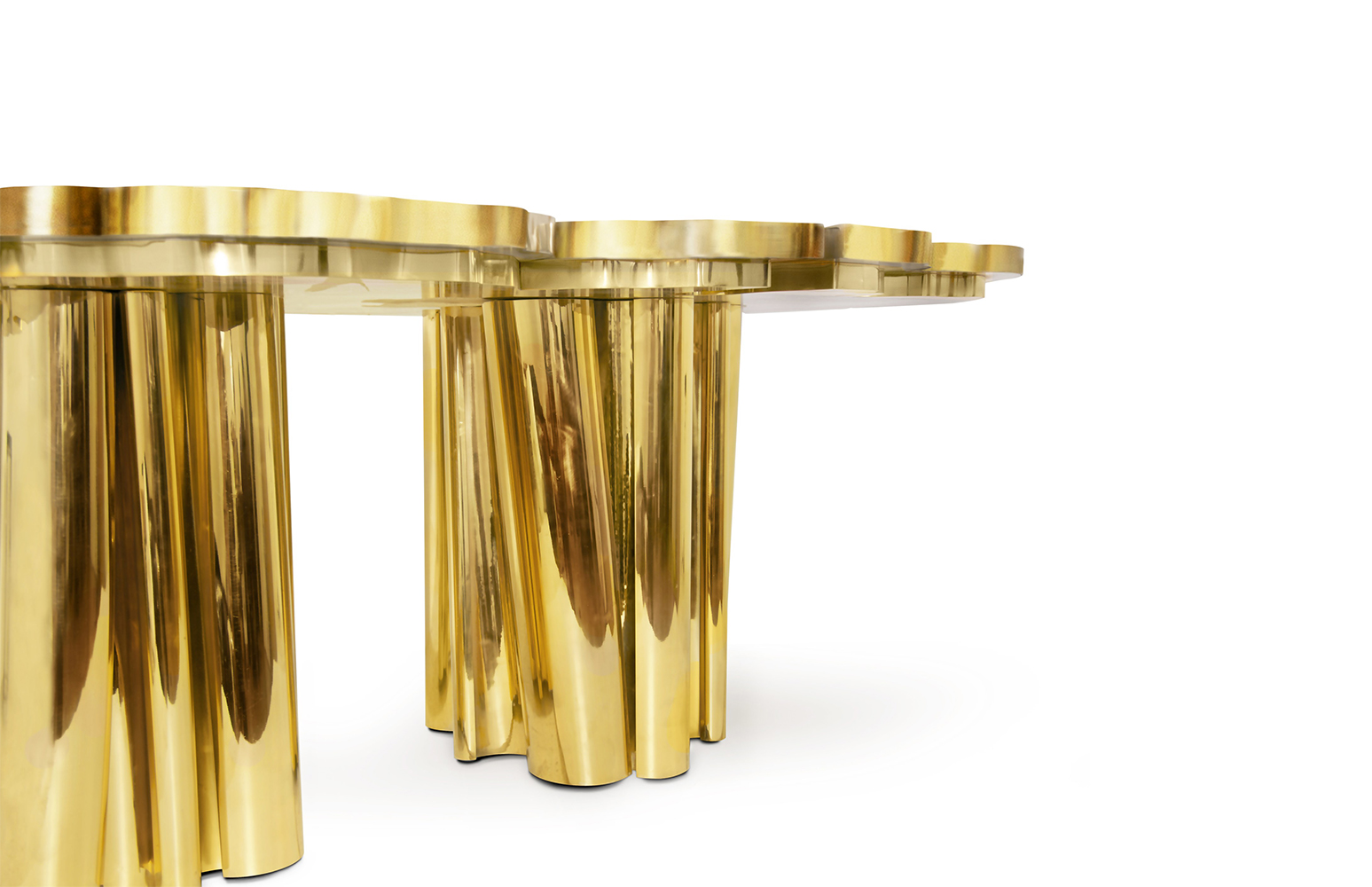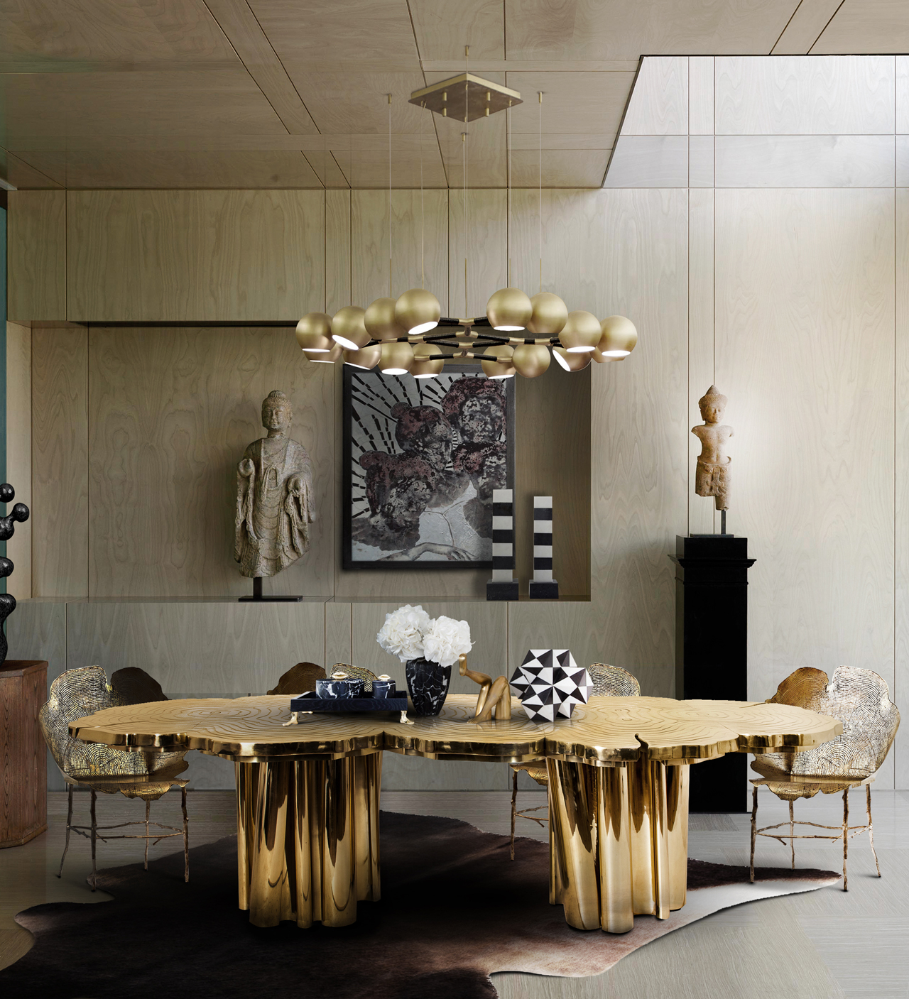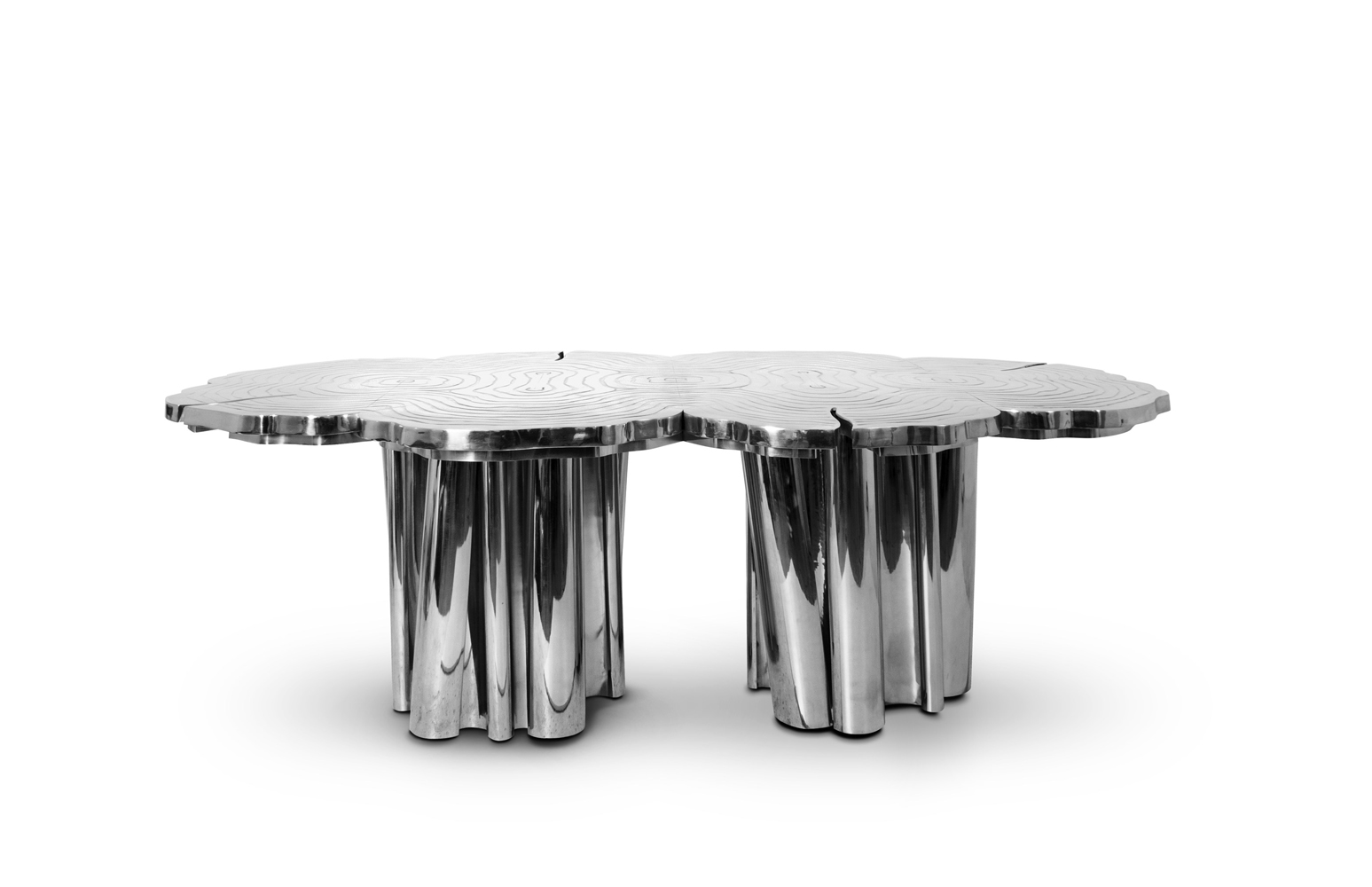 A fresh contemporary dining table and a shimmering statement from Boca do Lobo. Fortuna represents the materialization of luck and fortune, a symbol of the control of life and the definition of fate. An elegant composition of scaled brass tubes supporting the outlines of log rings in brass, related do the time life of a tree. Available in iron and copper
